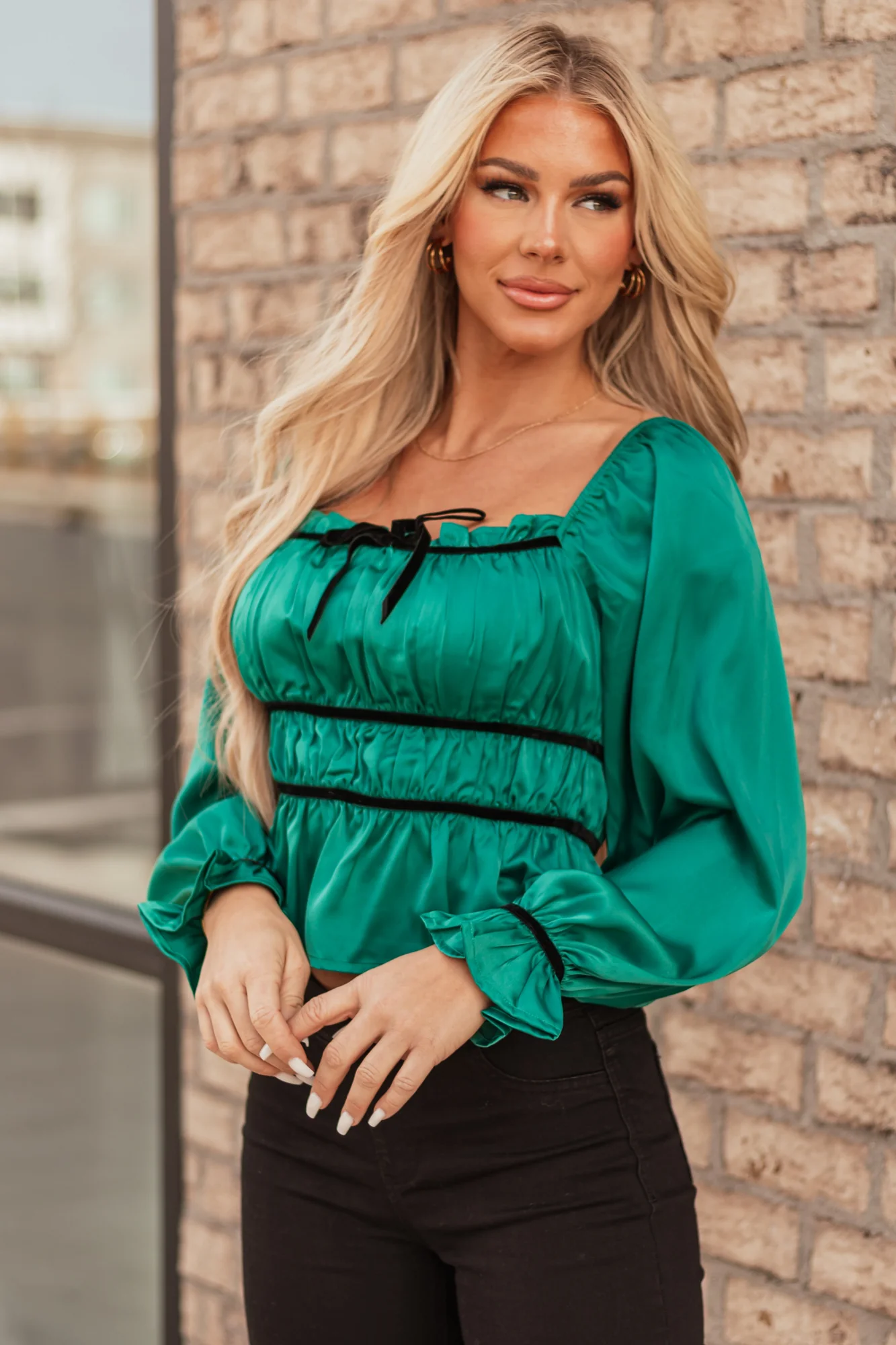 This stunning Pine Satin Peplum Sleeve Top is a must-have addition to your wardrobe. Crafted from non-stretchy satin with a delicate velvet trim, this top features a square elastic neckline and elastic waist for a flattering silhouette. The long bubble sleeves with elastic flared cuffs add a touch of elegance. Perfect for both casual and formal occasions. Hand wash cold for best care. Available in sizes S, M, and L.