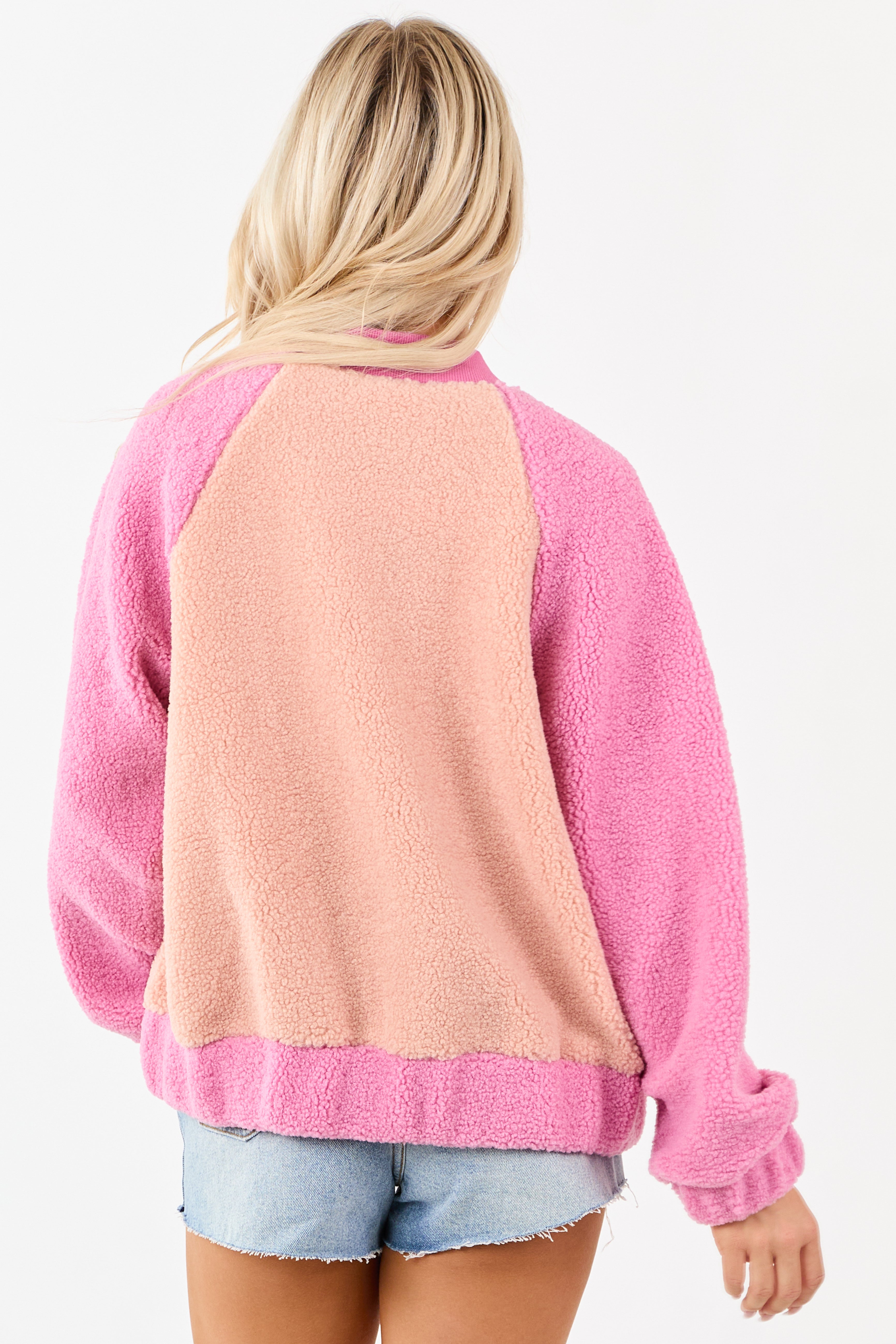 Stay stylish and cozy in this pink and white colorblock fleece jacket. With a bust size range from 44″ to 48″, raglan sleeves, elastic cuffs and hem, and convenient pockets for essentials. Made of 100% soft polyester for maximum comfort during the chilly season. Add a fun touch to your wardrobe with this lovely jacket.