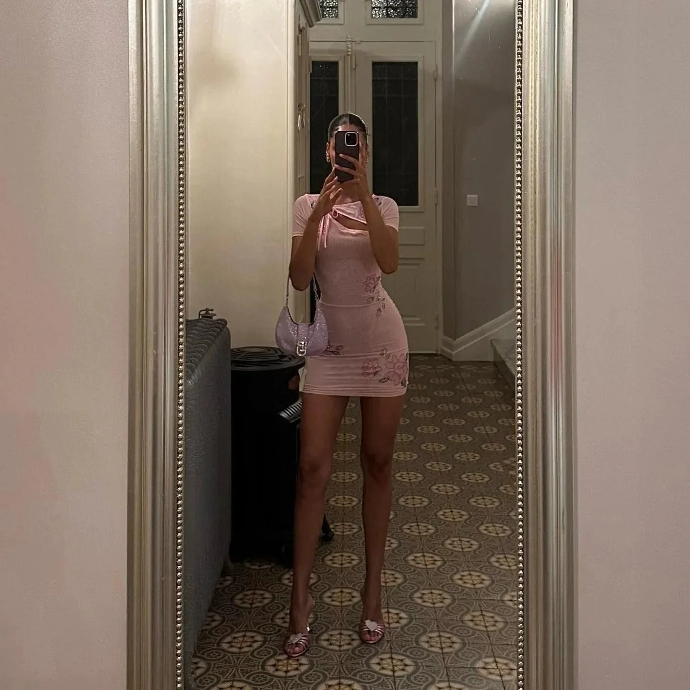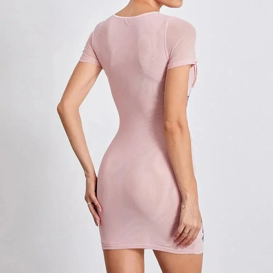 Elevate your wardrobe with this exquisite pink beaded mesh mini dress, adding a touch of elegance to any event. Crafted from sheer mesh fabric with intricate beadwork and embellished floral accents, this dress offers a stunning silhouette. Perfect for nights out or special occasions, it combines style and comfort seamlessly. Complete with a unique cut-out neckline and tie details, this dress exudes sophistication. Explore more fashion tips on Instagram @mermaid_way. Features include dry clean fabric, full lining, easy pull-on style, and a blend of 90% recycled nylon and 10% spandex for a perfect fit. Enjoy a complimentary size exchange if needed.