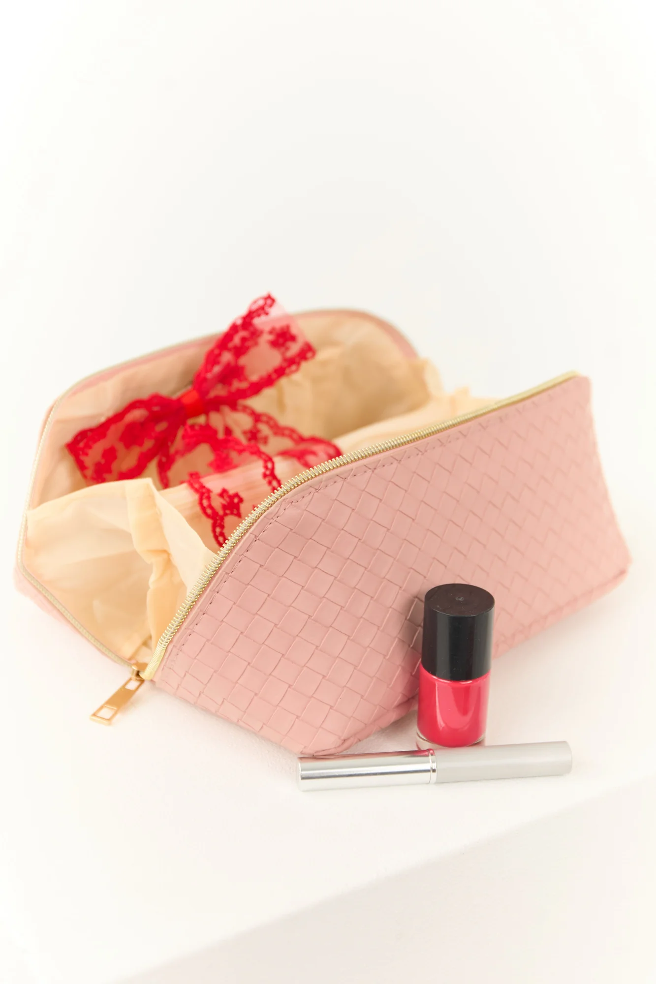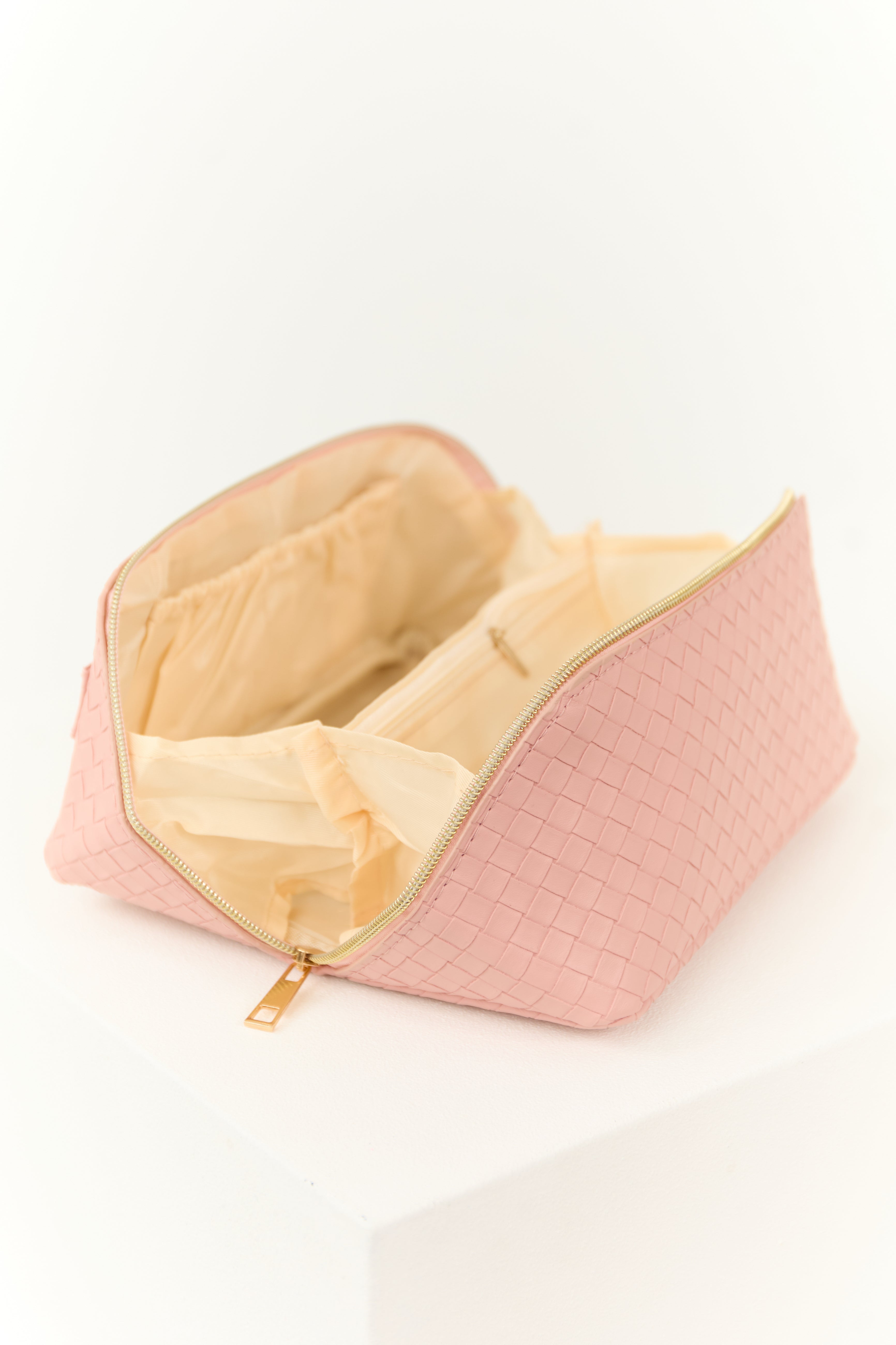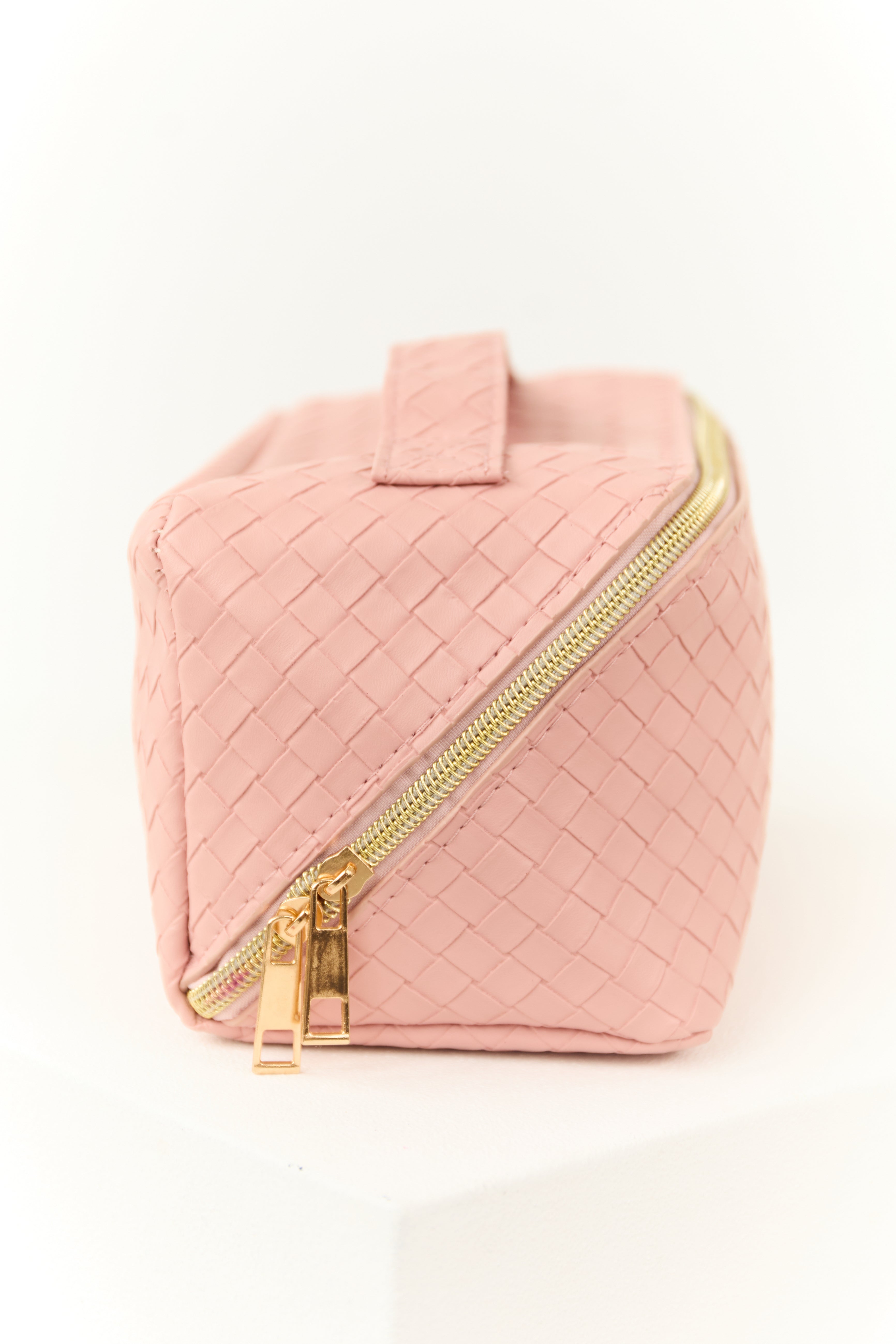 This pink braided faux leather makeup bag is the ultimate travel companion. Featuring a zipper opening, top handle, inside center zipper pocket, 3 inside side pockets, and buttercream lining. Keep your essentials organized in style. With a length of 9 inches, width of 5 inches, and height of 4 inches, this imported bag is perfect for daily use or on-the-go adventures.