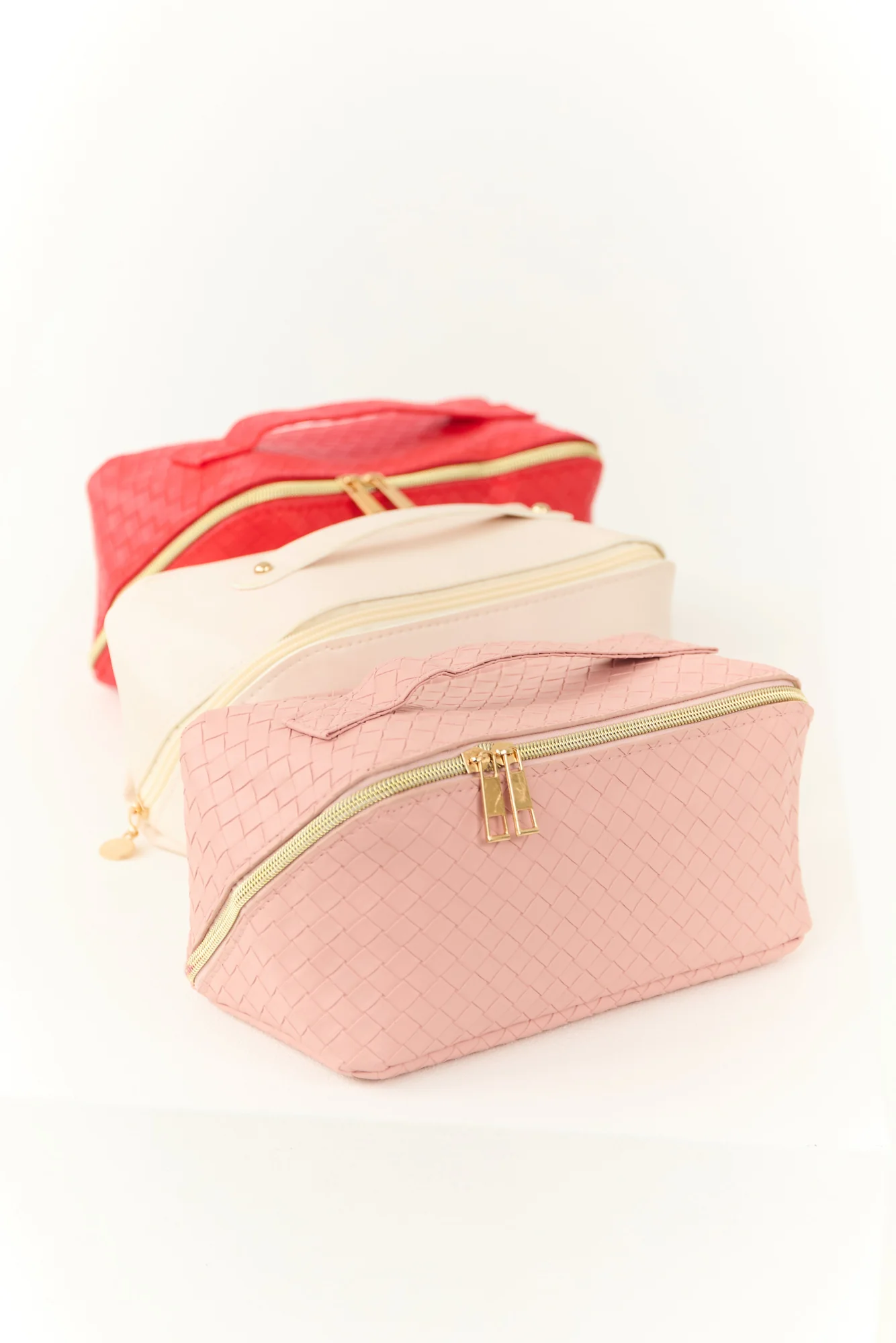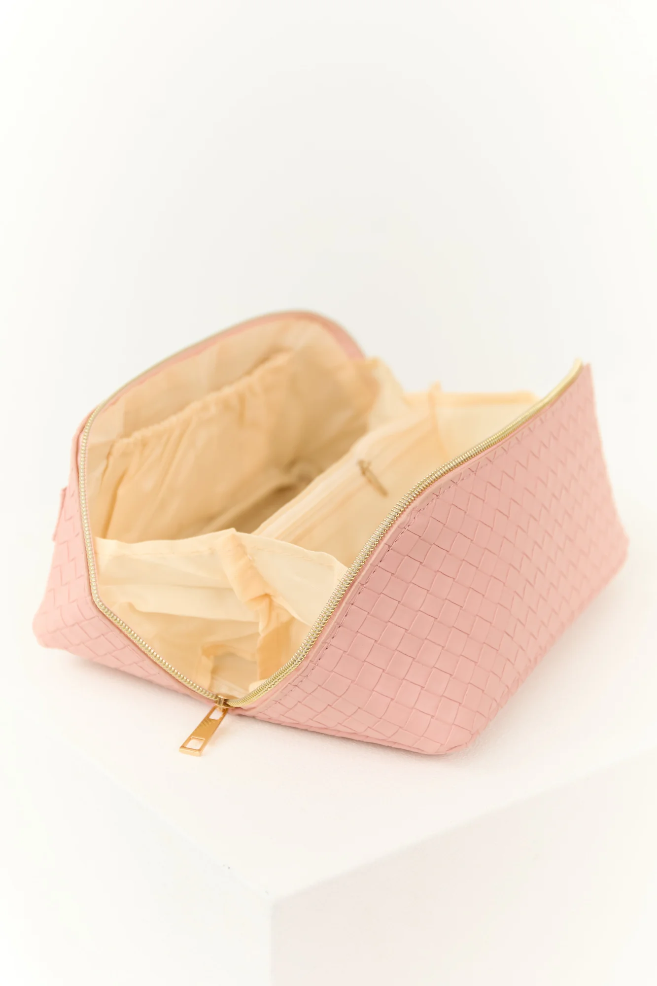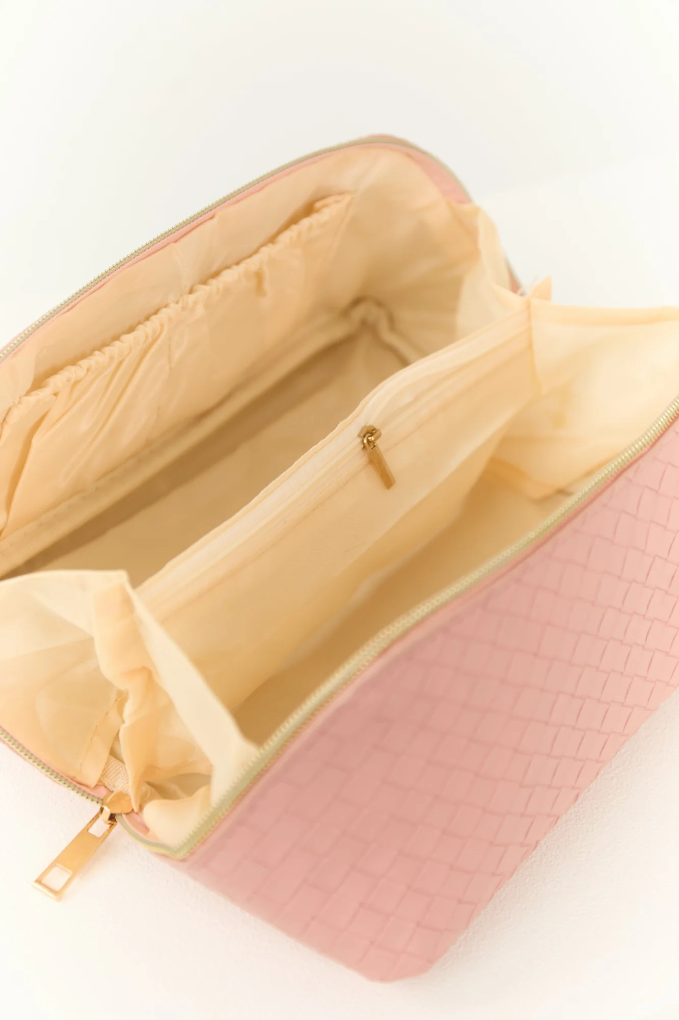 This pink braided faux leather makeup bag is the ultimate travel companion. Featuring a zipper opening, top handle, inside center zipper pocket, 3 inside side pockets, and buttercream lining. Keep your essentials organized in style. With a length of 9 inches, width of 5 inches, and height of 4 inches, this imported bag is perfect for daily use or on-the-go adventures.