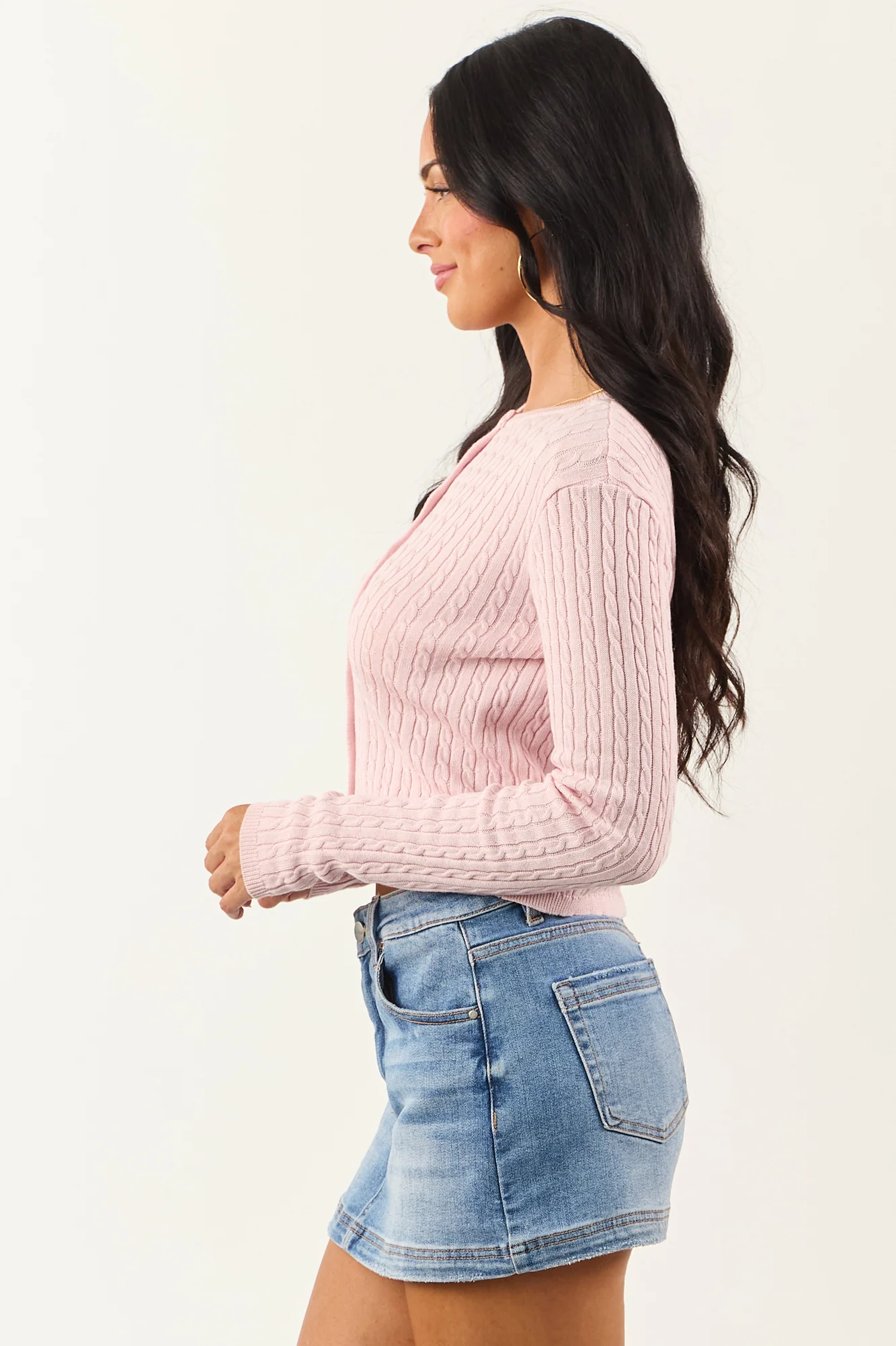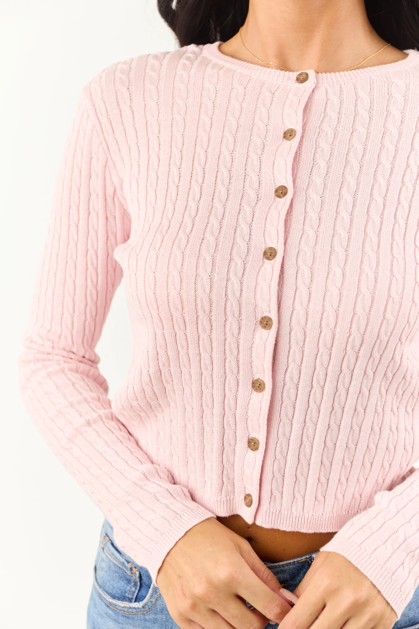 Stay cozy and stylish with our Pink Cable Knit Cardigan Sweater for women. Made with a soft blend of 55% Cotton and 45% Acrylic, this cardigan features a classic button-down front, ribbed trim, and a comfortable stretchy knit texture, perfect for layering in fall. Available in sizes S, M, and L with bust measurements of 36, 39, and 42, and various sleeve lengths to suit your style. Elevate your wardrobe with this versatile piece. Imported.