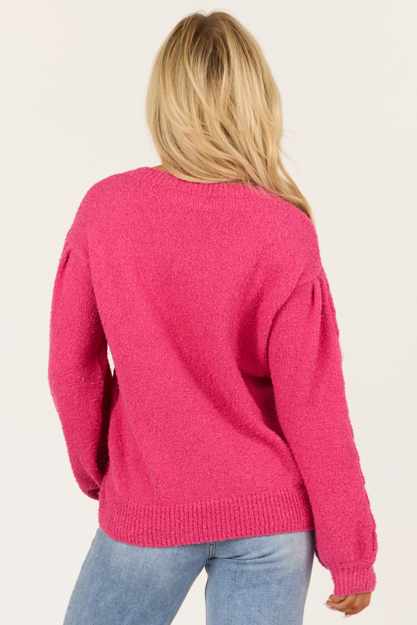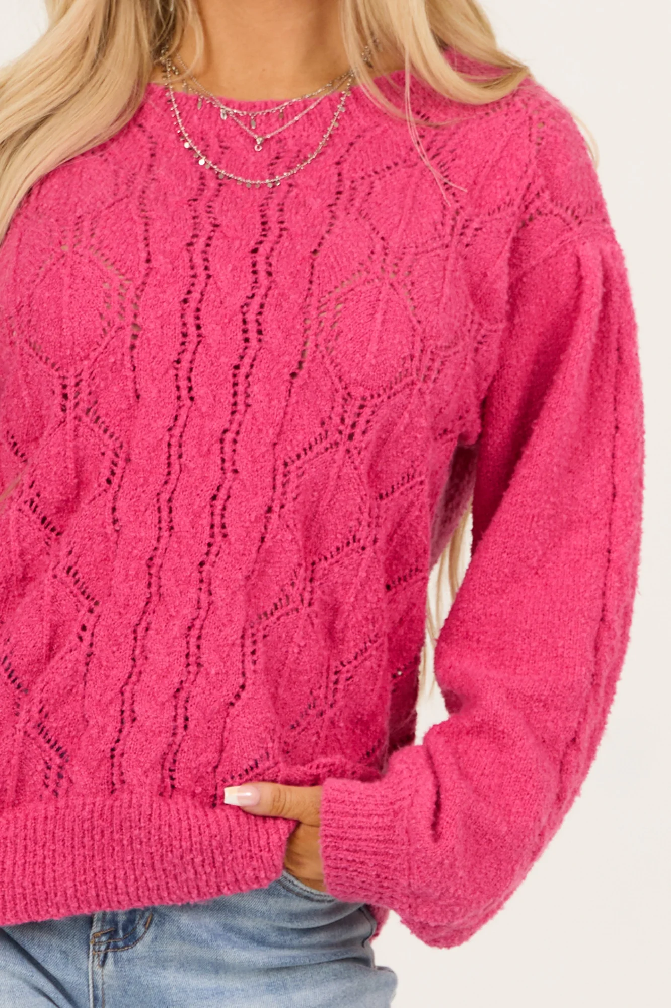 Stay cozy and stylish with this Pink Cable Knit Crew Neck Sweater made of stretchy and soft pointelle knit. Featuring ribbed banded trim, drop shoulder design, and a comfortable fit. Available in sizes S, M, and L. For best care, dry clean only to maintain color vibrancy. Perfect for casual outings or lounging at home.