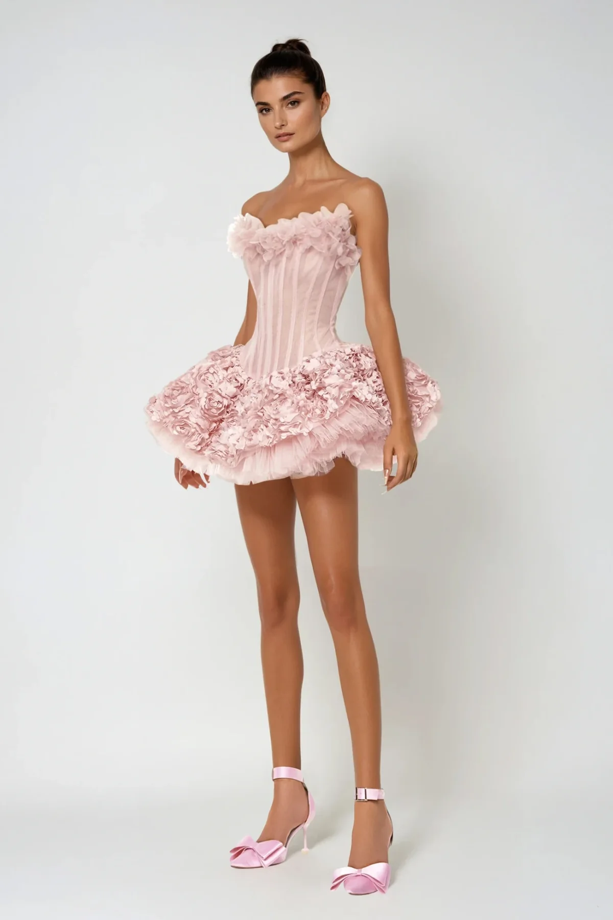 Elevate your style with the Pink Corset Flower Mini Dress . This dress features delicate floral detailing, a structured corset silhouette, and playful puffed sleeves. Ideal for special occasions, the mini length adds a contemporary edge while enhancing your shape. The non-stretch design ensures a flattering fit. Machine wash gently. Please note, the color may vary due to lighting. Add a touch of romance and sophistication to your wardrobe with this versatile dress. Crafted for elegance with a youthful twist. Order now!