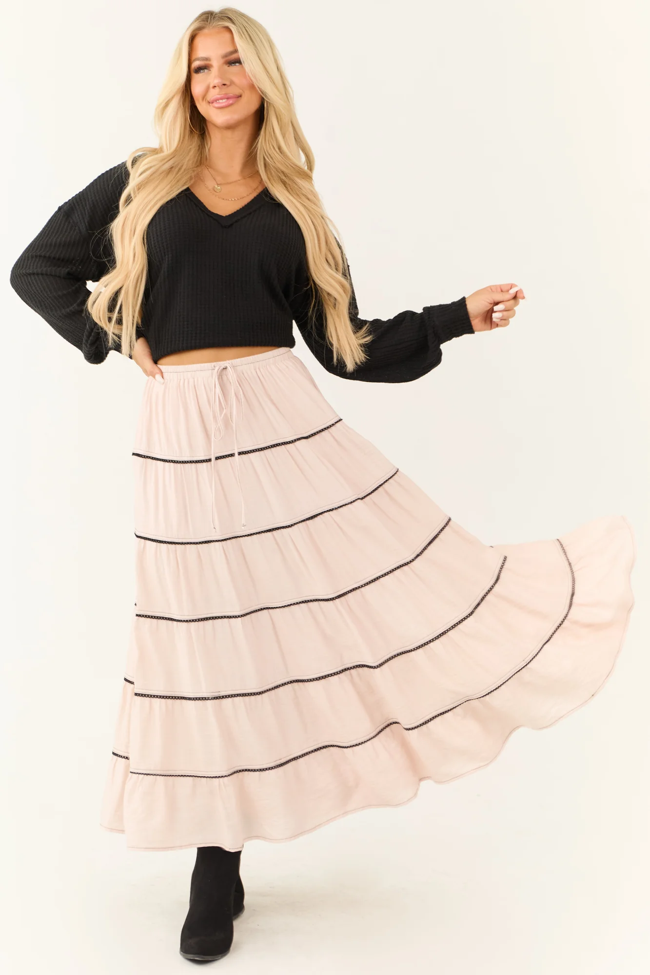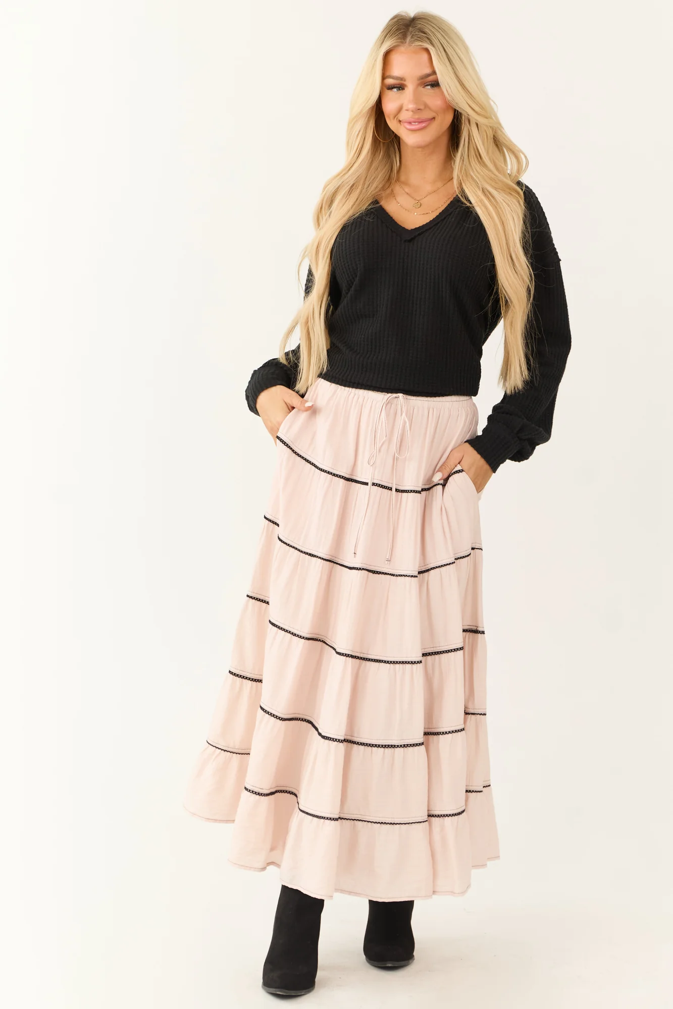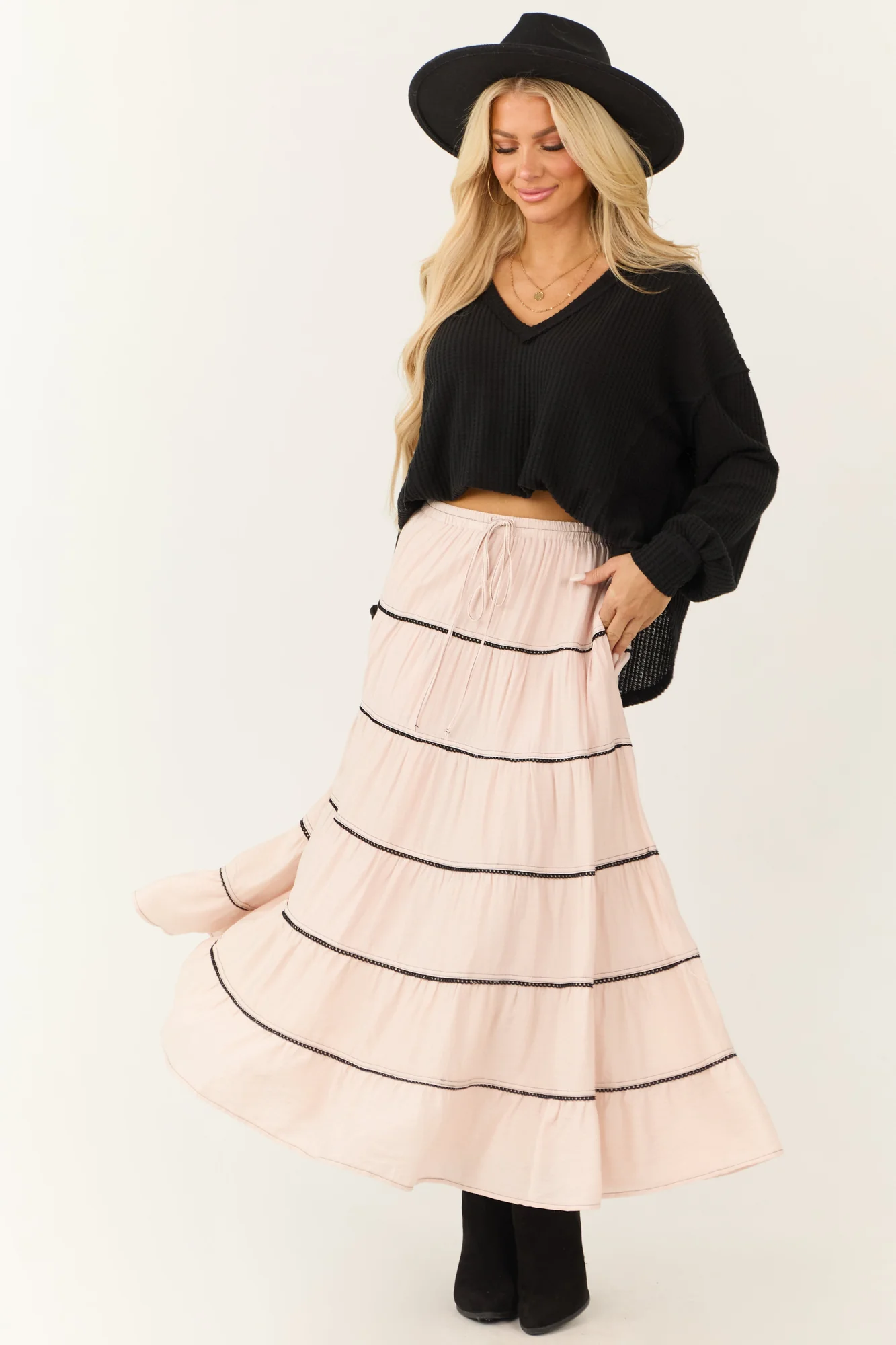 Elevate your style with our Pink Crochet Lace Maxi Skirt featuring a trendy tie waist detail. Crafted from a non-stretchy woven blend with crochet lace stripes in black, this skirt boasts hidden side seam pockets and an elastic banded waistband for comfort. Perfect for any occasion, the lined skirt is made of quality materials like Rayon, Cotton, Nylon, and Linen. Care Instructions: Hand wash with cold water, line dry, iron low. Model is wearing a size Small, measuring 57″ tall with a bust of 34″ and waist of 26″.