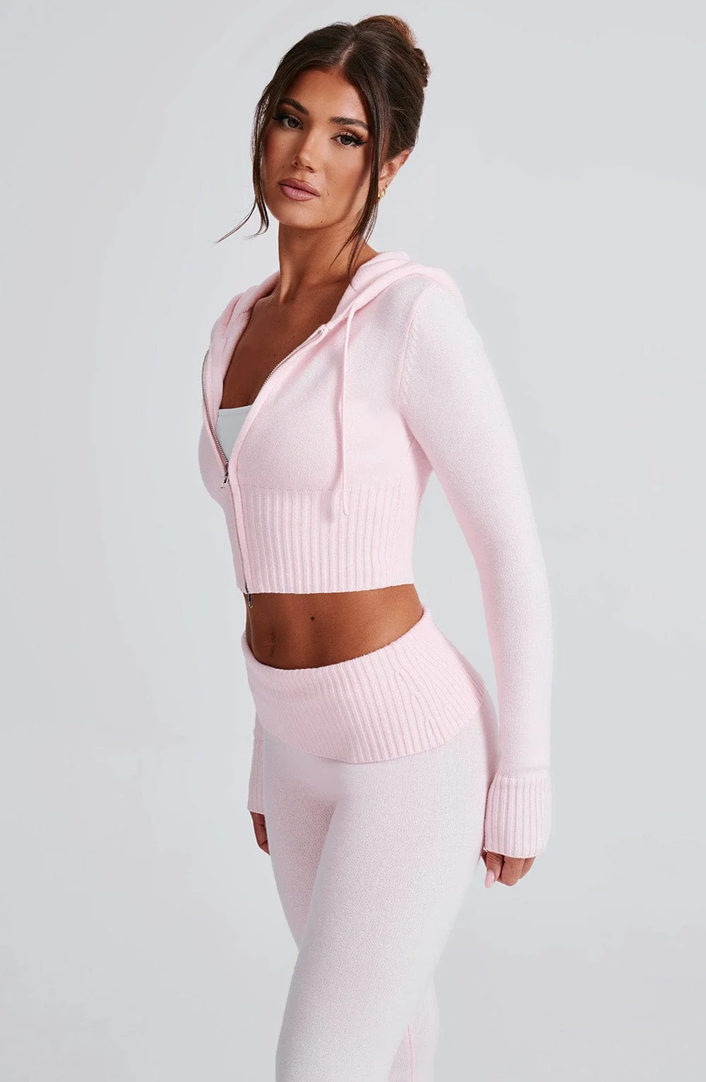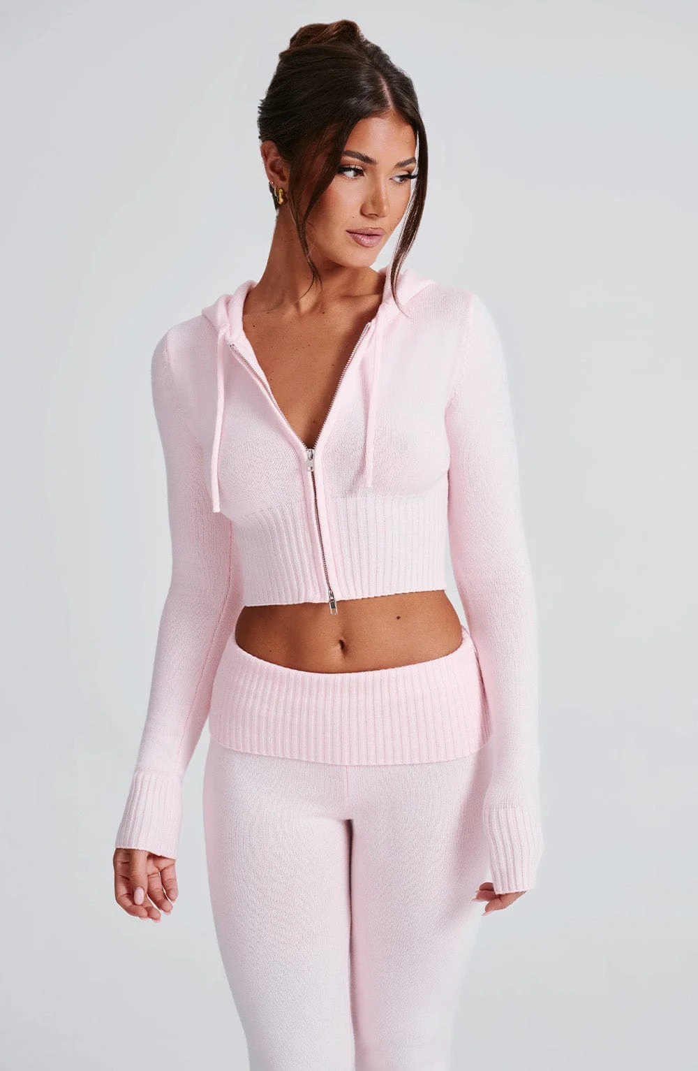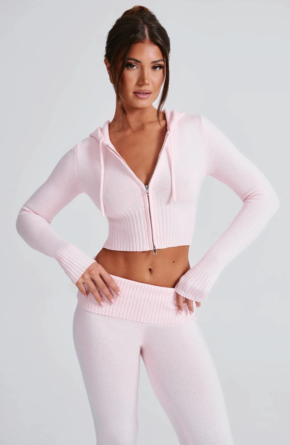 Elevate your casual style with the Pink Cropped Knit Hoodie. This stylish hoodie boasts a fitted silhouette, 2-way zipper, and drawstring for a customized fit. Pair it with matching knit pants for a complete look. The pink hoodie features a cropped length, unlined design, and fitted sleeves with wide rib cuffs. Stay on-trend with the exposed front zipper and front drawstring detail. Perfect for everyday wear in autumn and winter. Model is wearing size XS. Available in sizes XS, S, M, L, XL, XXL.