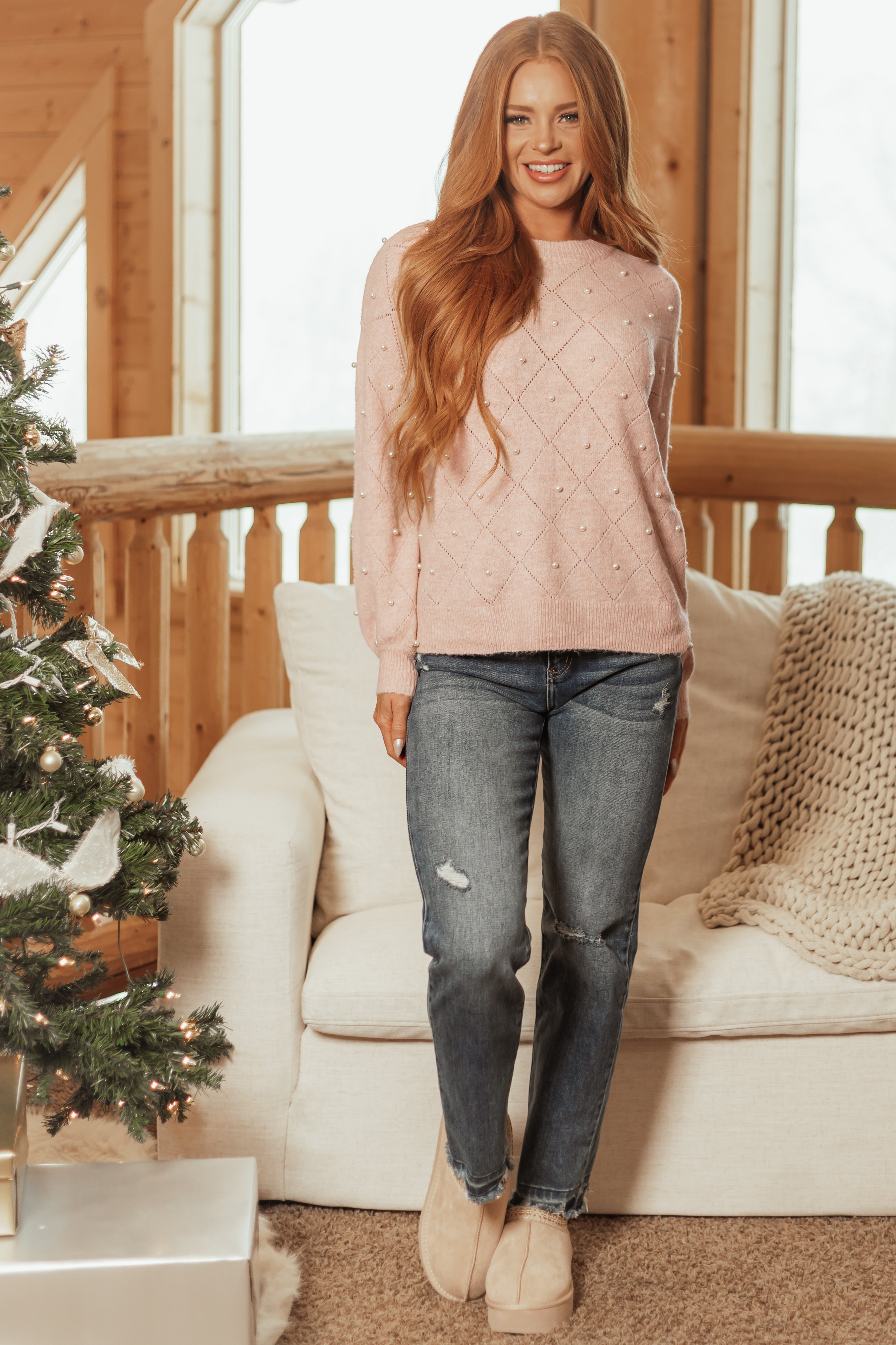 Stay cozy and stylish in this Pink Diamond Pointelle Knit Sweater. Available in sizes S, M, L, and XL, this sweater features a stretchy ribbed knit with geometric cut-out details and pearl embellishments. The banded trim adds a chic touch. Made of 45% Acrylic, 37% Polyester, 15% Nylon, and 3% Spandex, this sweater is perfect for a casual or dressy look. Hand wash cold and lay flat to dry. Model is wearing size Small.