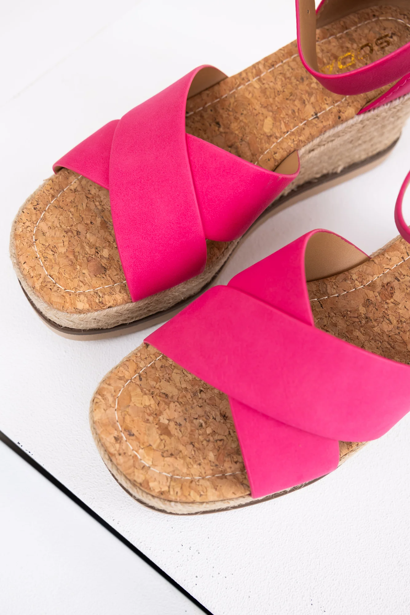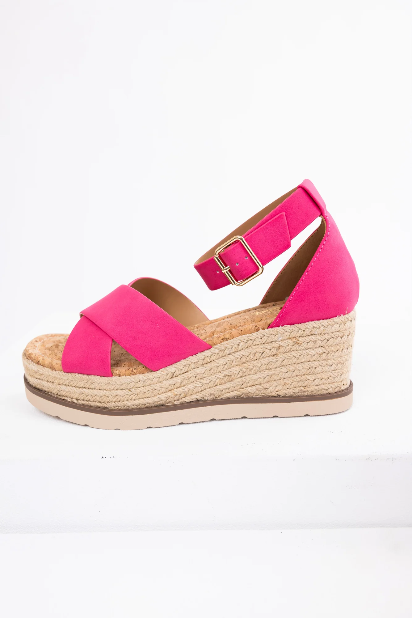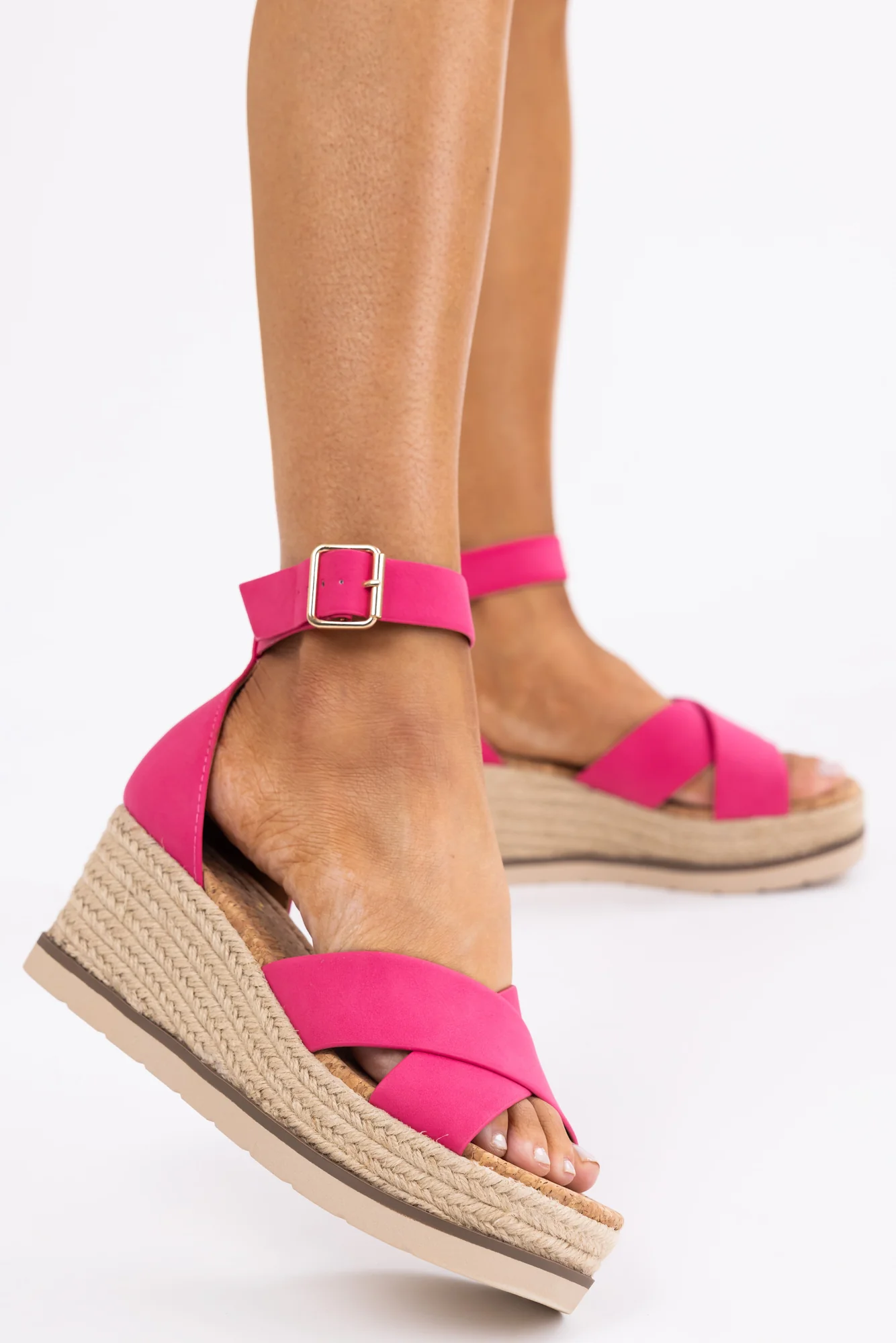 Step into style with these hot pink espadrille platform wedge sandals. Crafted from nubuck faux leather, they feature cross straps, an open toe, cork insole, adjustable buckle ankle strap, and a wedge heel for a chic look. The 1.25″ platform adds height while ensuring comfort. Perfect for daytime wear in spring and summer, these imported sandals are a must-have for your collection. Available in sizes 5.5 to 11.