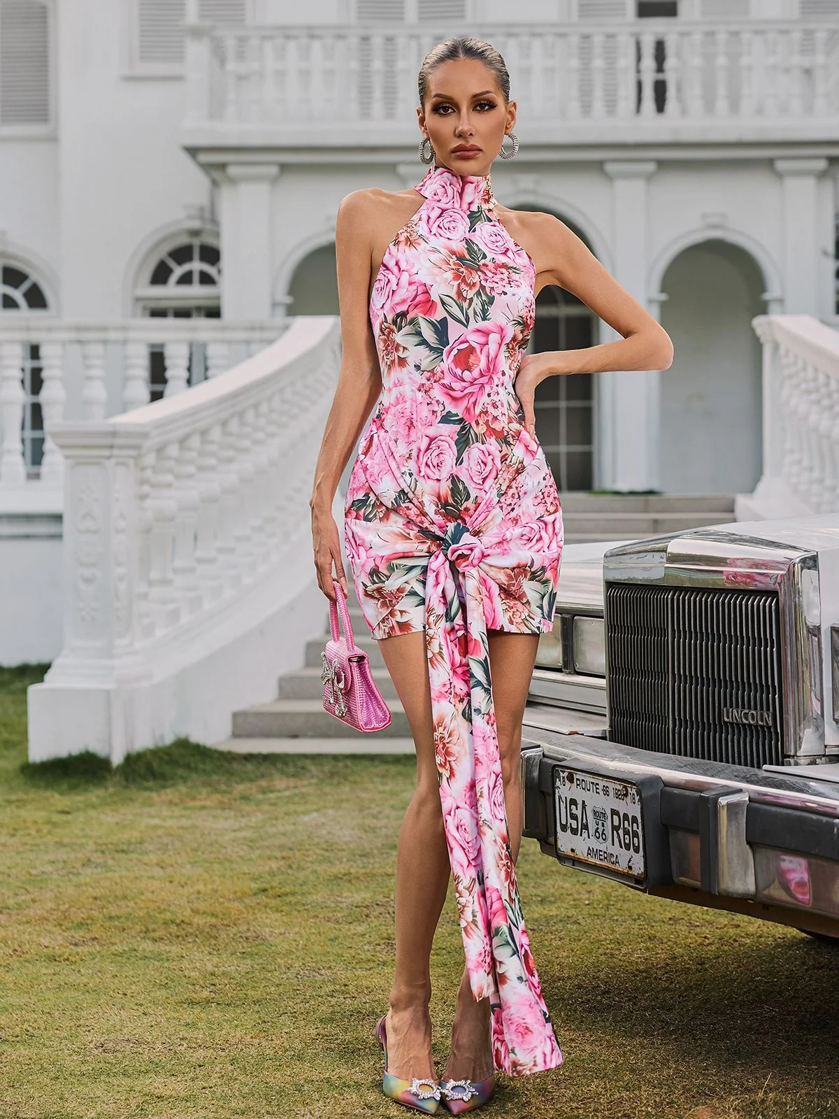 Elevate your style with our Pink Floral Halterneck Twist Mini Dress. This stunning dress features a halterneck design for added elegance and a unique twisted detail. Suitable for any occasion, it is designed to make you stand out while feeling confident and beautiful. Crafted from 100% Polyester with a slight stretch for comfort. Features an invisible zipper at the back for easy wear. Available in sizes S, M, and L. Embrace the floral charm and make a statement effortlessly.