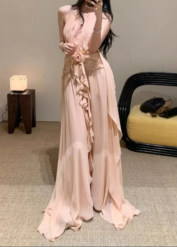 Experience ultimate luxury with our Pink Floral Ruffle Halter Maxi Dress. The delicate floral print and ruffle details exude elegance, making you feel like a true fashionista. This exclusive dress is perfect for a romantic dinner or a day at the beach. Crafted from Chiffon, it provides comfort and style. Whether its gentle machine wash or size suitability, this dress meets your expectations flawlessly. Embrace sophistication with this stunning outfit.