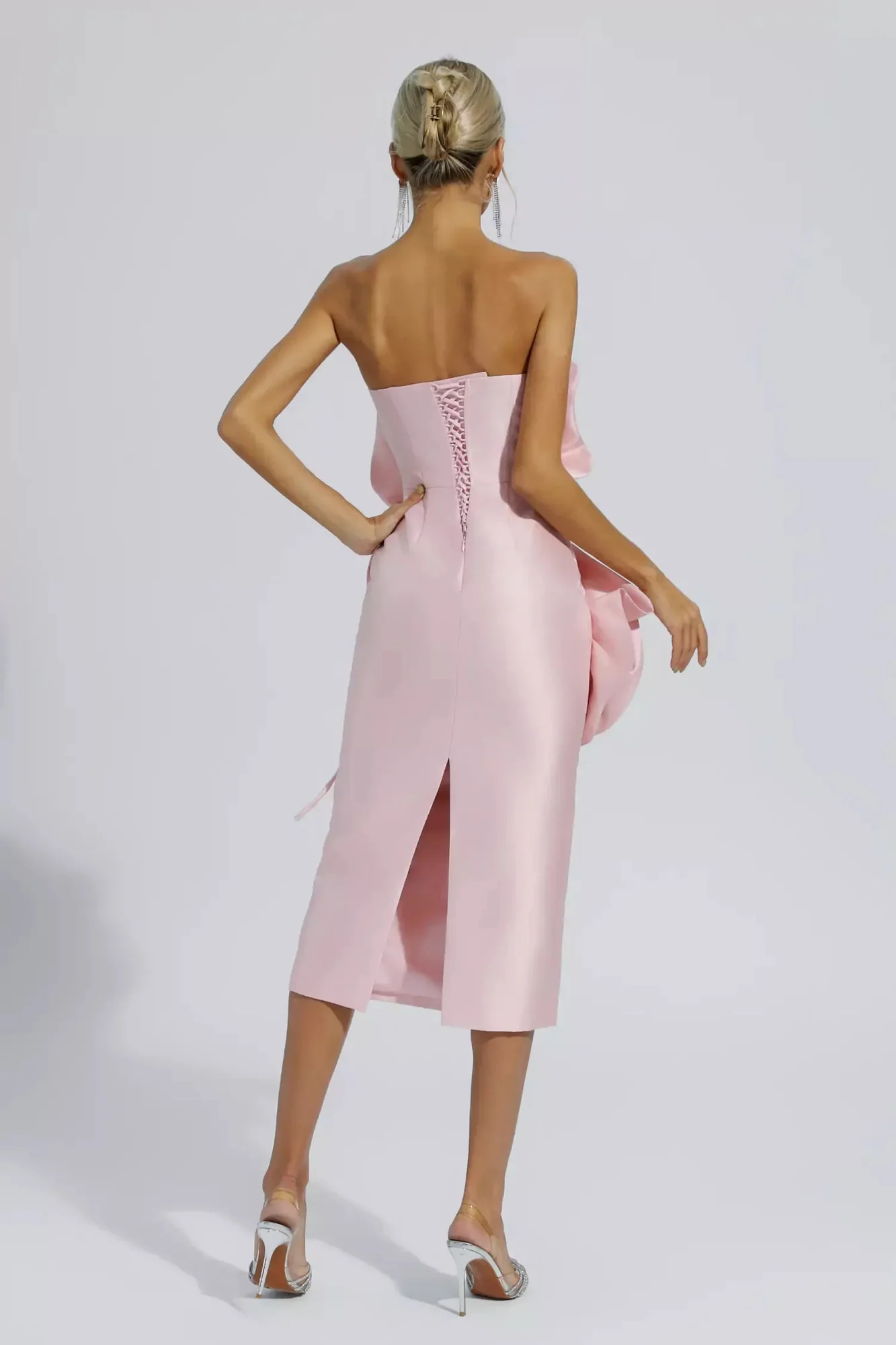 Elevate your femininity with our stunning Pink Floral Strapless Midi Dress. This romantic dress in pink features a crisp strapless neckline and a flattering mini silhouette top adorned with intricate 3D floral detailing to captivate all attention. Crafted from high-quality polyester, this dress is approx. 96cm long and should be gently dry cleaned for optimal care. Complete your look with heels for a chic and elegant ensemble. Please consult our size chart for a perfect fit.