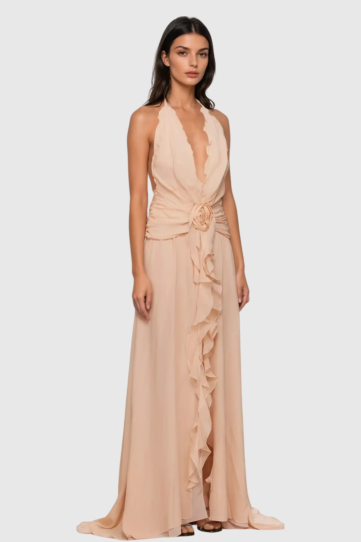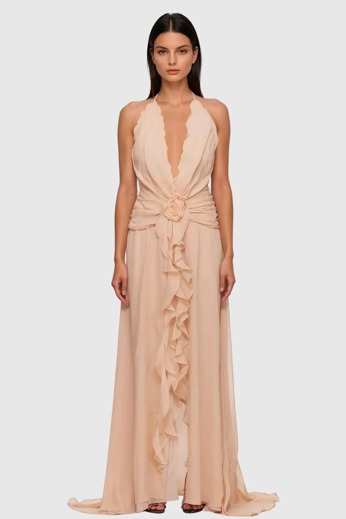 Elevate your fashion style with the Pink Flower Ruffle Halter Neck Mesh Maxi Dress. This stunning dress in pink hue features an intricate flower ruffle design, creating a feminine and elegant look. The halter neck and mesh fabric offer comfort and breathability, making it suitable for any occasion. Made of 50% Polyester and 50% Cotton with a slight stretch factor, this dress is easy to clean with a gentle machine wash. Note: Color may vary due to lighting on images.