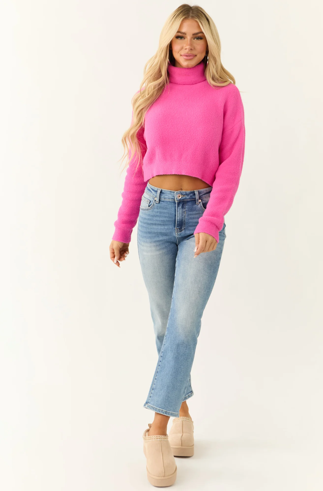Stay warm and stylish in this Pink Fuzzy Cropped Turtleneck Sweater! Available in sizes S, M, and L with sleeve lengths of 21″, 22″, and 23″ respectively. The wide fit and stretchy knit offer comfort, while the ribbed trim and drop shoulder add a trendy touch. With long sleeves for extra coziness, this sweater is a must-have for your fall wardrobe. Hand wash cold for best care. Model is 5’7″ tall, wearing a size Small.