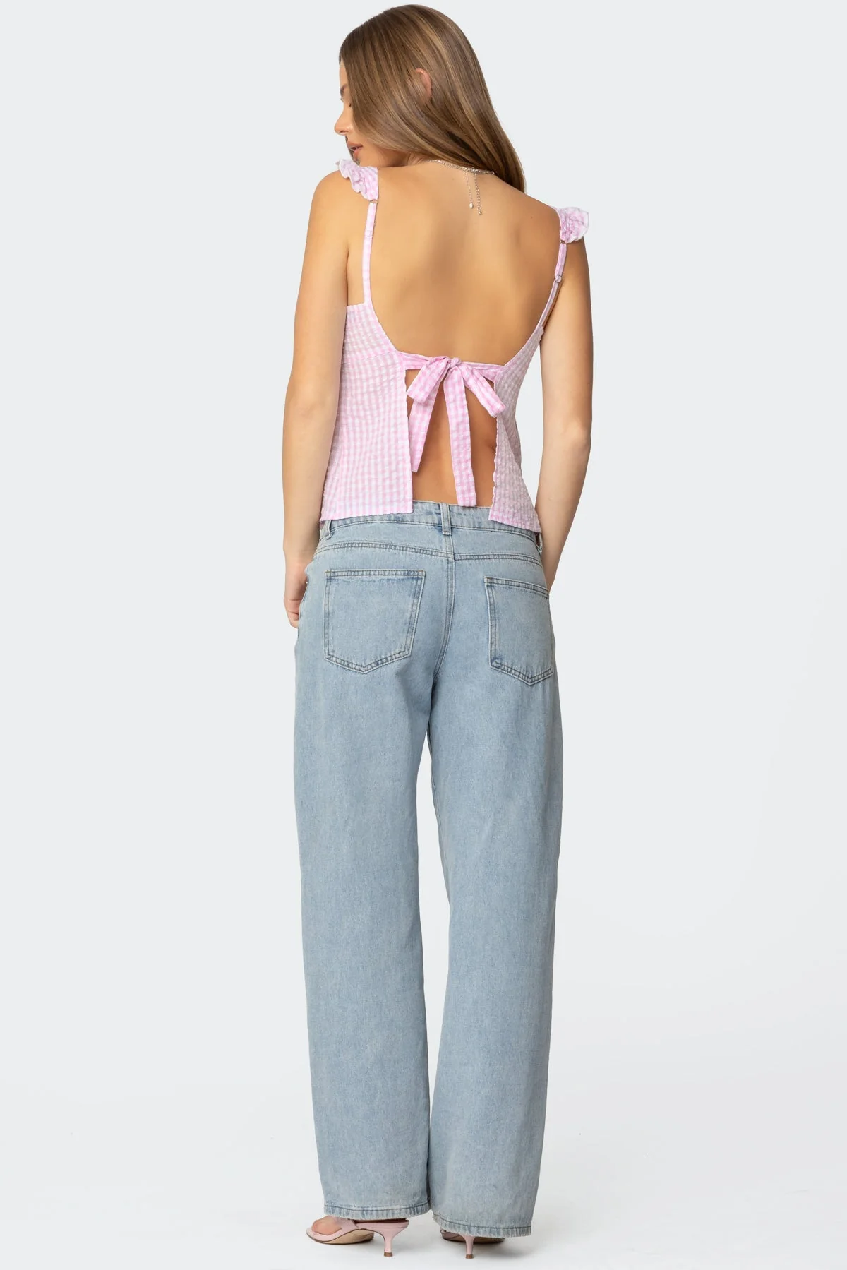 This Pink Gingham Sleeveless Top features an open back with a charming ruffle strap detailing and a convenient tie closure. Made of a blend of Polyester and Cotton, this top is both stylish and comfortable. The model wears size S, standing at 59″ tall. Care instructions: Machine wash at a maximum of 30ºC with similar colors, do not bleach, do not tumble dry, iron at a maximum of 110ºC, and do not dry clean. Elevate your wardrobe with this trendy top today!