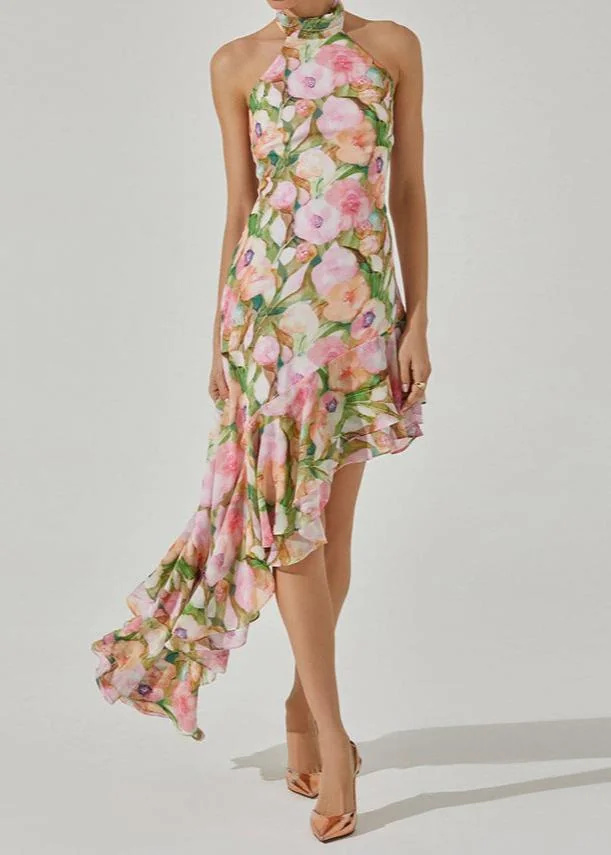 Elevate your style with our chic Pink Green Asymmetric Floral Halter Midi Dress. The unique floral halter design and elegant asymmetrical hemline exude sophistication. Crafted from premium materials, this dress offers unparalleled comfort and style for any occasion. Featuring a halter neck silhouette with an open back, ruffle detail hemline, and a trendy abstract floral print. Complete with a concealed back zipper closure for a seamless look. Dry clean only. Self: 100% Polyester / Lining: 100% Polyester. *Color may vary in images. Refer to size chart for accurate sizing – true to size fit.