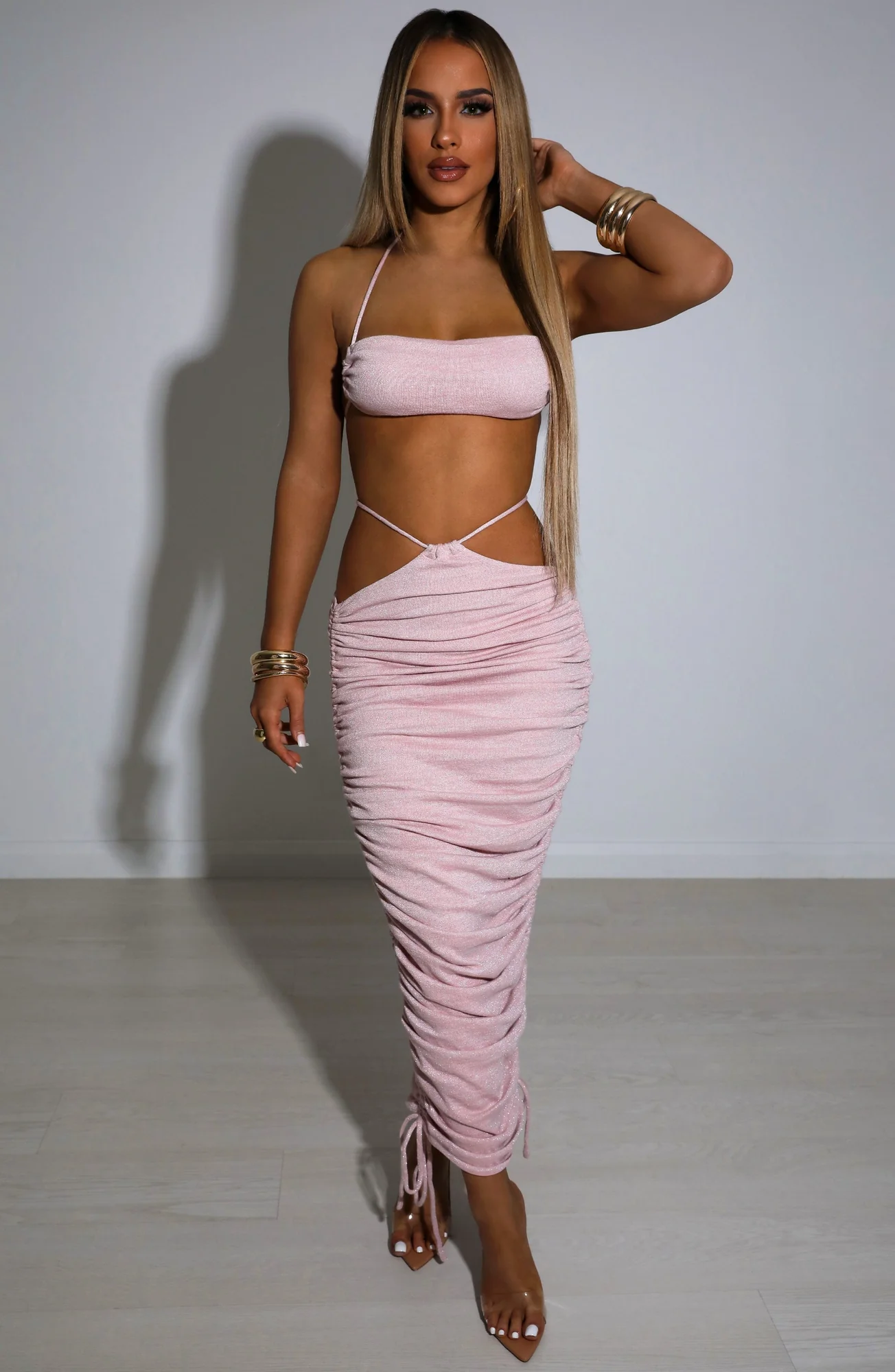 This baby pink sparkle maxi skirt is crafted from a high-quality knit blend that glistens subtly. It features a functional tie-up waist with adjustable tunnel ruching on both sides for customizable length. Pair with the coordinatingValencia Topto complete your look. Model in Size XS. Height: 160cm. Cup size: C.