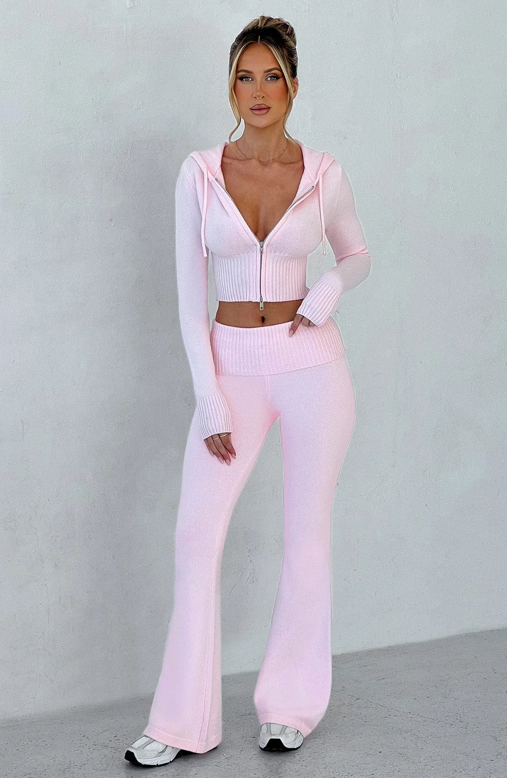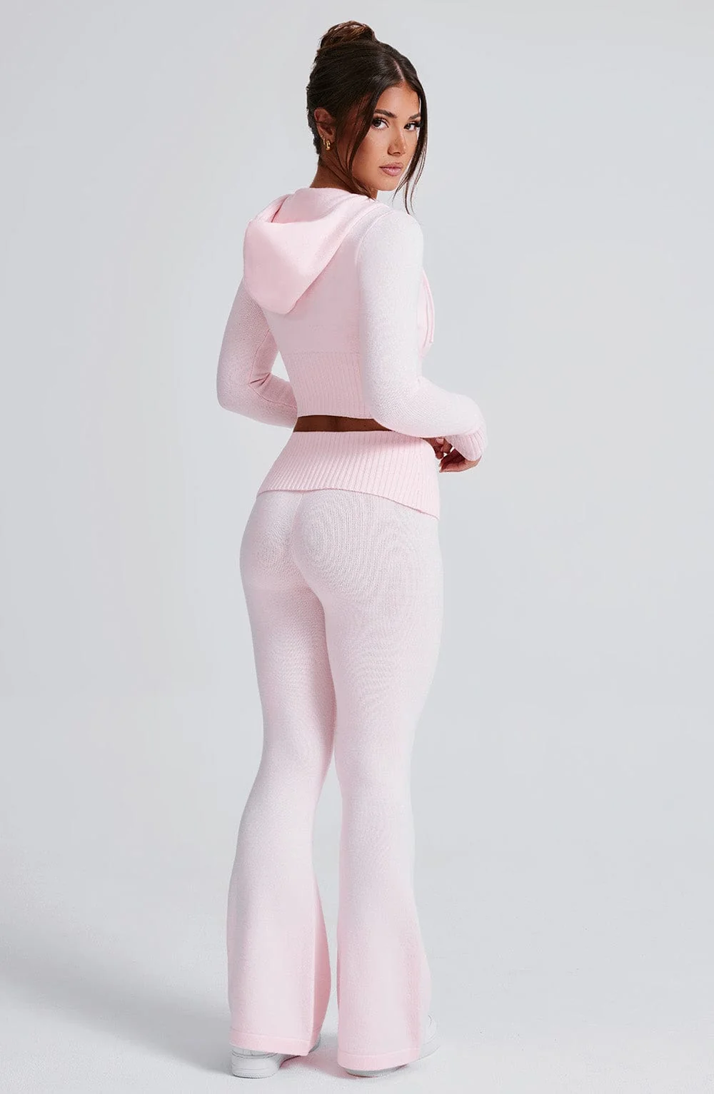 Upgrade your wardrobe with our Pink Knit Flare Pants, a versatile must-have boasting a flattering fit and flare silhouette. Designed with a wide rib waistband for extra style, pair it perfectly with the matching Portia Knit Hoodie. This regular-length comfort is unlined and features a wide 2×2 rib waistband, fold-over waistband detail, and internal elastic for the perfect fit. Crafted for style and comfort, these pants are sure to elevate your everyday look. The model wears an XS. Available in L, XL, XXL, S, M, and XS sizes.