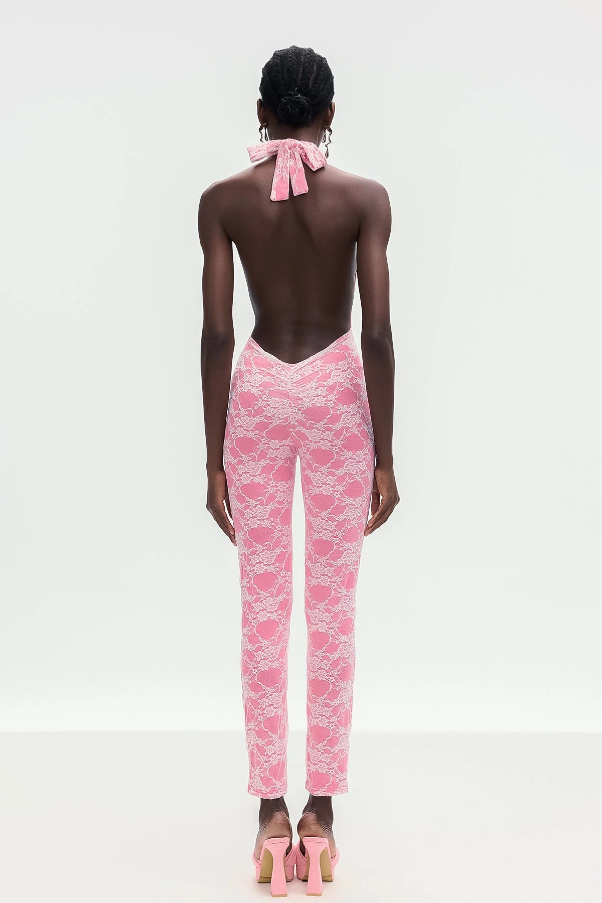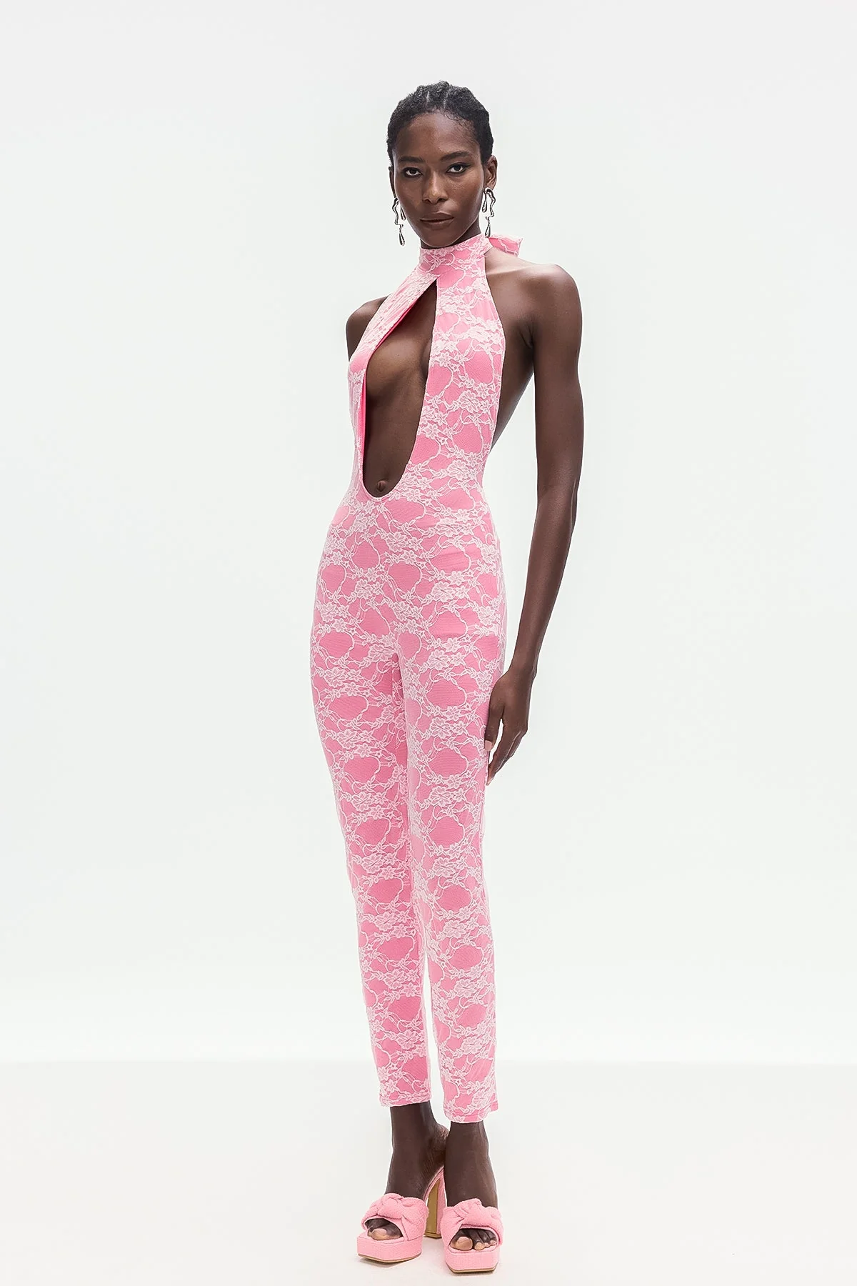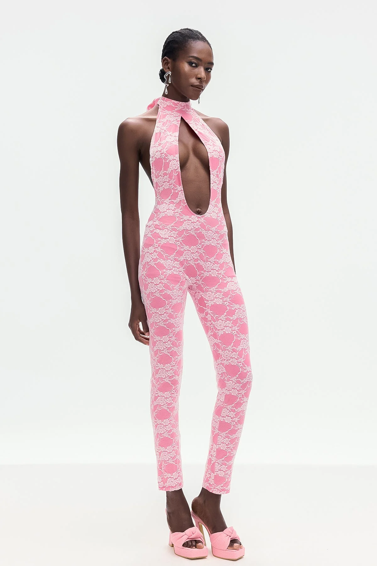 Indulge in the sophisticated charm of the Pink Lace Cutout Jumpsuit. Intricate lace details and strategic cutouts create a modern silhouette that enhances your figure. Perfect for upscale events and fashionable evenings, this jumpsuit exudes elegance with a contemporary edge. Expertly crafted for a flattering fit and refined craftsmanship. Experience a slight stretch for comfort. Clean with a gentle machine wash. Please note, color may vary due to image lighting. Elevate your style effortlessly!