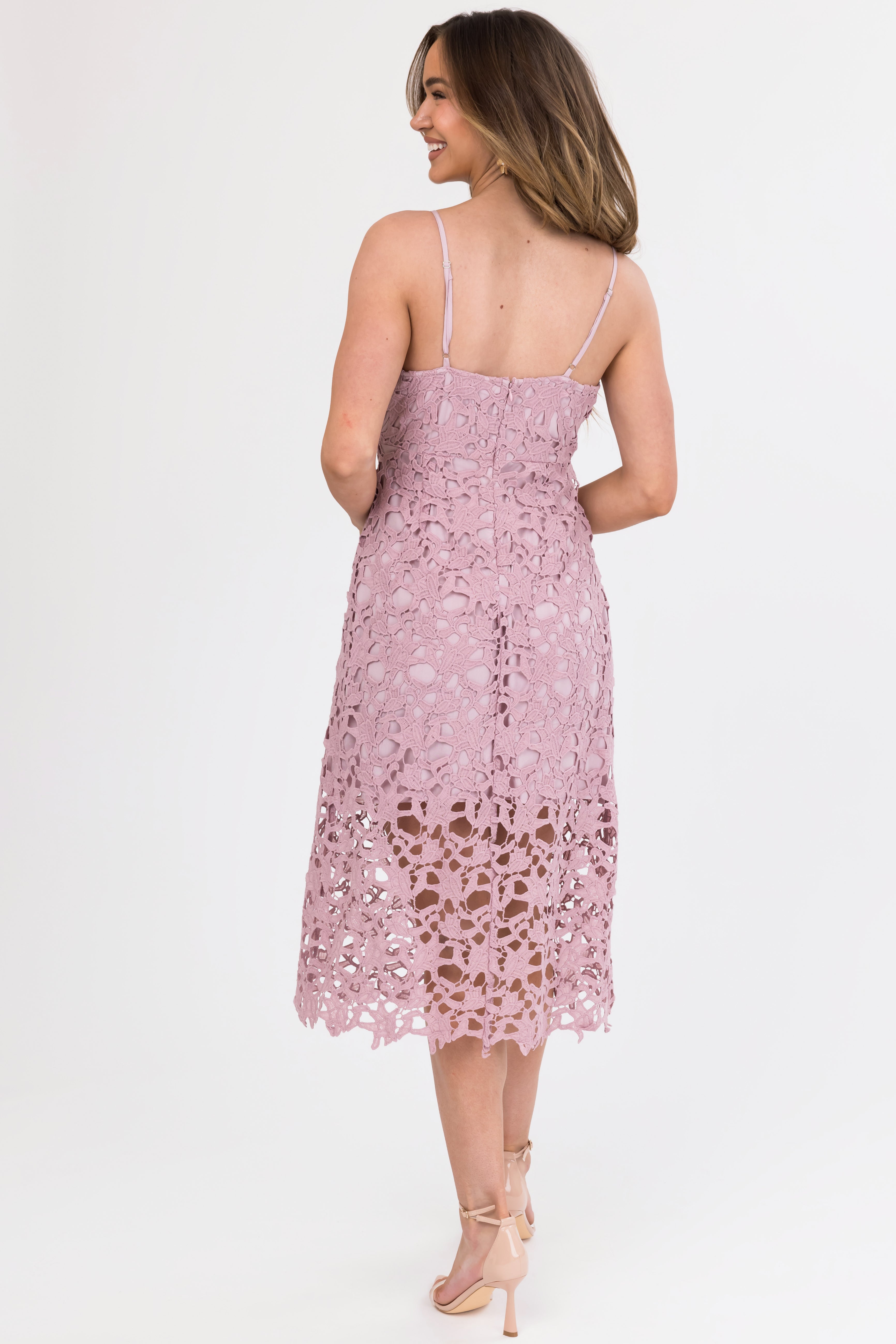 This lovely Pink Lace Sleeveless Midi Dress is a perfect choice for various occasions. It features adjustable spaghetti straps, a V neck, and a back zipper with hook and eye closure. Made of 100% Polyester, this non-stretchy woven dress is lined for a comfortable fit. Hand wash cold, line dry. Available in Small (2-4), Medium (6-8), and Large (10-12).