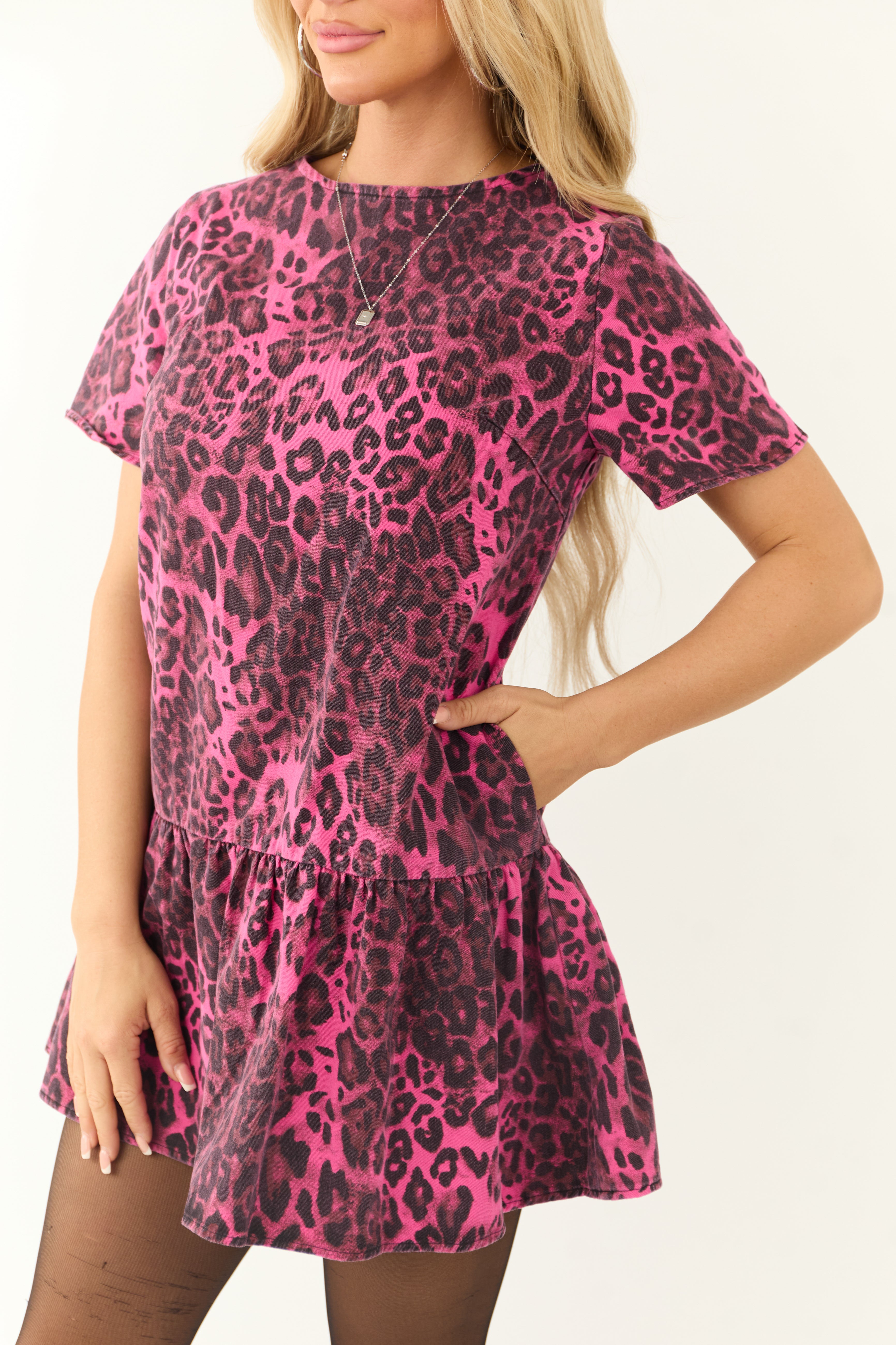 Embrace your wild side with our Pink Leopard Print Denim Drop Waist Short Dress. Available in sizes S, M, and L, with bust sizes ranging from 38″ to 42″ and lengths from 33″ to 35″. This shift-fit dress features a round high-low neckline, short sleeves, and a pleated skirt for a trendy look. Made of 100% cotton denim, this non-stretchy dress with dart seams and an upper back adjustable tie exudes style and comfort. The leopard print in black adds a touch of sophistication. Perfect for a date night or daytime outing.