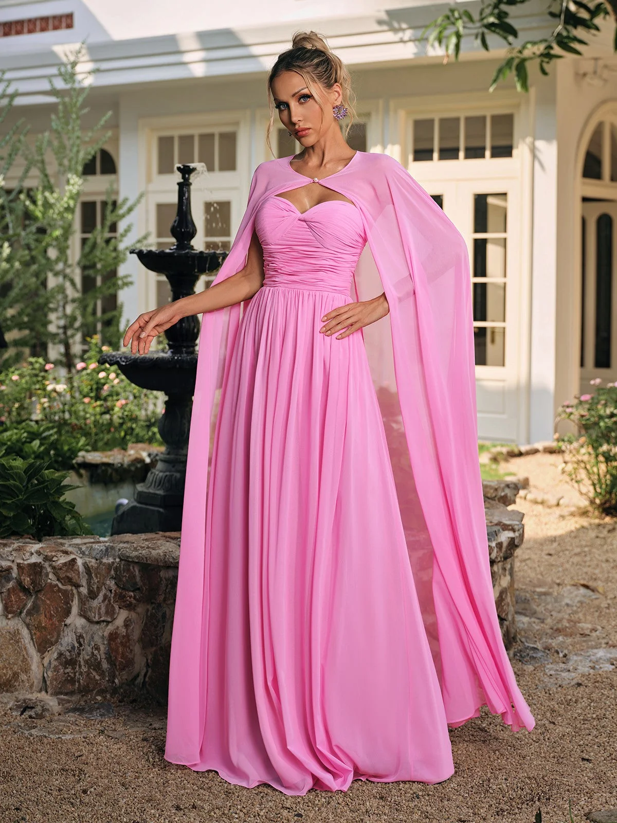 Make a striking entrance with our Pink Mesh Cape and Strapless Top Set. This ensemble combines a ruched strapless top with a flowing mesh cape, exuding modern style and dramatic flair. The lightweight mesh material provides movement and elegance, ensuring you stand out at any event. Offering a perfect blend of sophistication and edge, this set enhances your silhouette beautifully. Crafted from 100% Polyester with a slight stretch, features an invisible zipper opening at the back. Dry clean only. Note: Color may vary due to lighting. Model showcased wearing size S.