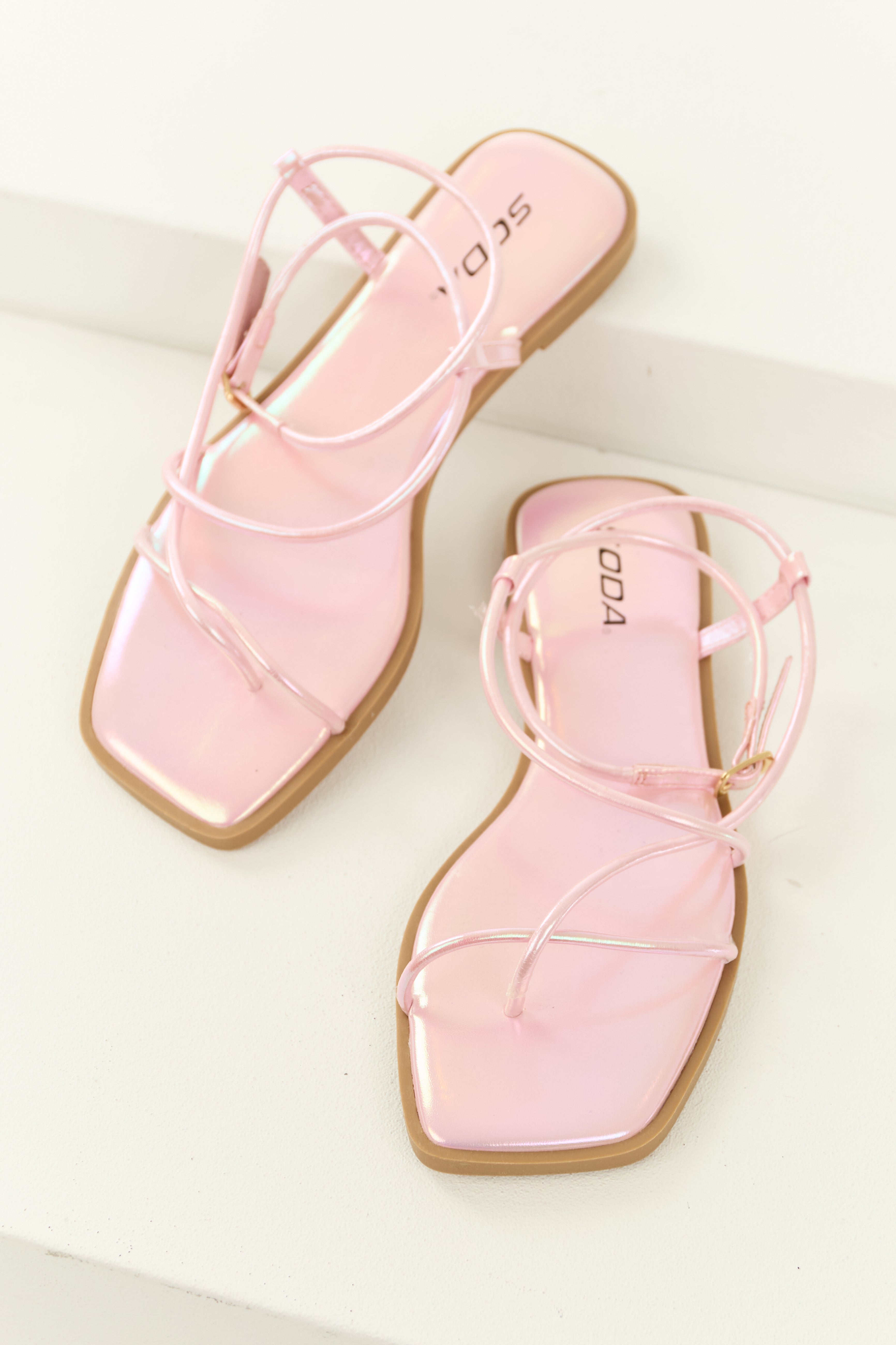 Discover these pink metallic strappy flat sandals made of non-stretchy faux leather with an adjustable buckle ankle strap. Enjoy the slightly cushioned insole and a low heel of .25 inches. Perfect for long summer walks. Imported and available in various sizes.