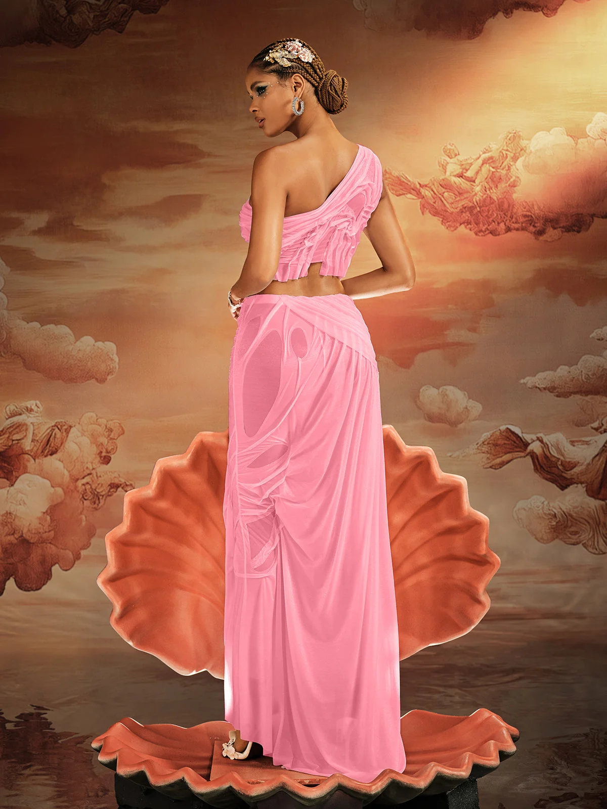 Elevate your wardrobe with our Pink One Shoulder Ruched Skirt Set, exuding elegance and style. This set features a flattering one-shoulder design and a ruched skirt for a sophisticated fit. Perfect for special occasions or a night out, it boosts your confidence and sophistication. Experience slight stretch comfort in 100% Polyester. Dry clean only. Lighting may affect color variation. Model wears an S size.