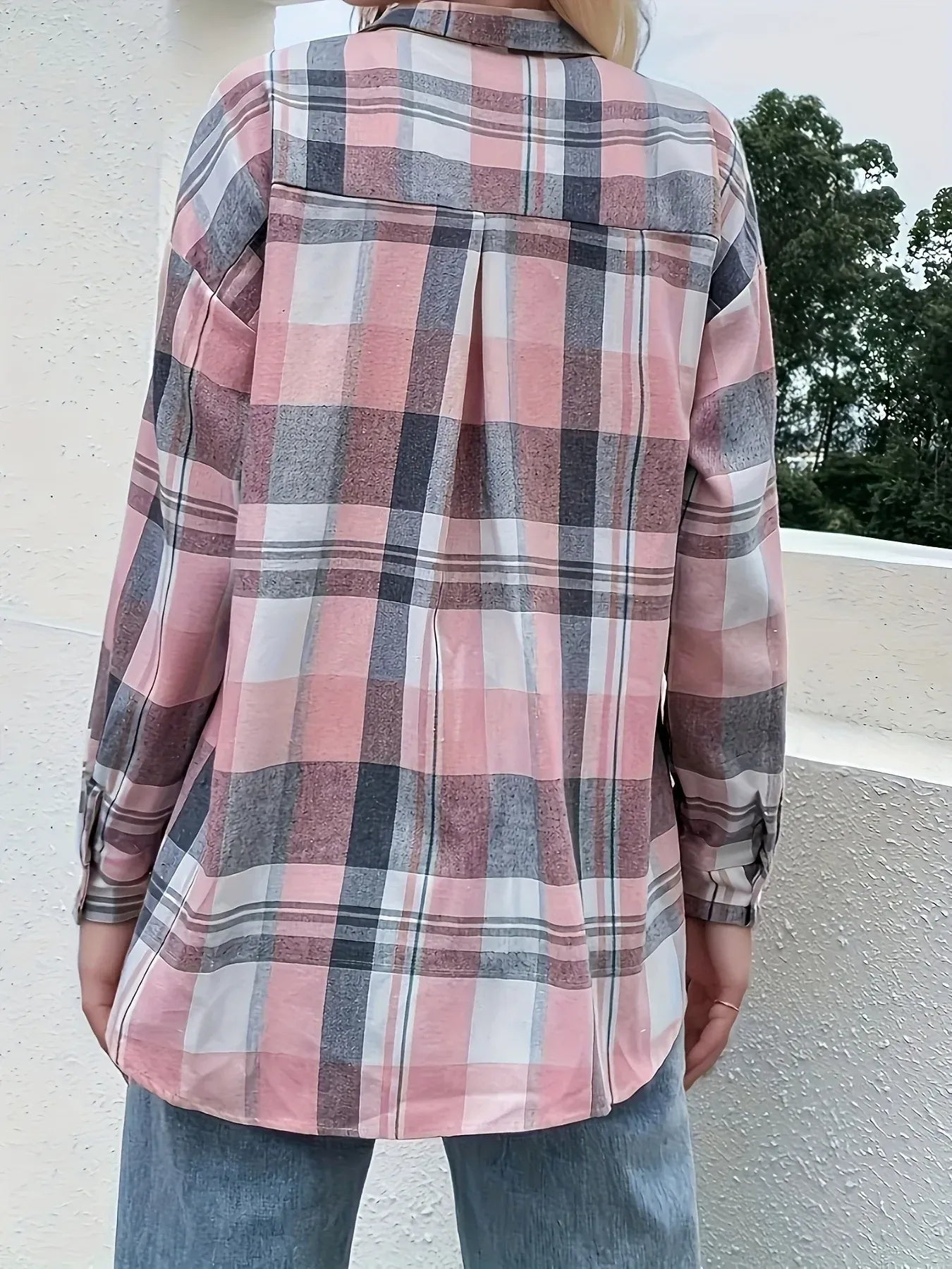 This pink plaid button-up shirt features a classic design for ultimate comfort. Made of 100% polyester, it offers a timeless style suitable for various occasions. Care instructions include machine wash cold and tumble dry low. Imported. Stay stylish with this versatile shirt. Available in sizes S, M, L, XL, and 2XL. Top Length: S – 25.2″, M – 25.6″, L – 26″, XL – 26.4″, 2XL – 26.8″. Bust: S – 38.6″, M – 40.2″, L – 42.5″, XL – 44.9″, 2XL – 47.2″.