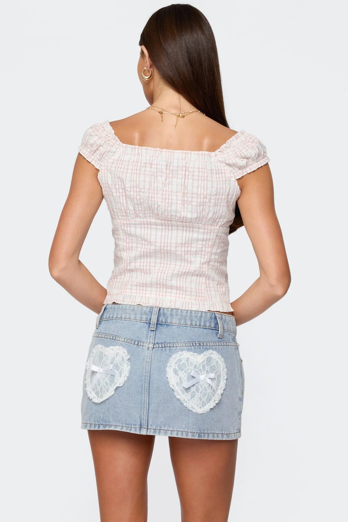 Upgrade your wardrobe with this stylish Pink Plaid Button Up Shirt featuring a wide v neckline, short puff sleeves, underbust stitching, center ruching, and ruffle trim for a feminine touch. Made from a blend of cotton and polyester for comfort and durability. Perfect for casual outings or special occasions. Machine washable. Available in sizes XS to XL.