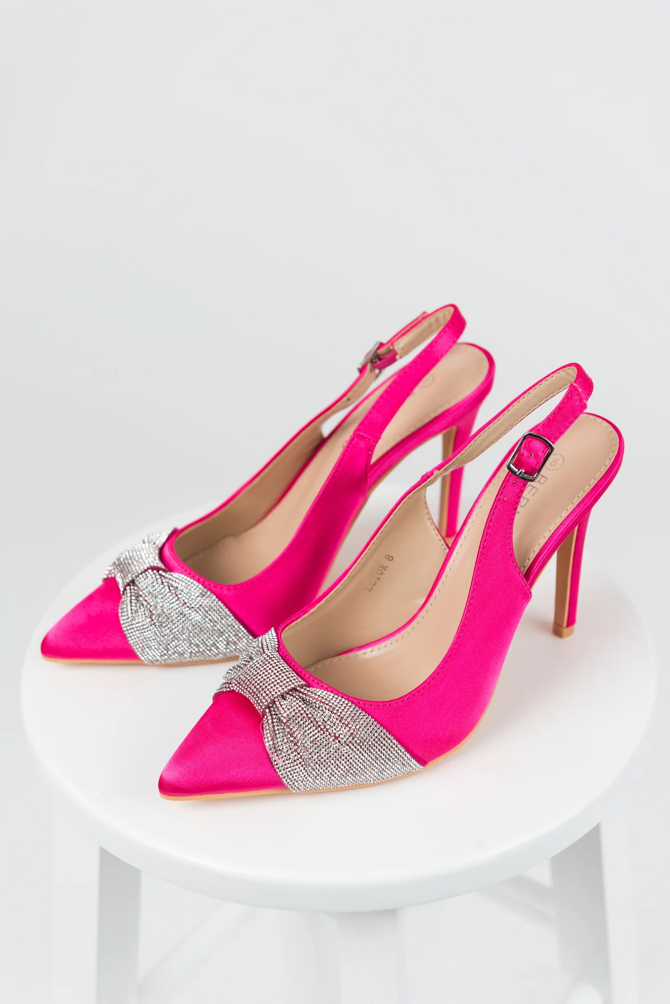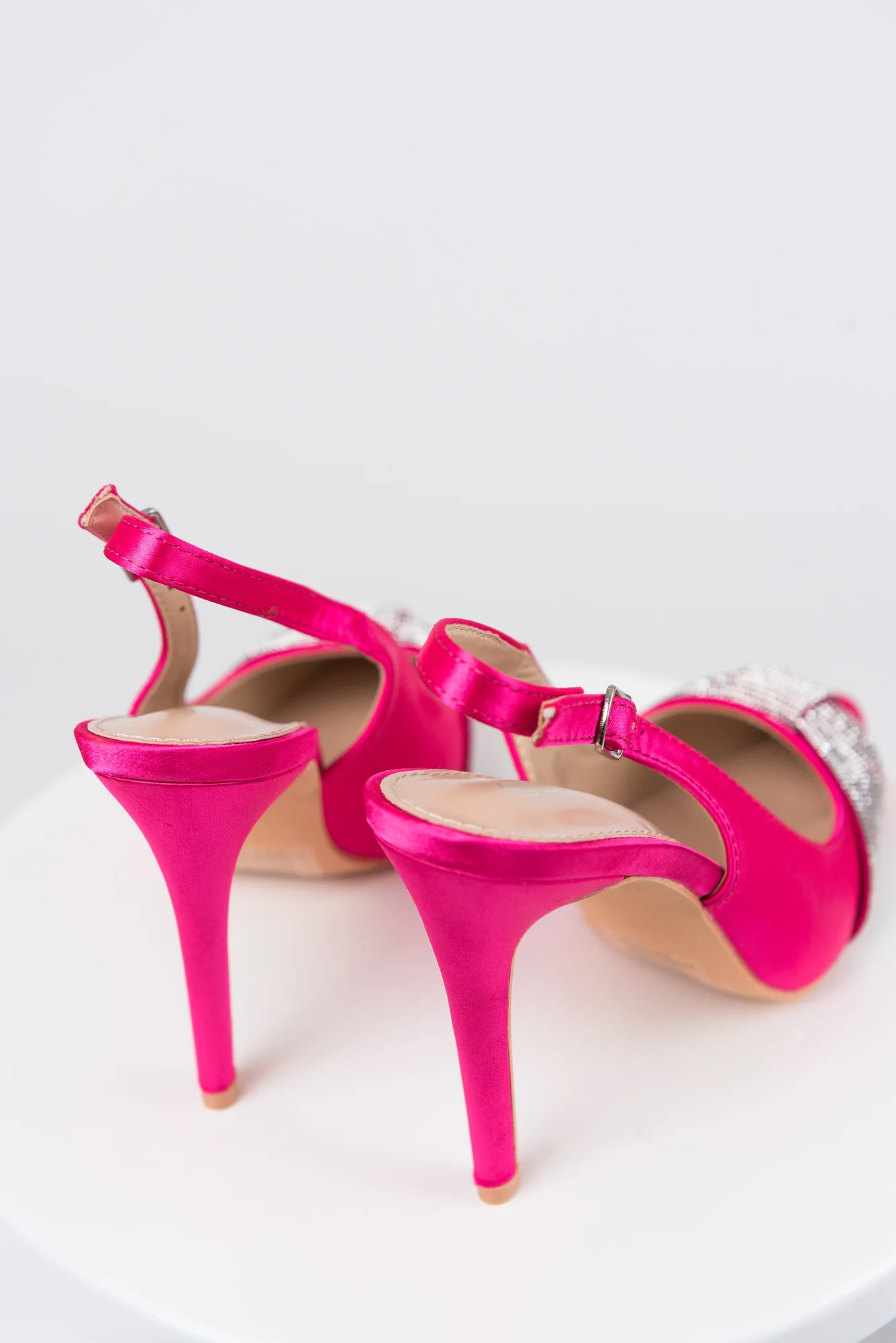 Step up your style with these elegant Pink Rhinestone Satin Pointed Toe Heels. Made from shiny satin material with a silver buckle sling back, they feature a slightly cushioned insole and a nude rubber sole. With a 4.5-inch heel height, a 4.5-inch shaft, and an 8.5-inch circumference, these imported heels add a touch of sophistication to any outfit. Available in various sizes.