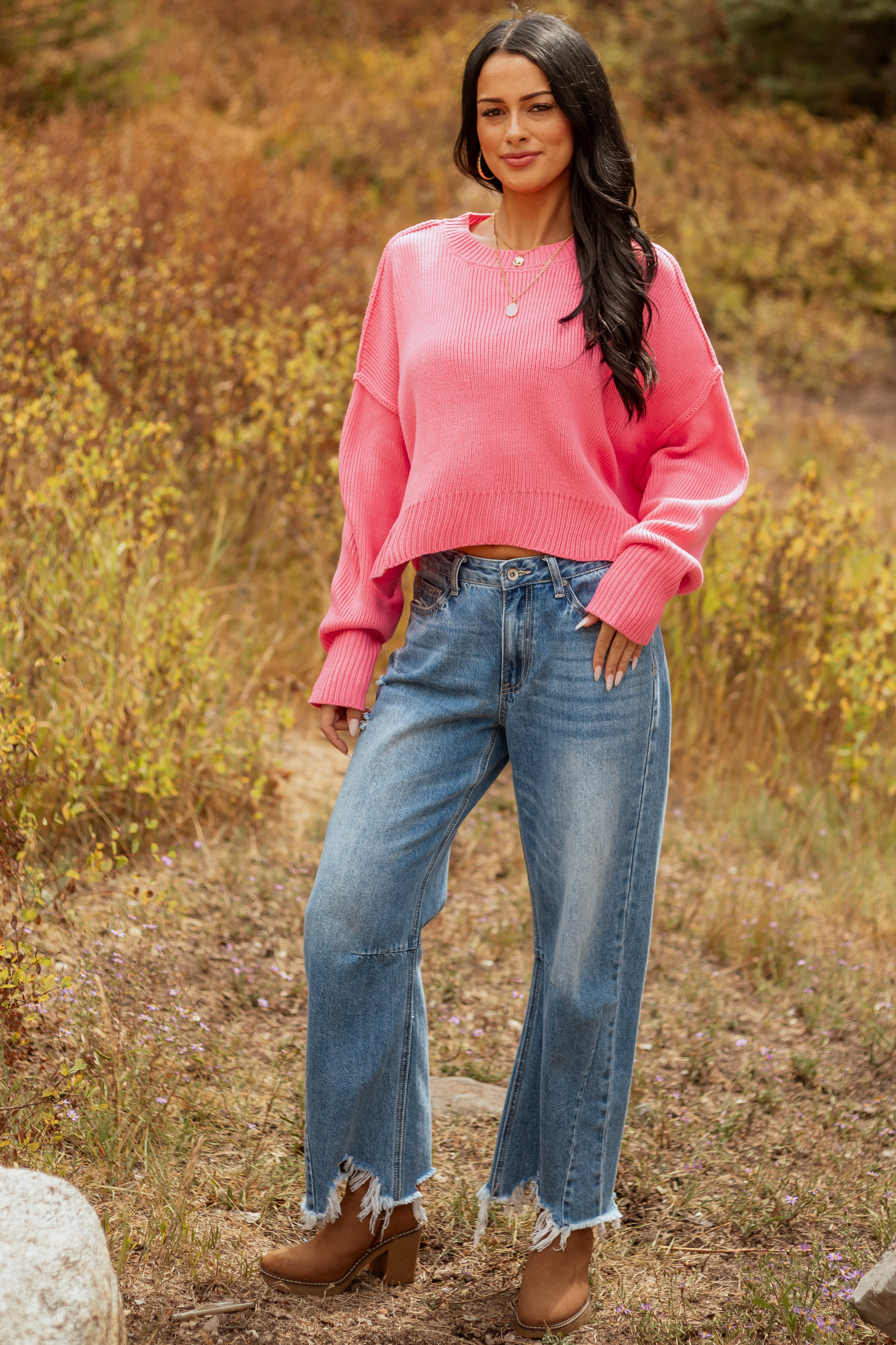 Stay cozy and stylish in this soft knit Pink Rib Knit Cropped Sweater, featuring a boxy, oversized fit ideal for layering. Crafted from 100% Acrylic with banded trim, this sweater has a slightly cropped length perfect for cool weather. Available in sizes S, M, and L. Whether youre out for a casual day or a relaxed night out, this versatile sweater is a must-have addition to your wardrobe.