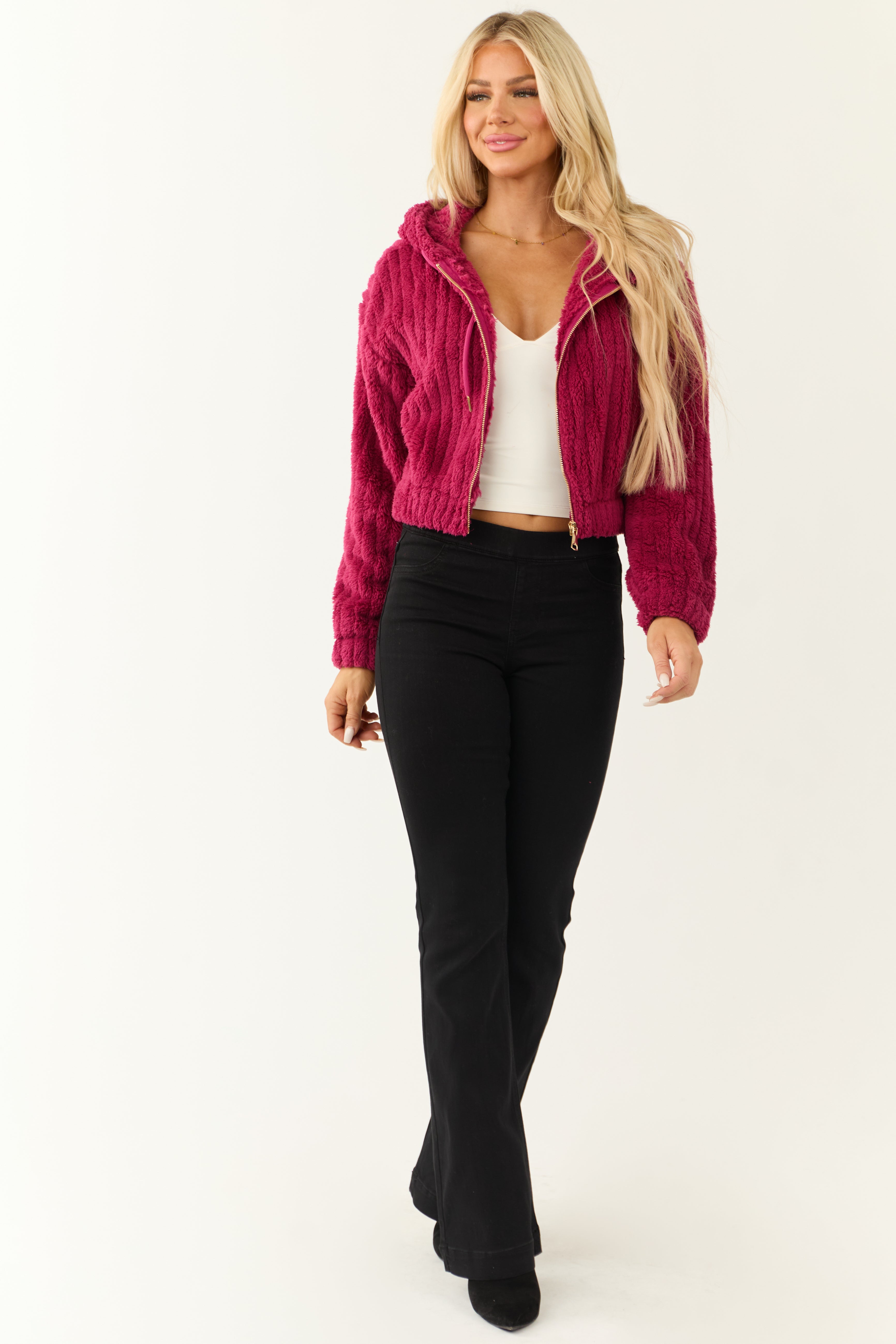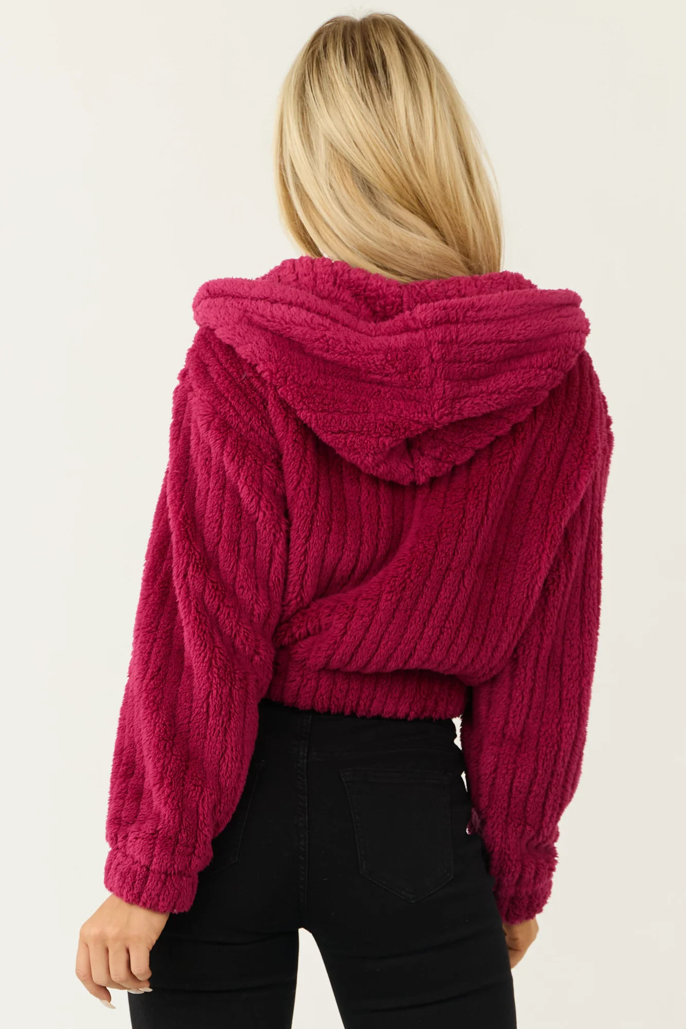 Stay warm and stylish with our Pink Ribbed Faux Fur Hooded Jacket. Made of non-stretchy woven fabric, this jacket features a gold zipper, drawstring hood, banded elastic trim, and a zip-up front for easy wear. The drop shoulder and cropped design add a trendy touch, while the long sleeves provide extra coziness. This unlined jacket is perfect for winter days. Care instructions: Hand wash cold, do not bleach, hang dry. Model is wearing a size Small. Model’s Profile: Size 1, Height 57″, Bust 34″, Waist 26″. Available in sizes S, M, L.