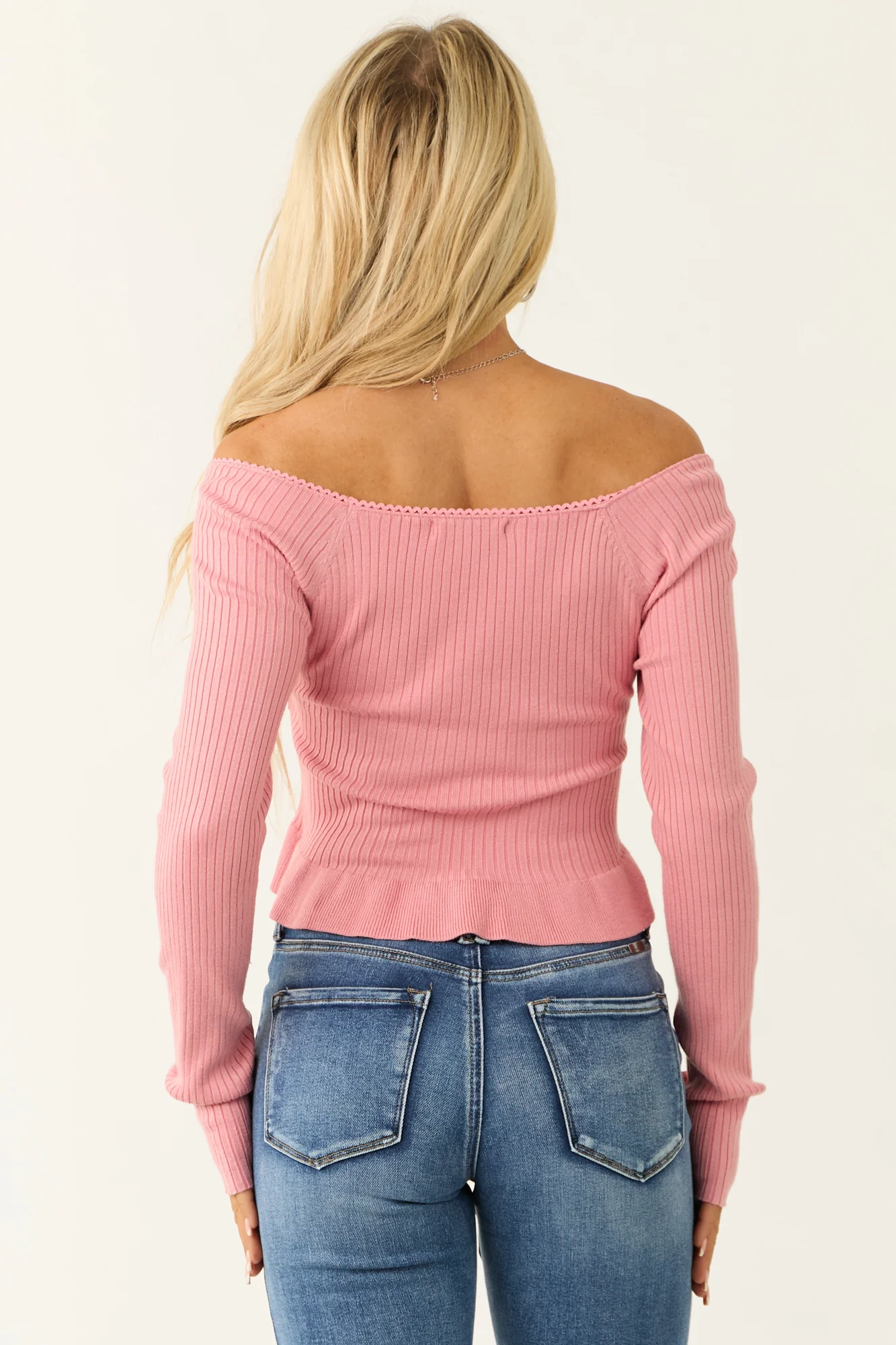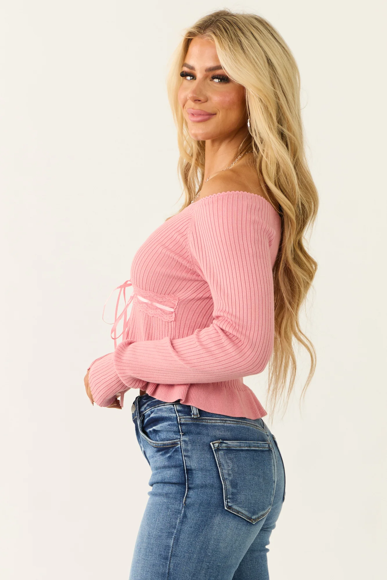 Stay chic with our Pink Ribbed Knit Off Shoulder Crop Top. Made from a stretchy ribbed knit fabric, this top features an adjustable ribbon tie, V neck, ruffle hem, and lace detail for a trendy look. The long sleeves add a touch of elegance. Perfect for casual or daytime wear, this top is a must-have addition to your wardrobe. Hand wash cold and dry flat for best results. Available in sizes S, M, and L.