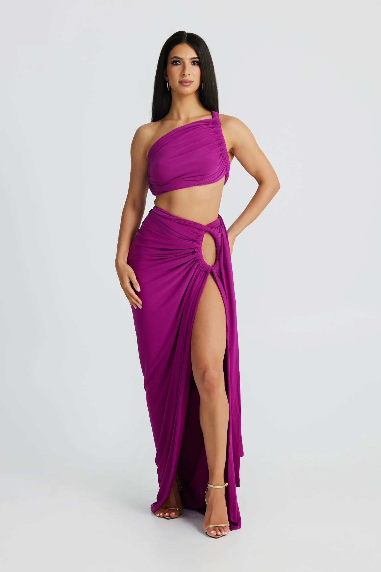 Step into elegance with the Labelle Slanted Shoulder Halter Set in Pink from Night Novas. This two-piece ensemble is crafted from double-layered stretch fabric that embraces your figure perfectly. The top is adjustable for a custom fit, while the ultra-high slit skirt adds a touch of allure. Fully lined and made of 94% Polyester and 6% Spandex. Available in sizes S, M, and L. Enhance your wardrobe with this exquisite set today!