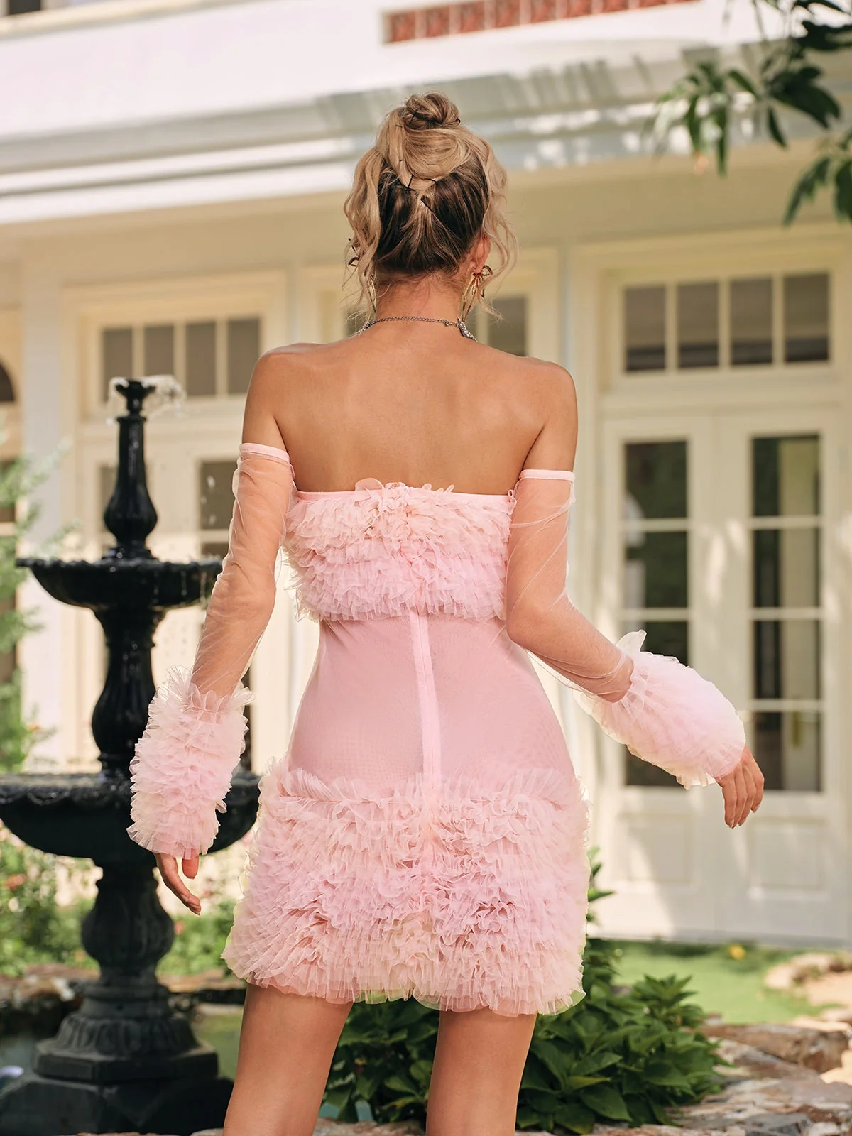 Make a profound statement with the Pink Ruched Mesh Mini Dress by Li Fu. This stunning dress, crafted from 100% Polyester, boasts delicate ruching and sheer mesh fabric for a touch of allure. The strapless silhouette elegantly showcases your shoulders and neckline, while the invisible zipper at the back ensures a perfect fit. Whether for special occasions or nights out, exude confidence and style in this modern mini dress that combines comfort and elegance flawlessly. Please note that color may vary due to lighting on images. Embrace grace and sophistication with our chic mini dress, designed for the modern woman. Achieve a perfect mix of style and comfort with a slight stretch material that molds effortlessly to your body. Dry clean only. Available in sizes S, M, and L. Complete your look with this tea-length dress perfect for wedding guests.