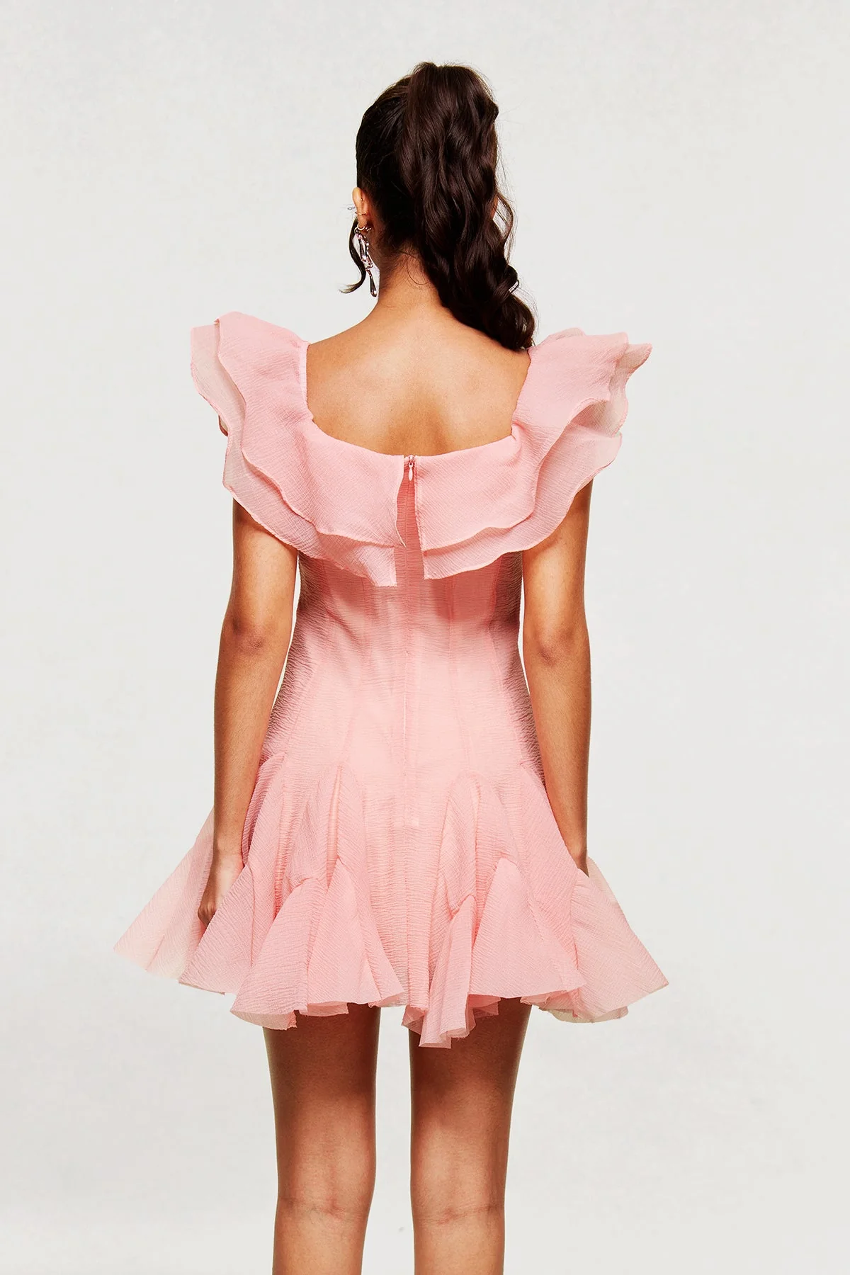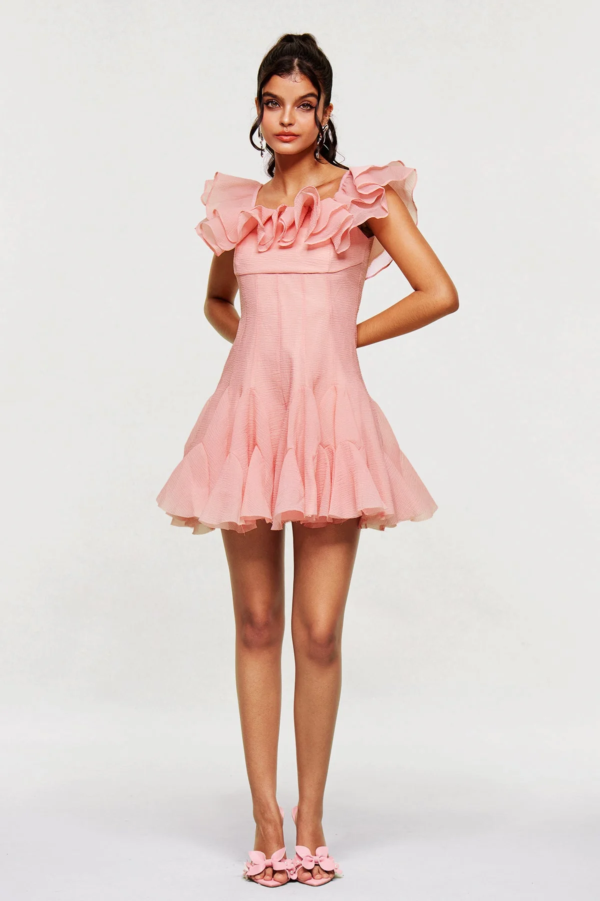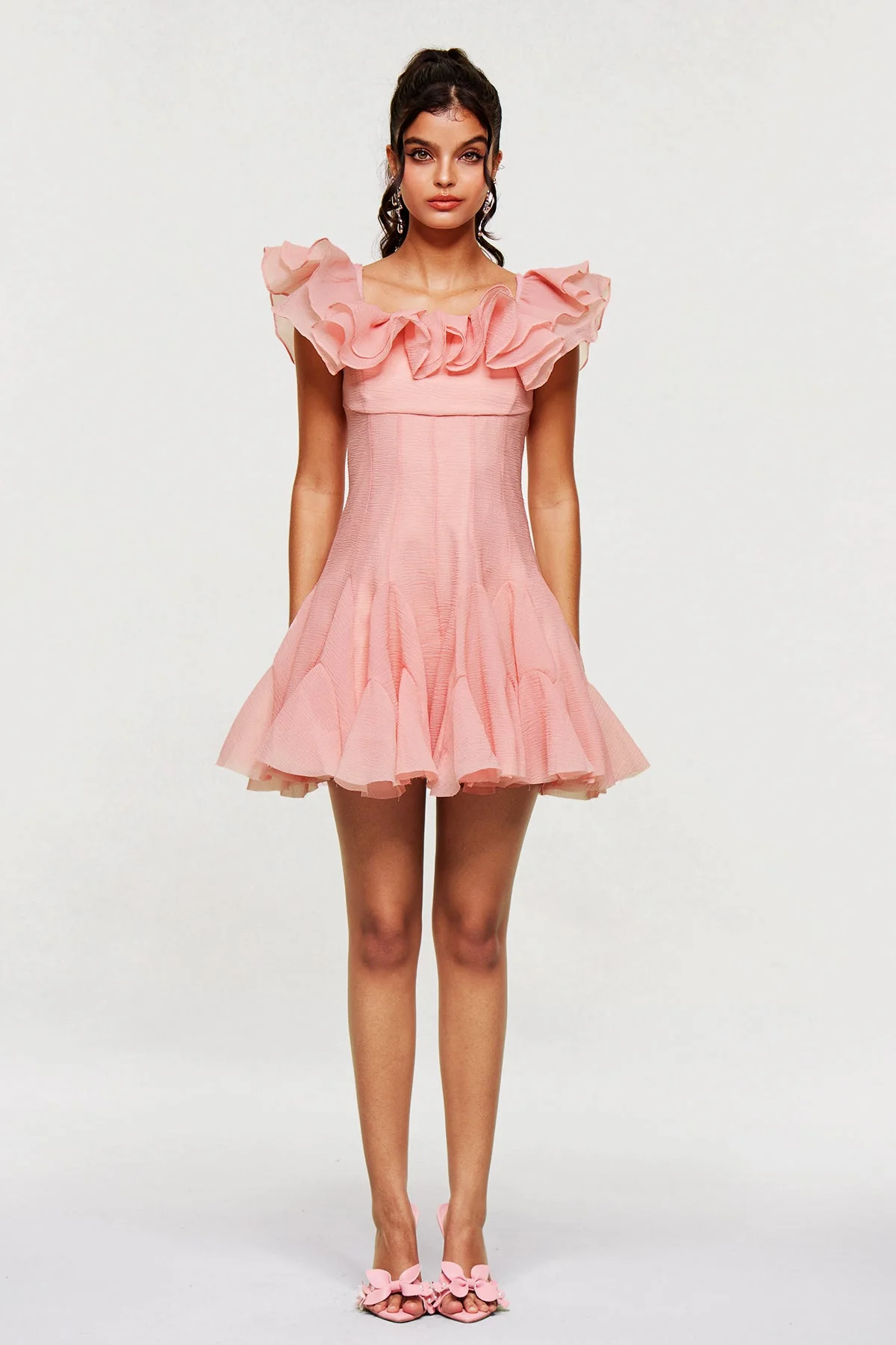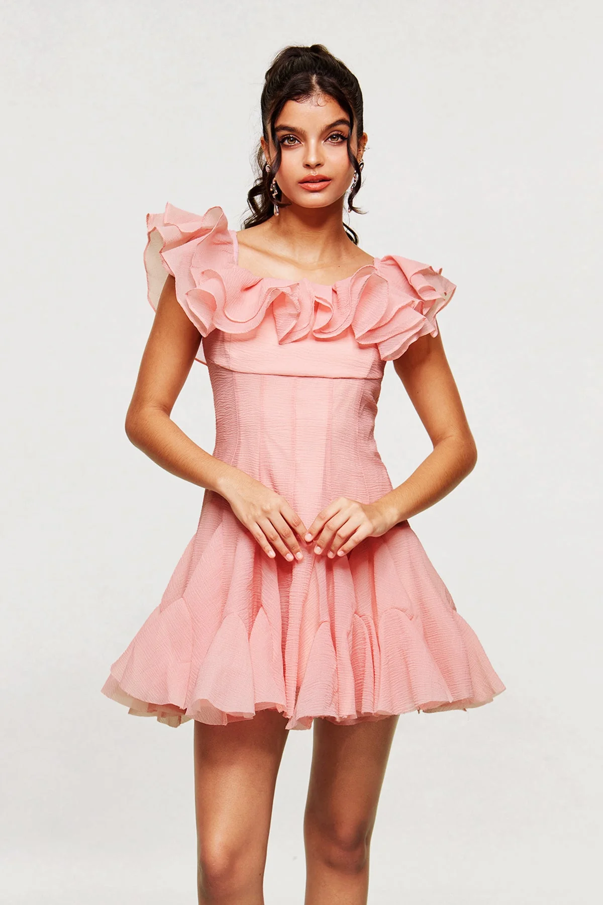 Elevate your style with the Pink Ruffle Corset Mini Dress. This dress seamlessly combines structured elegance with playful ruffles, creating a sophisticated yet charming look. The fitted corset accentuates your natural figure, while the soft pink hue adds a romantic touch. Perfect for making a confident statement at any event, this mini dress is designed for a flattering fit that complements various skin tones. It is crafted for non-stretch comfort and is easy to care for with a gentle machine wash. Illuminate any room with this versatile and chic wardrobe essential. Color variations may occur due to lighting effects in images.