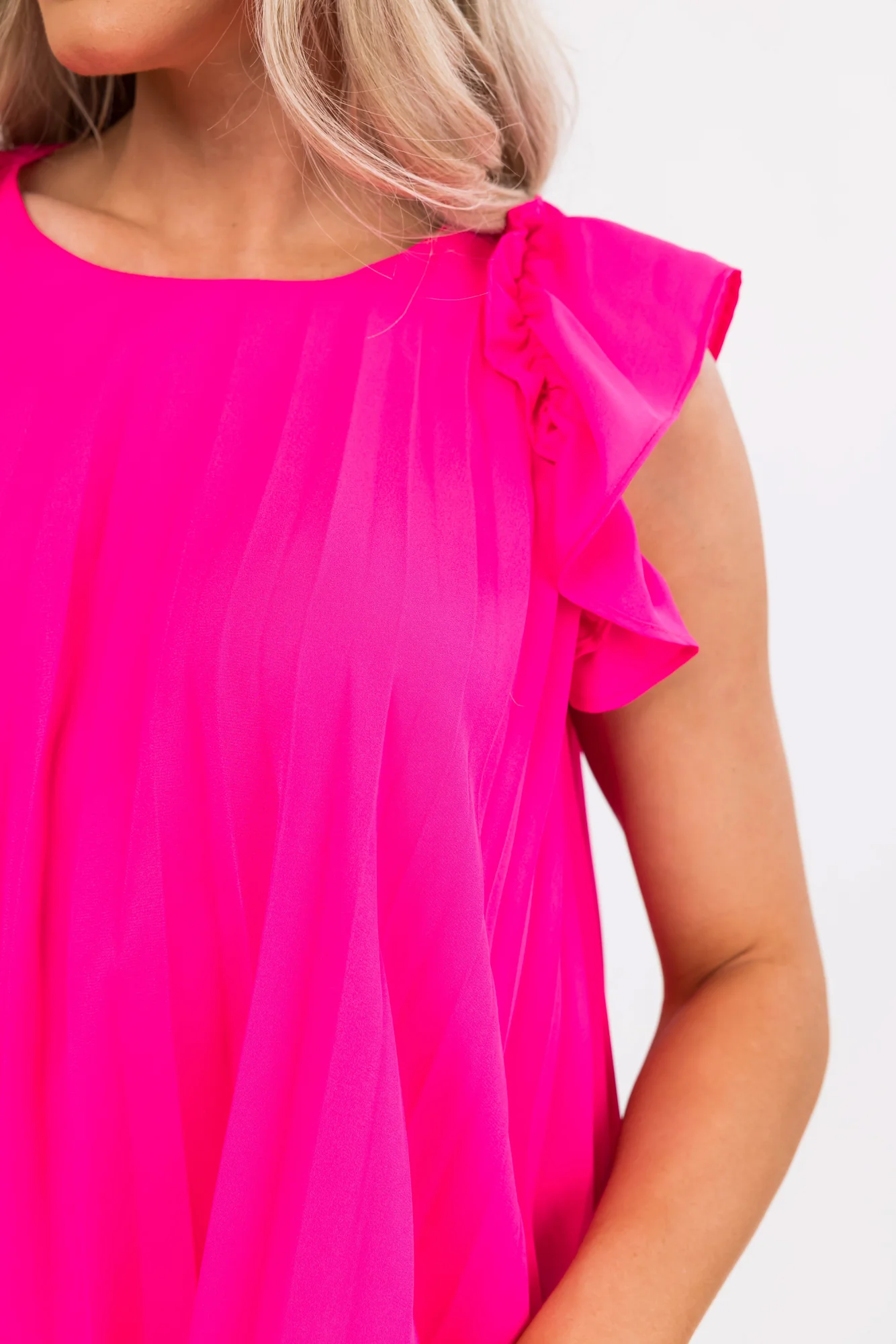 Elevate your wardrobe with this stylish Hot Pink Ruffle Short Sleeve Woven Top . This fashionable top features a pleated design, ruffle detail on the sleeves, and an oversized fit for ultimate comfort. Crafted from non-stretchy woven polyester, it comes with a back keyhole closure. Perfect for daytime wear, this top is unlined and adds a touch of elegance to any outfit. Hand wash cold recommended.