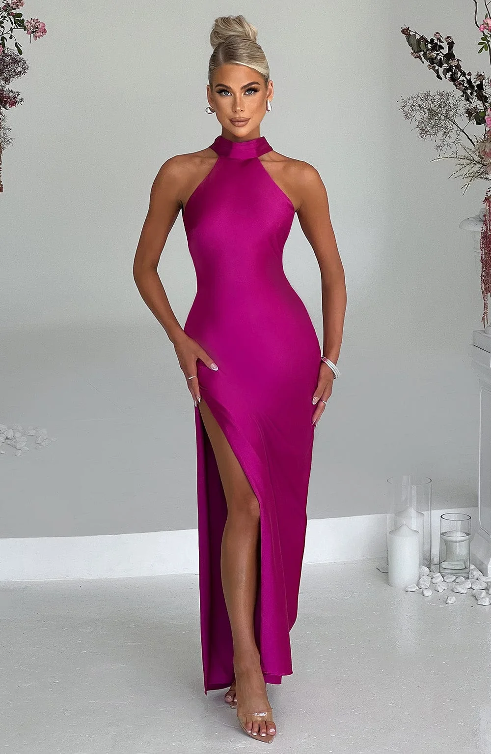 Indulge in the unforgettable elegance of the Pink Satin Bias Cut Maxi Dress. Ignite the night with its high neck, backless design, and oversized tie detail. Crafted from the finest satin, this dress gently flares at the hem for a timeless silhouette. Elevate your look with platform heels and be the center of attention in any event.