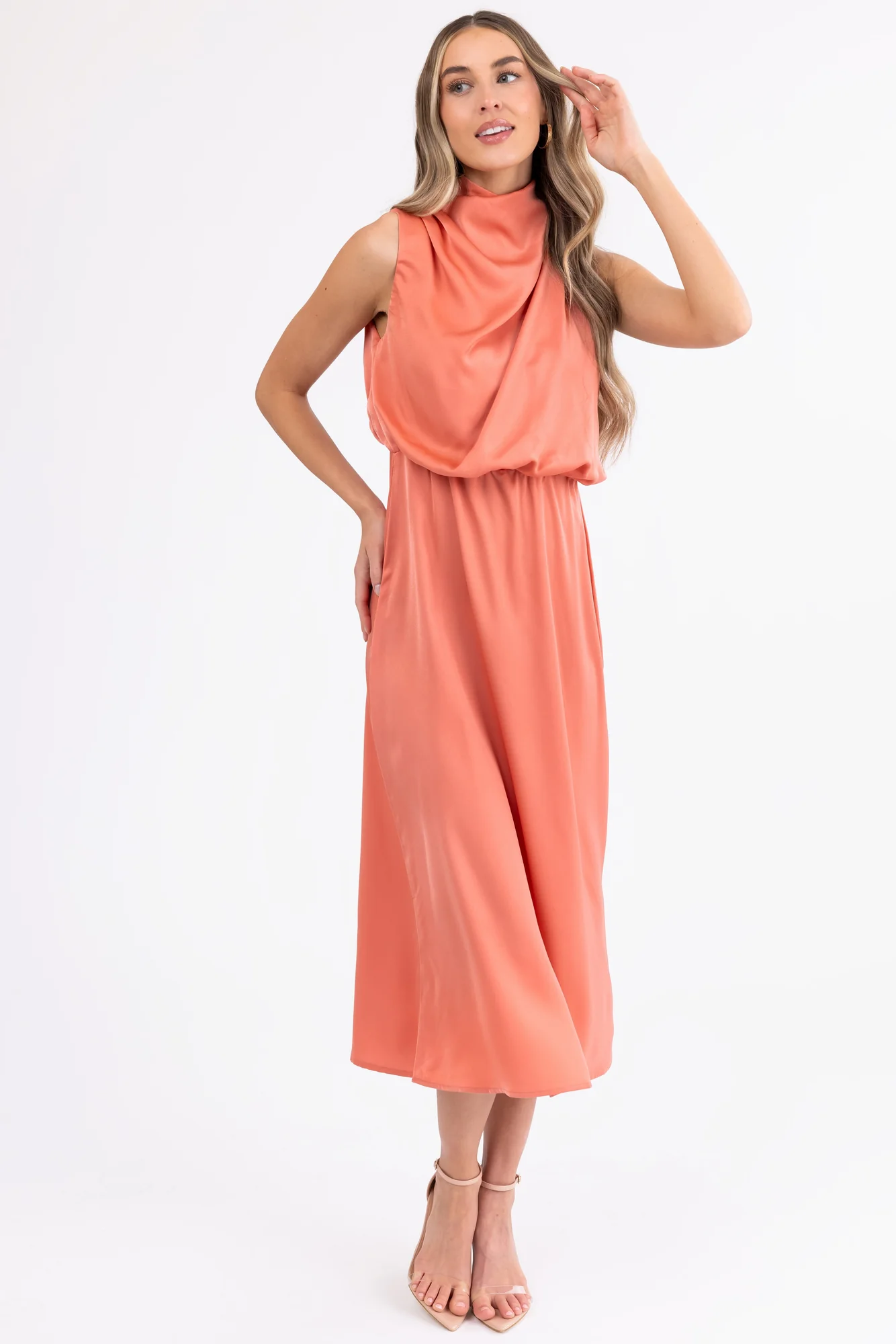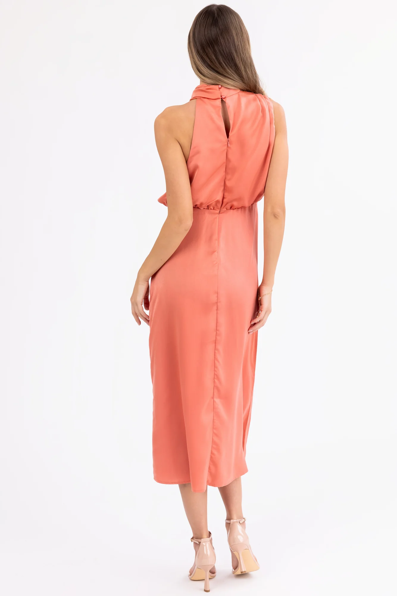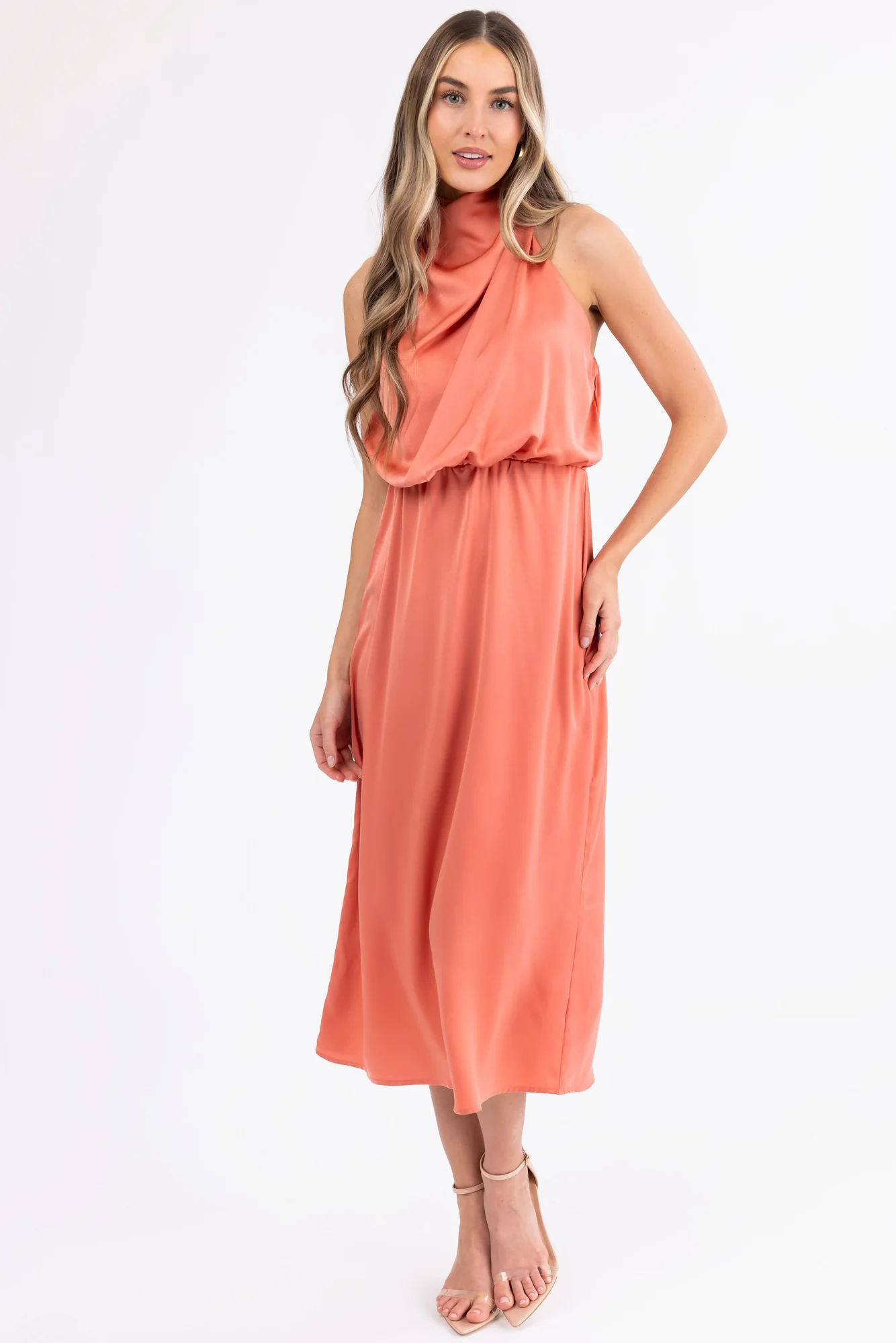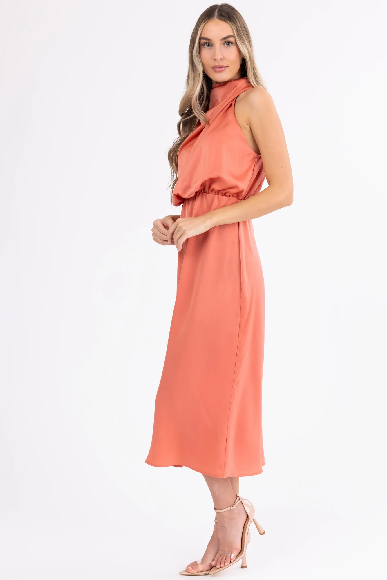 Indulge in the timeless elegance of our Pink Satin Halter Midi Dress. Available in sizes S, M, L, and XL, this dress features a blouson bodice with a mock neck and overlay detail for a chic look. The non-stretchy satin woven fabric offers a luxurious feel. Complete with a back keyhole, elastic waistband, and zipper closure, this dress is perfect for special occasions. Care instructions: Machine wash cold, low iron if needed. Model is 58″ tall, wearing size Small.