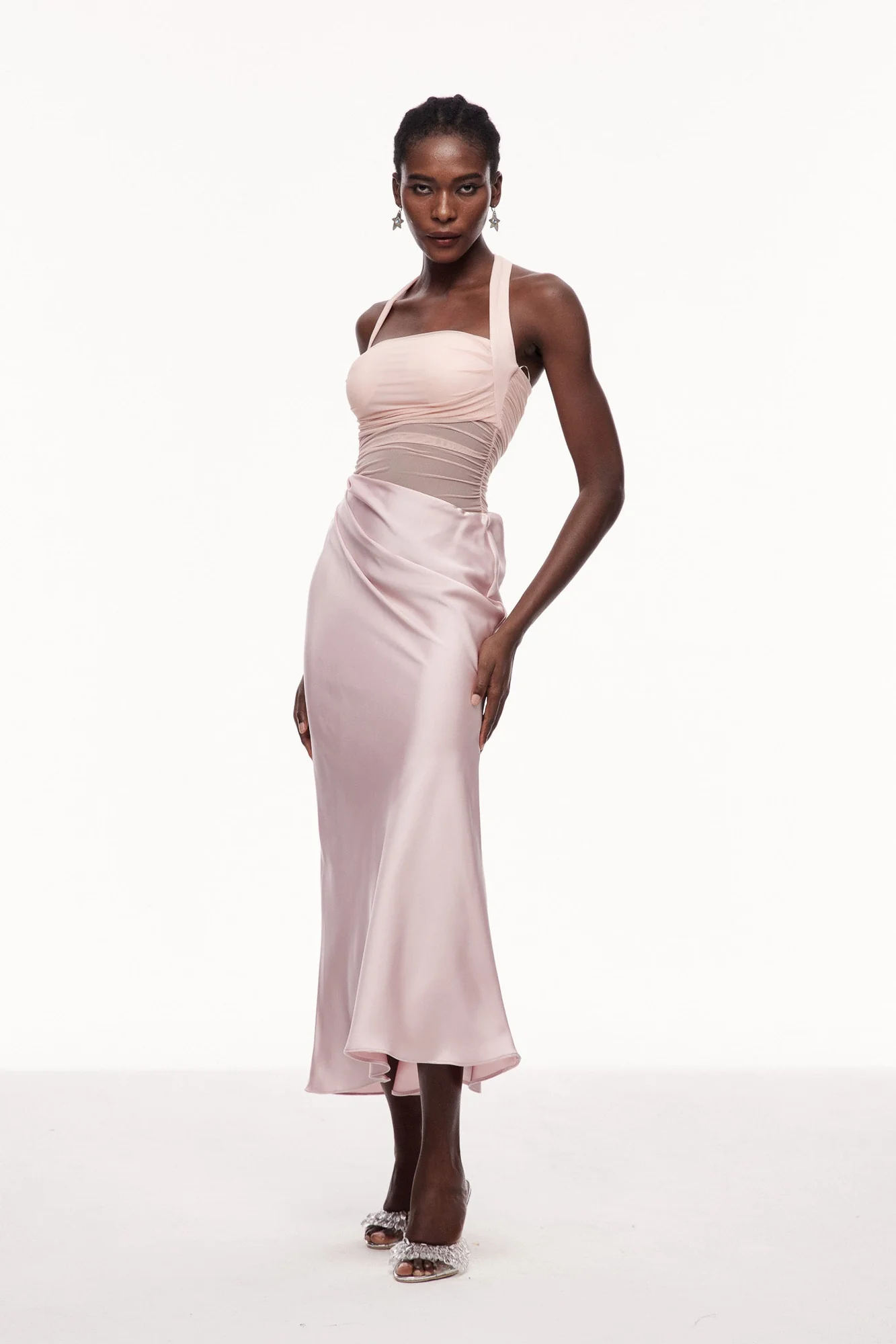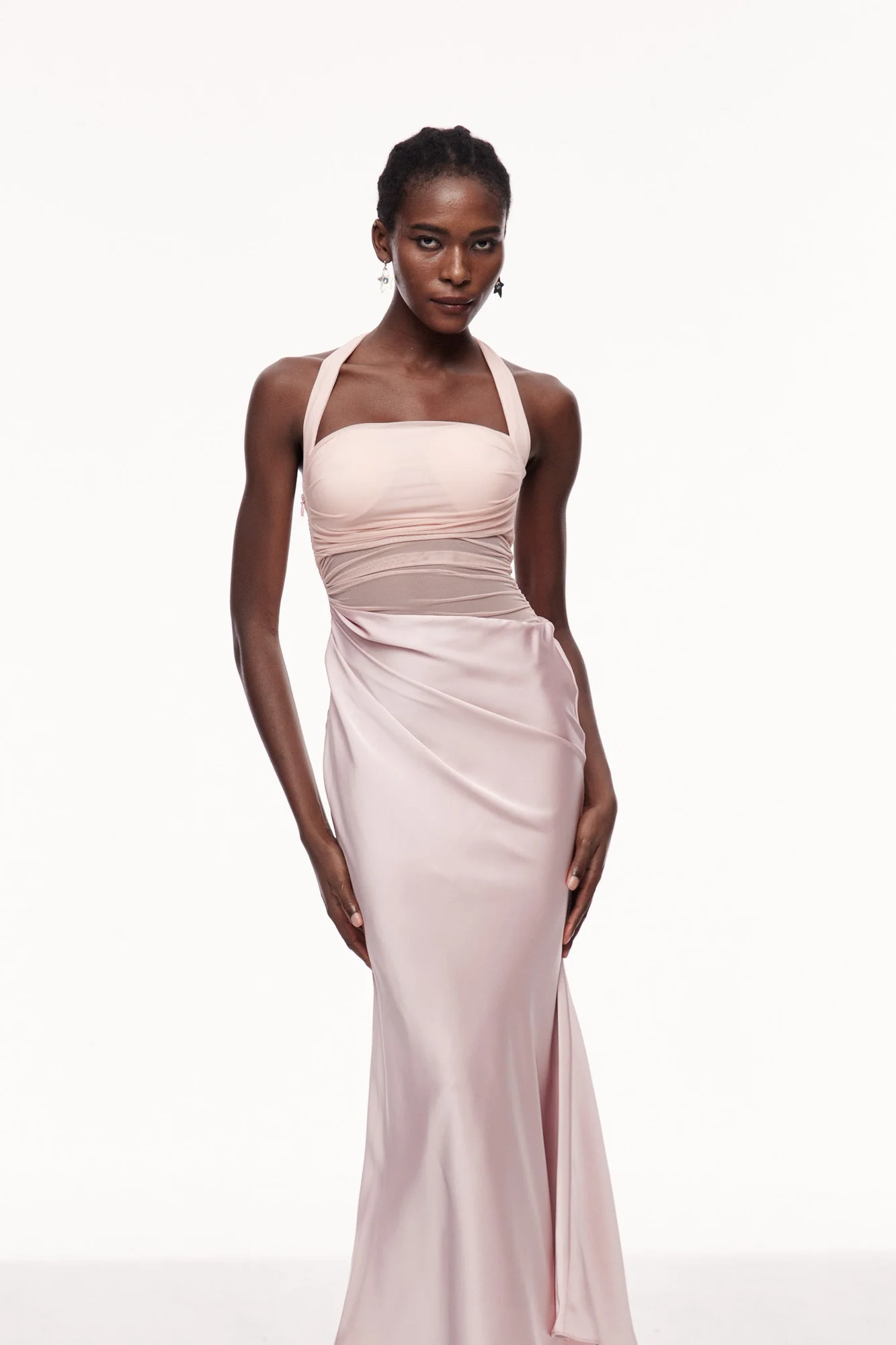 Elevate your wardrobe with the Pink Satin Halter Neck Maxi Dress. Expertly crafted for a sophisticated silhouette, the halter neckline accentuates the shoulders. Delicate ruching enhances the elegant drape, made from smooth satin offering a luxurious sheen and fluid movement. Perfect for formal or evening events, its timeless design combines comfort with refined style, making a graceful statement wherever you go. This non-stretch maxi dress is perfect for a gentle machine wash. Color may vary due to lighting on images.