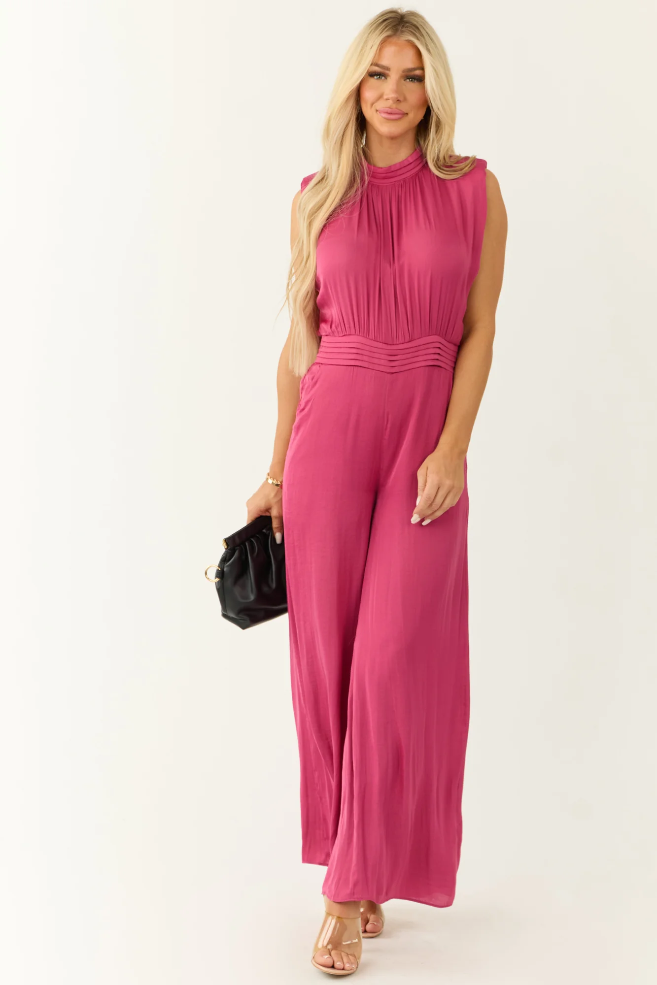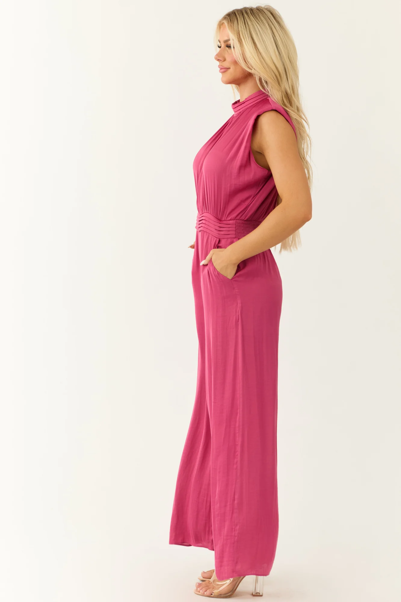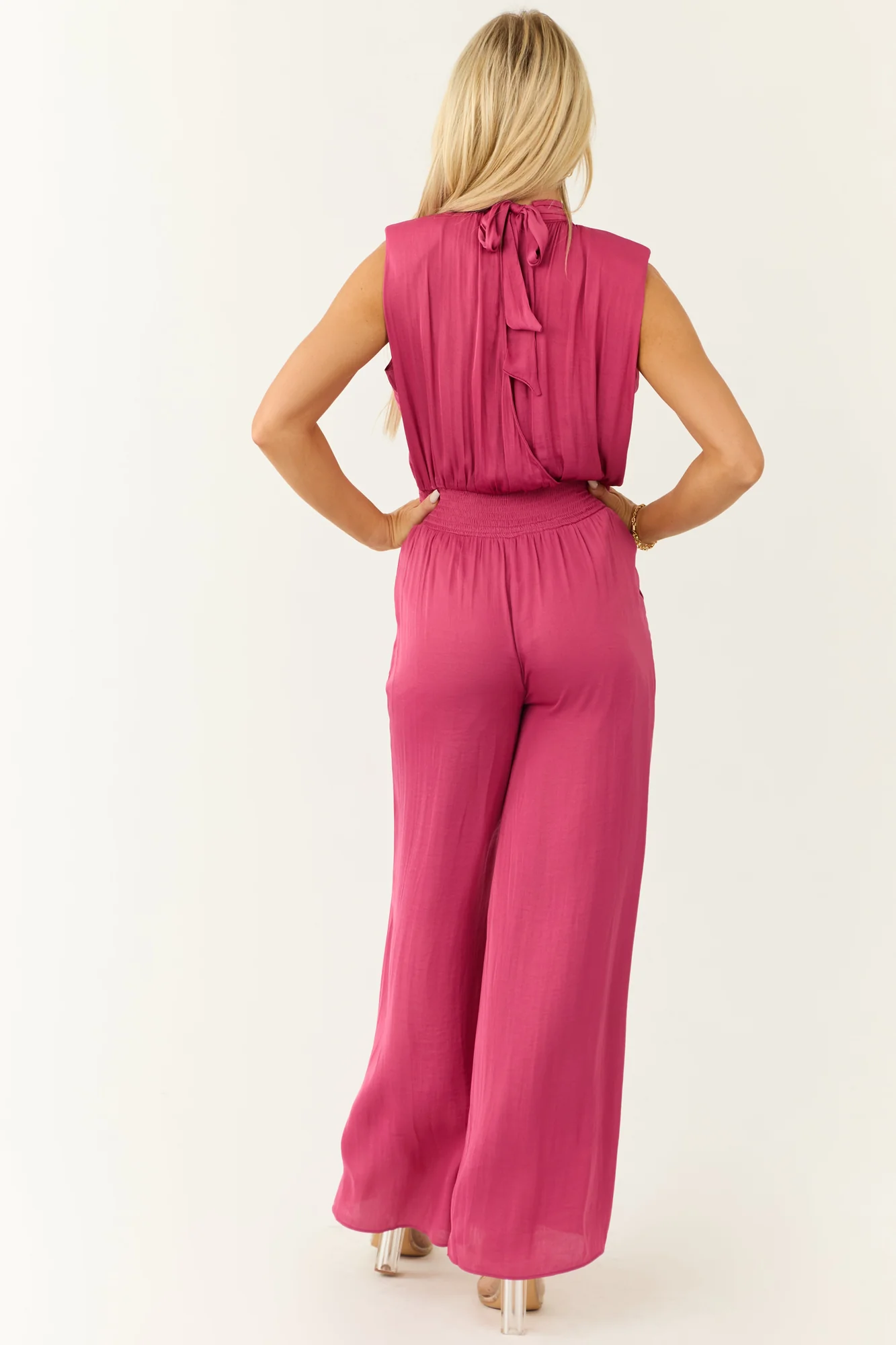 Embrace elegance with our Pink Satin Wide Leg Silky Jumpsuit. This stunning jumpsuit features non-stretchy satin with a smocked back, pleated high neckline and waist, open back with tie, snap closure, and shoulder pads. The wide leg design offers comfort and style. Step out in confidence with this unlined jumpsuit made of 100% Polyester. Perfect for a night out. Care Instructions: Hand wash cold, color separate, do not bleach, line dry, iron on low heat.