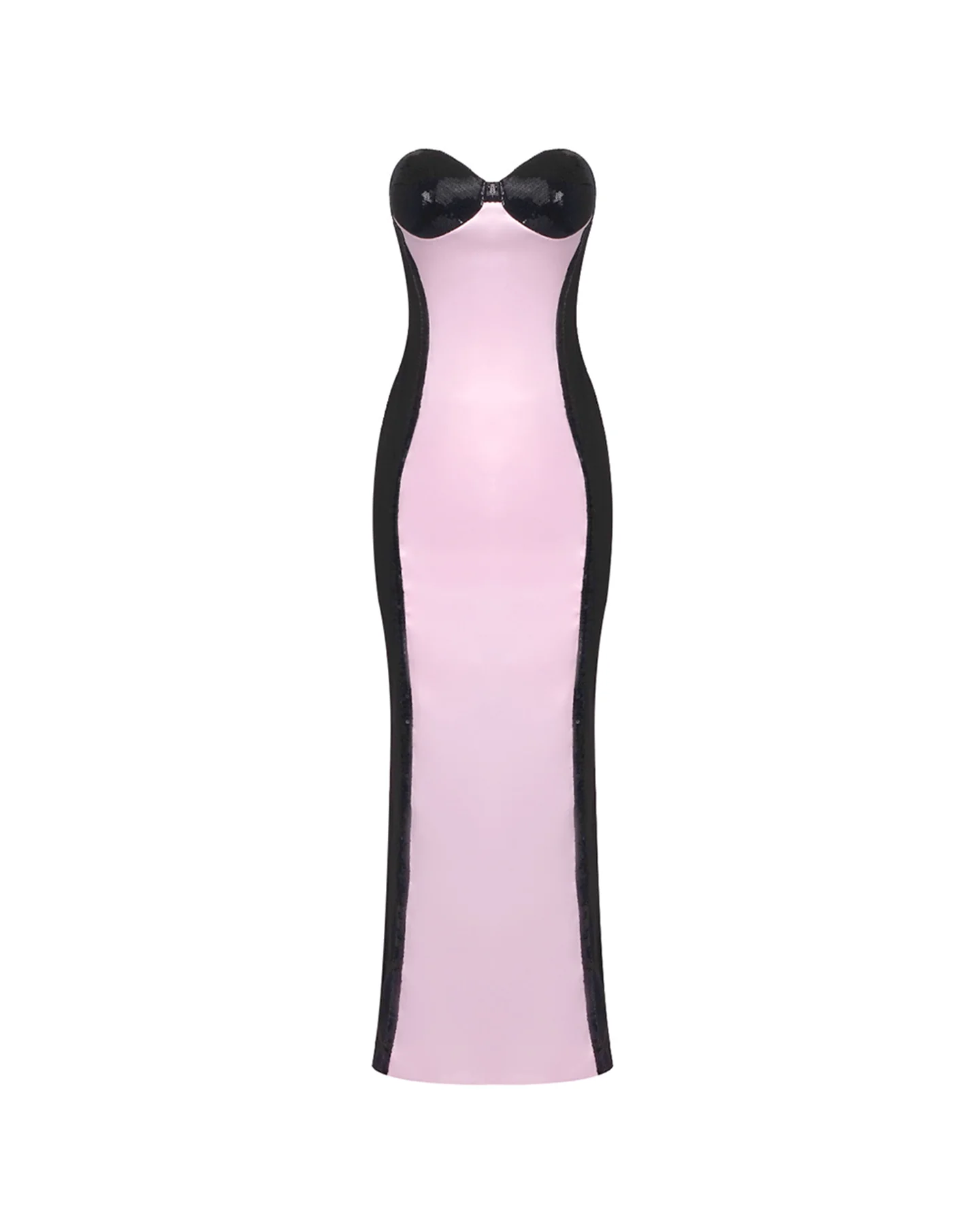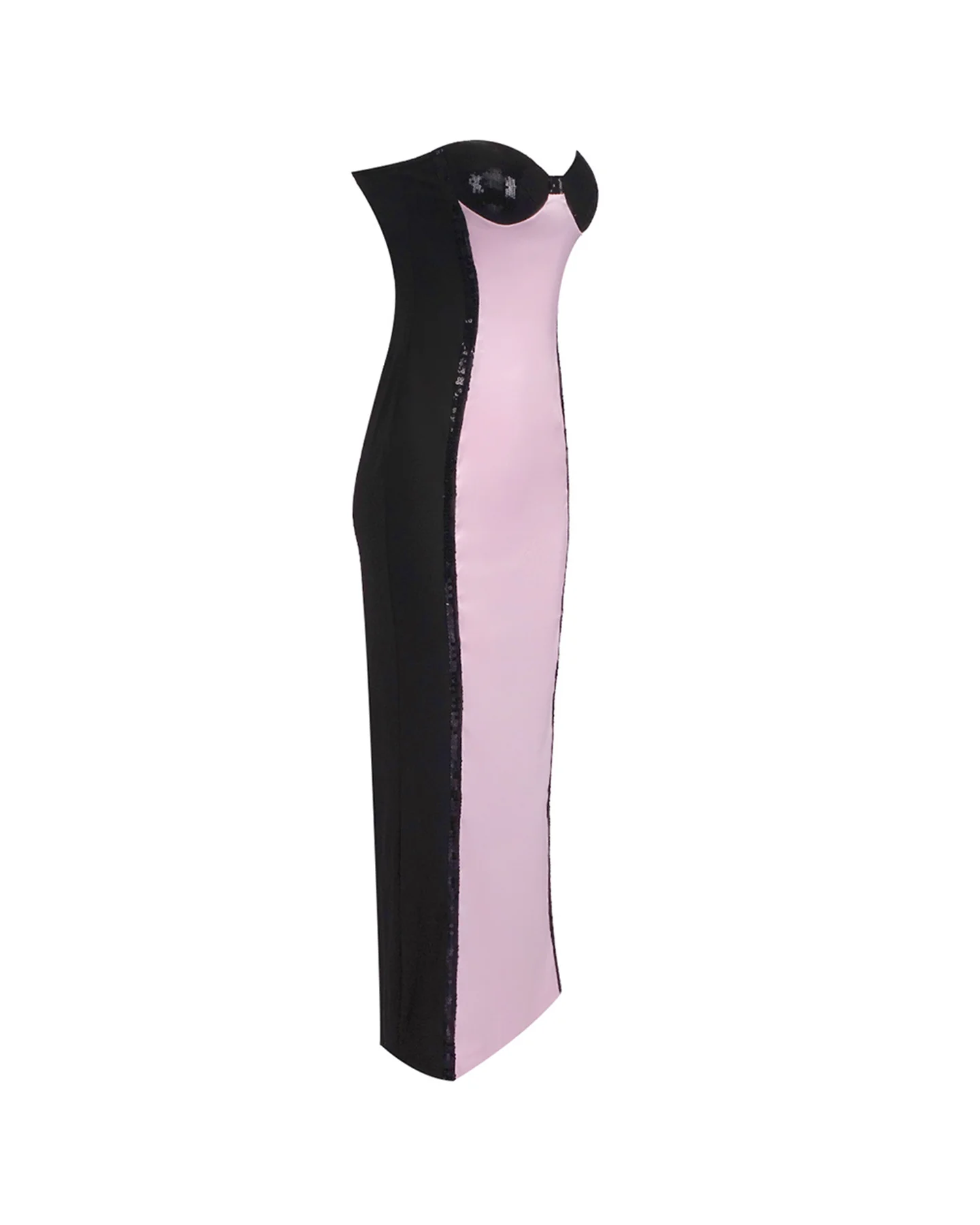 Elevate your style with our pink sequin bustier maxi dress featuring a strapless design for chic support. This elegant dress boasts a black and pink color combination that exudes sophistication at every event. The sequined details and concealed back zipper add a touch of glamour. Crafted from high-quality polyester, cotton, and silk blend, this dress is both durable and luxurious. Please refer to our size chart for the perfect fit.
