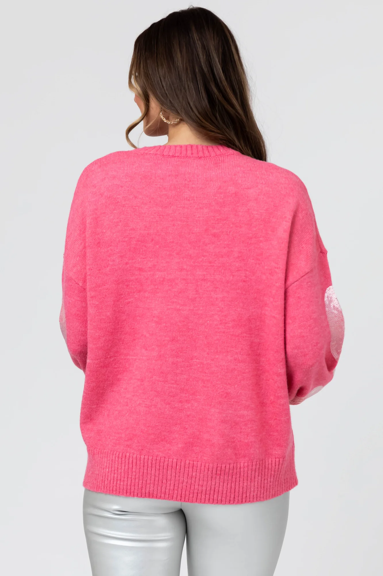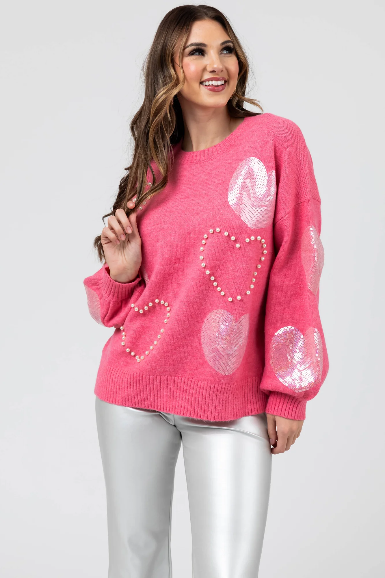 Indulge in the cozy glamour of our Pink Sequin Heart Balloon Sleeve Sweater. Crafted from stretchy fuzzy knit for comfort, this sweater features long balloon sleeves, a gentle drop shoulder, and a rounded neckline with ribbed trim. Adorned with delicate clear sequins, this unlined sweater exudes subtle shine. Imported and made of a blend of acrylic, nylon, and polyester. Take care of it by hand washing cold, avoiding bleach, laying flat to dry, and ironing on low if necessary. Model is wearing a size Small.