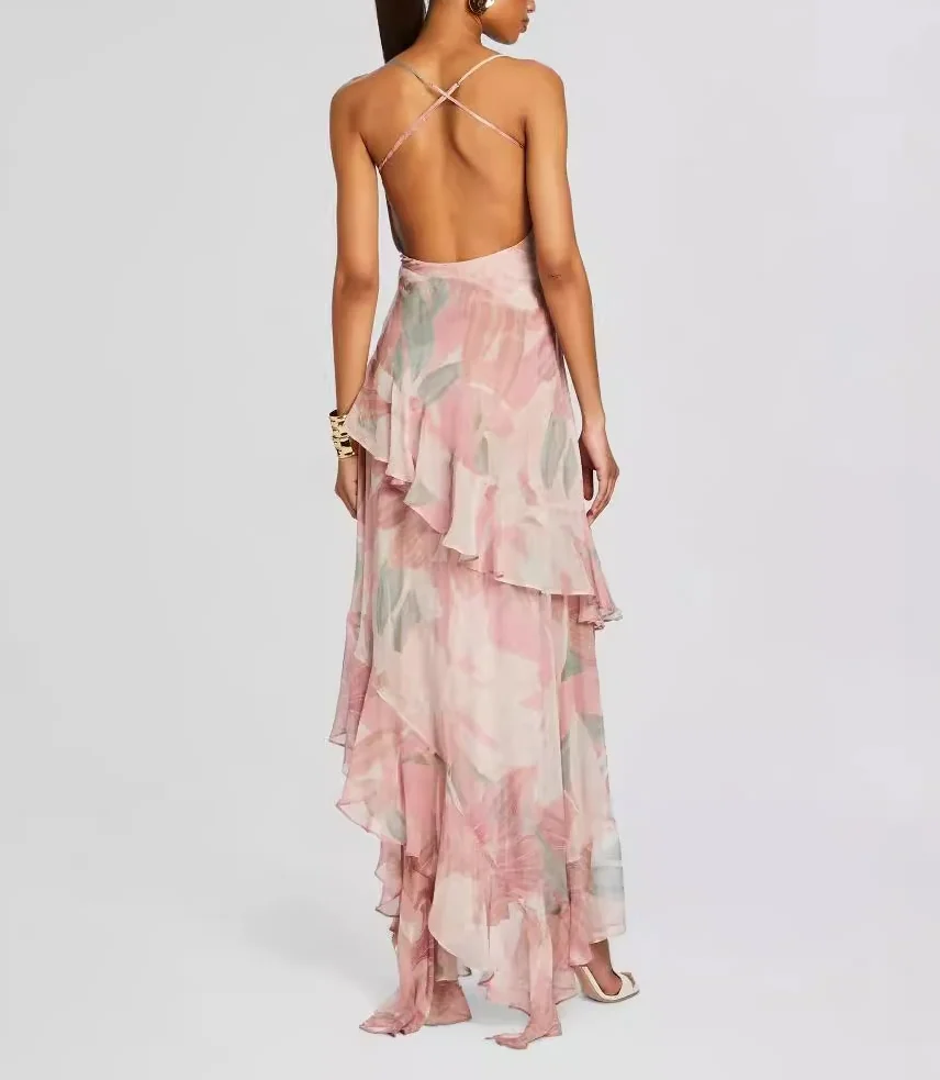 Make a bold statement with this pink silk midi dress featuring luxurious cascading ruffles and a stunning floral print. Crafted for both beauty and comfort, this dress with cowl neck and spaghetti straps is daring and elegant. The high-low hem adds a touch of drama to your look. Constructed from 100% silk, enjoy its premium feel and look. Dry clean only. Please refer to our size chart for the best fit.