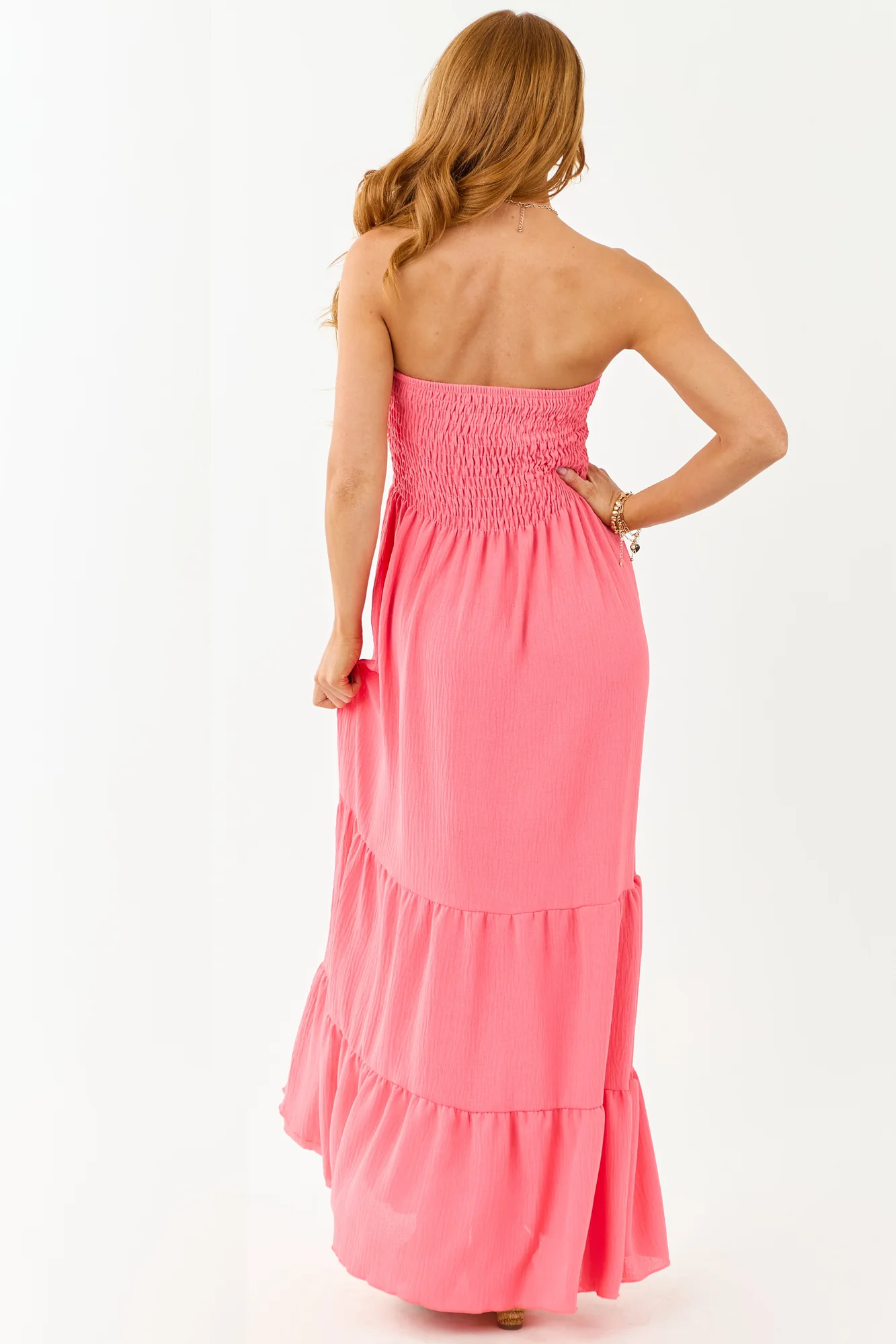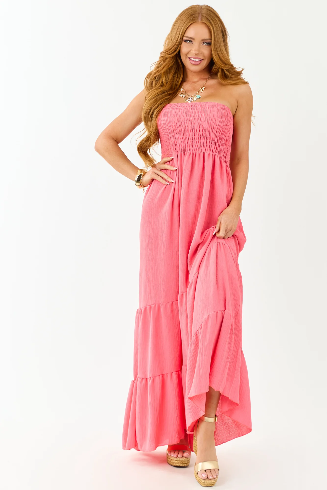 Make a statement in this vibrant pink Smocked Strapless Maxi Dress. Crafted with a flattering smocked bodice and a flowy skirt, this dress is perfect for any occasion. The stretchy bodice ensures a comfortable fit while the 100% Polyester material offers both style and ease of wear. Whether youre out for a casual day or attending a special event, this versatile dress is your go-to choice. Garment specifications for size Small: Bust – 28″, Waist – 26″, Length – 50″. Unlined for a lightweight feel. Imported. Model in size Small is 59″ tall with a bust of 34″ and a waist of 26″.