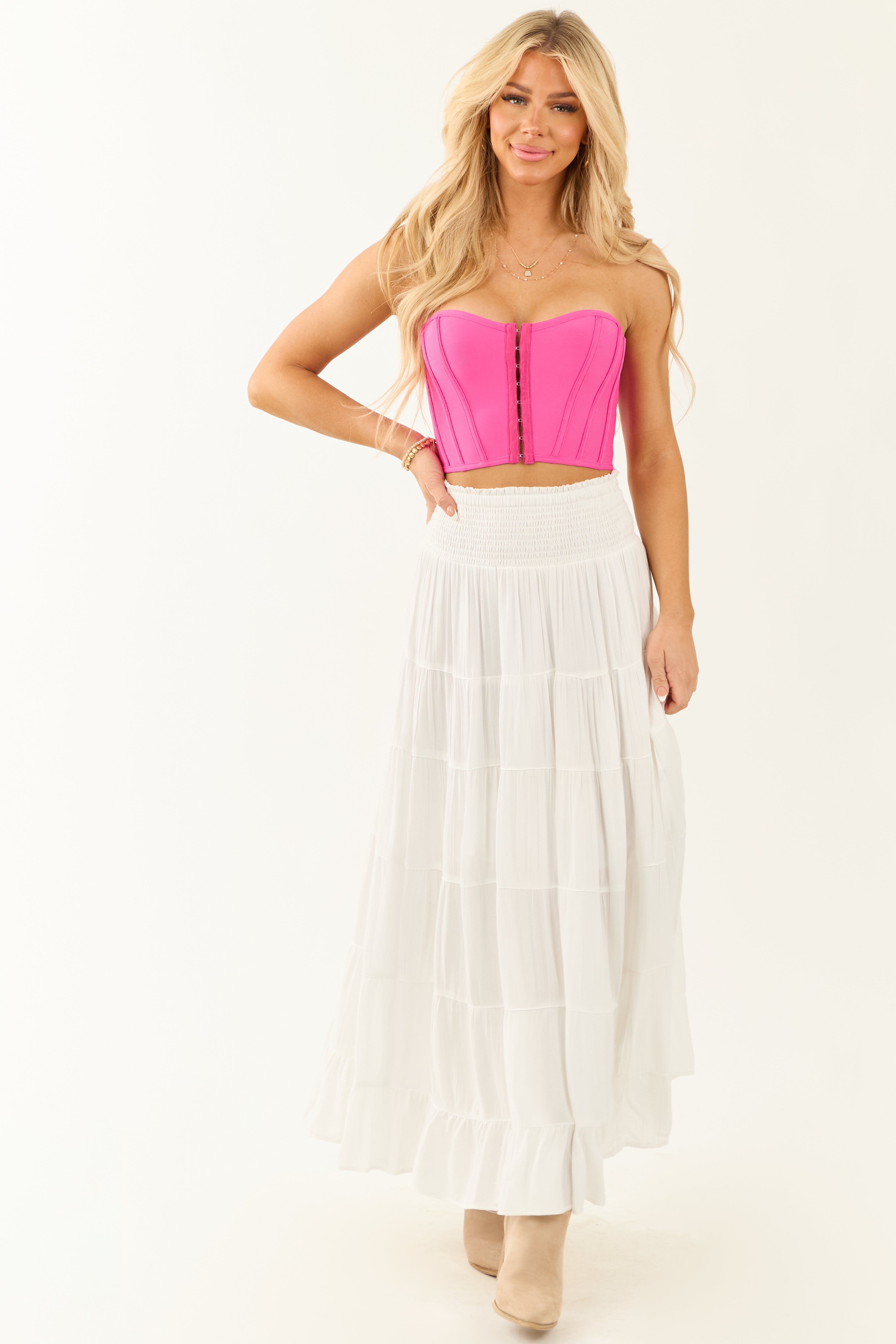 Stay trendy and stylish with our Pink Strapless Corset Tank Top. This top features a sweetheart neckline, elastic bust for a secure fit, front hook and eye closures, boning for structure, and a cropped design. Made with semi-stretchy woven fabric (95% Polyester, 5% Spandex) for comfort. Perfect for any casual or dressy occasions. Machine wash cold, tumble dry low. Available in sizes S, M, L. Model is wearing size Small – Height: 57″, Bust: 34″, Waist: 26″.