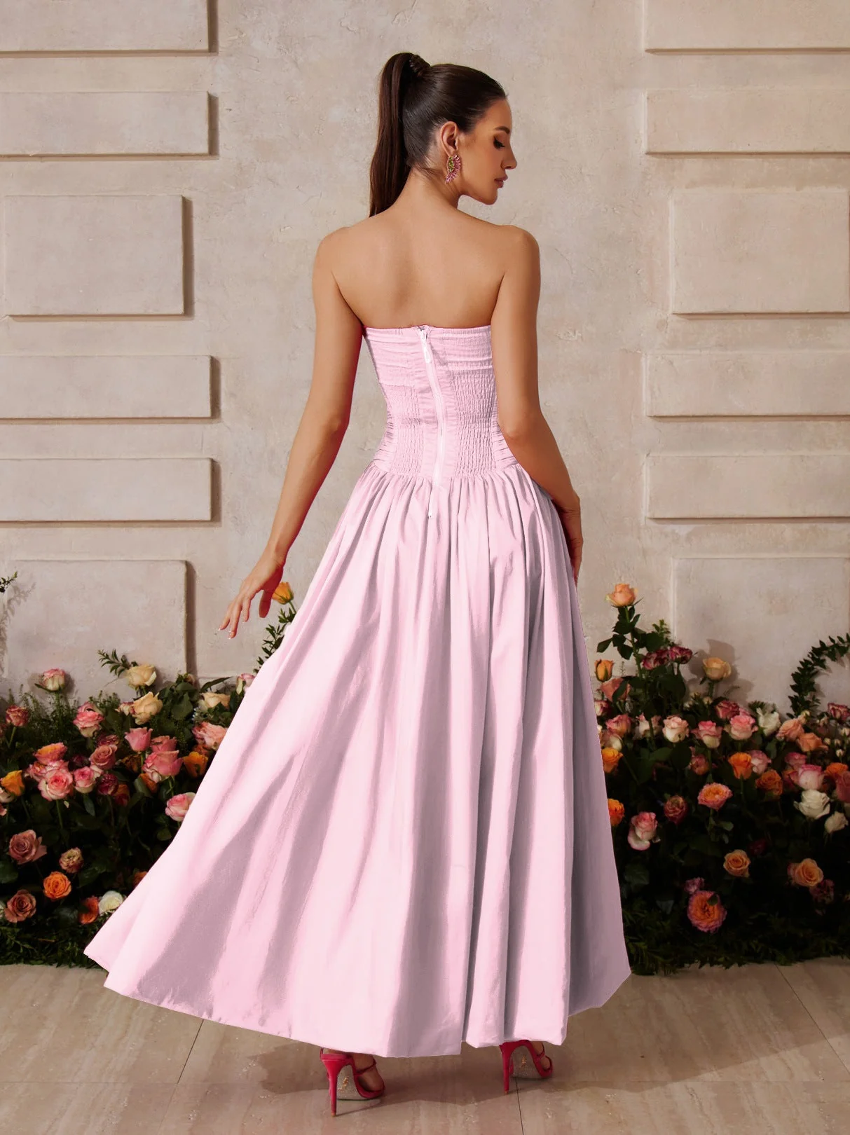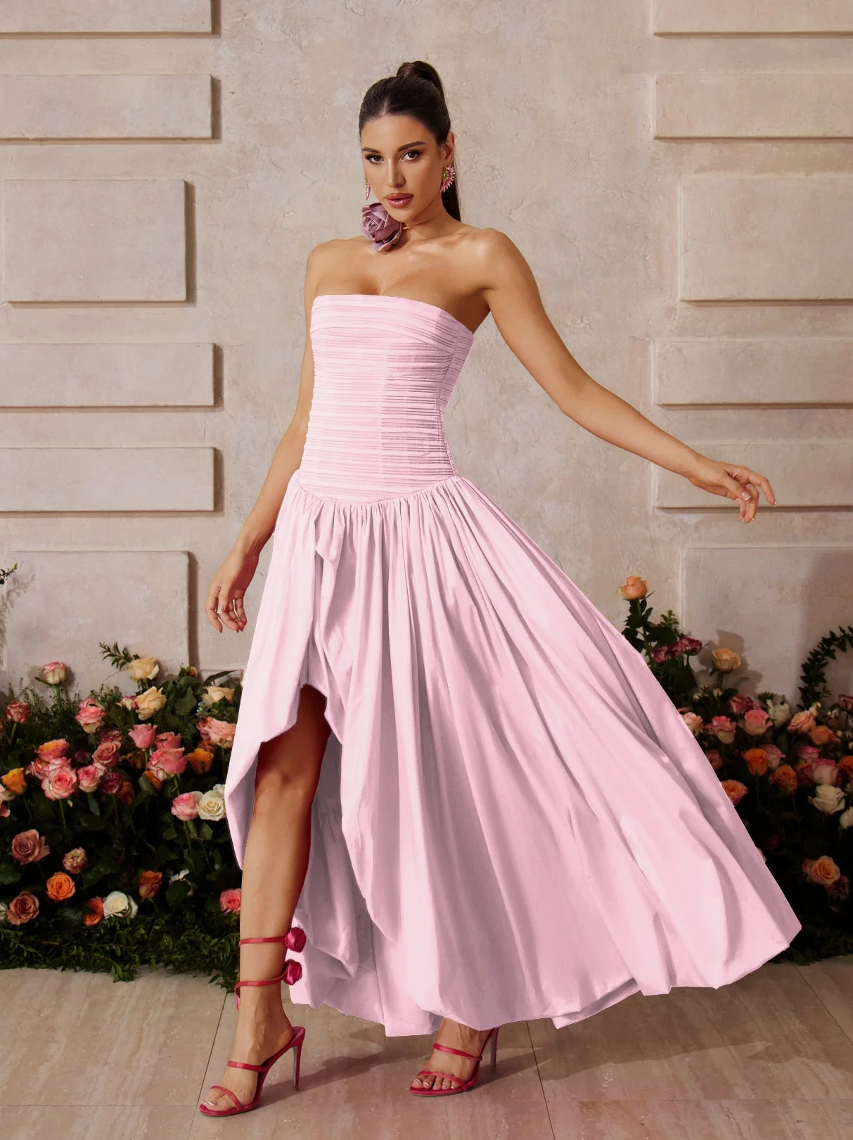Elevate your style with our Pink Strapless Ruched Maxi Dress. The flattering ruched design enhances your silhouette with a chic, modern strapless cut perfect for special occasions. Gracefully flowing to a maxi length, exuding confidence and femininity in stunning pink. Crafted from 100% Polyester with a slight stretch, featuring an invisible zipper at the back. Keep it classy and timeless with this wardrobe essential. Model is wearing size S. Available in sizes S, M, L, XL.