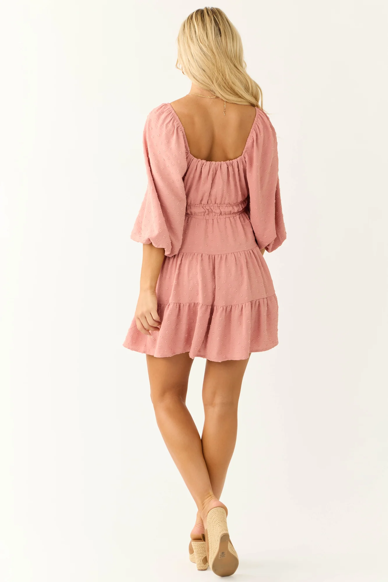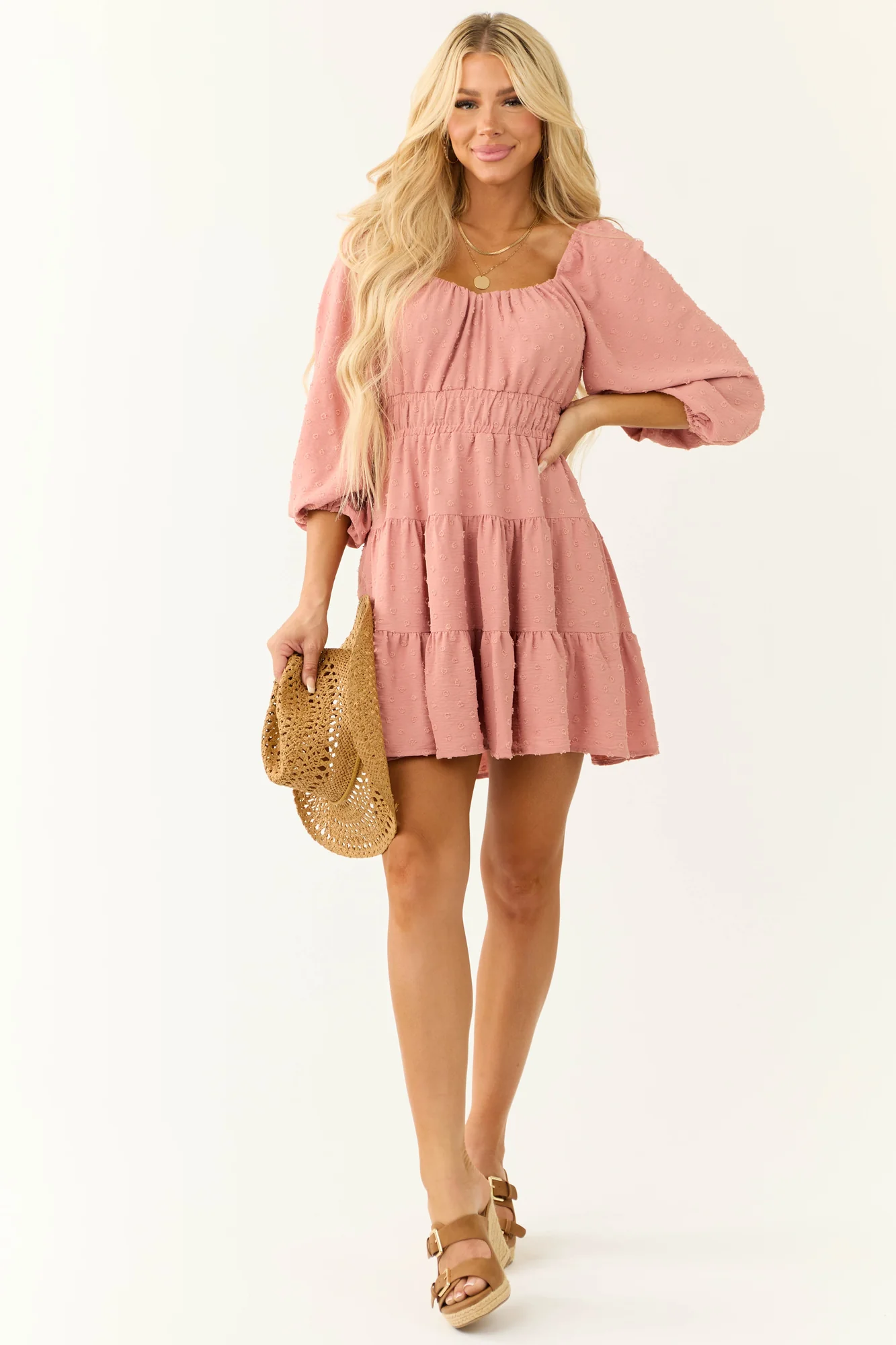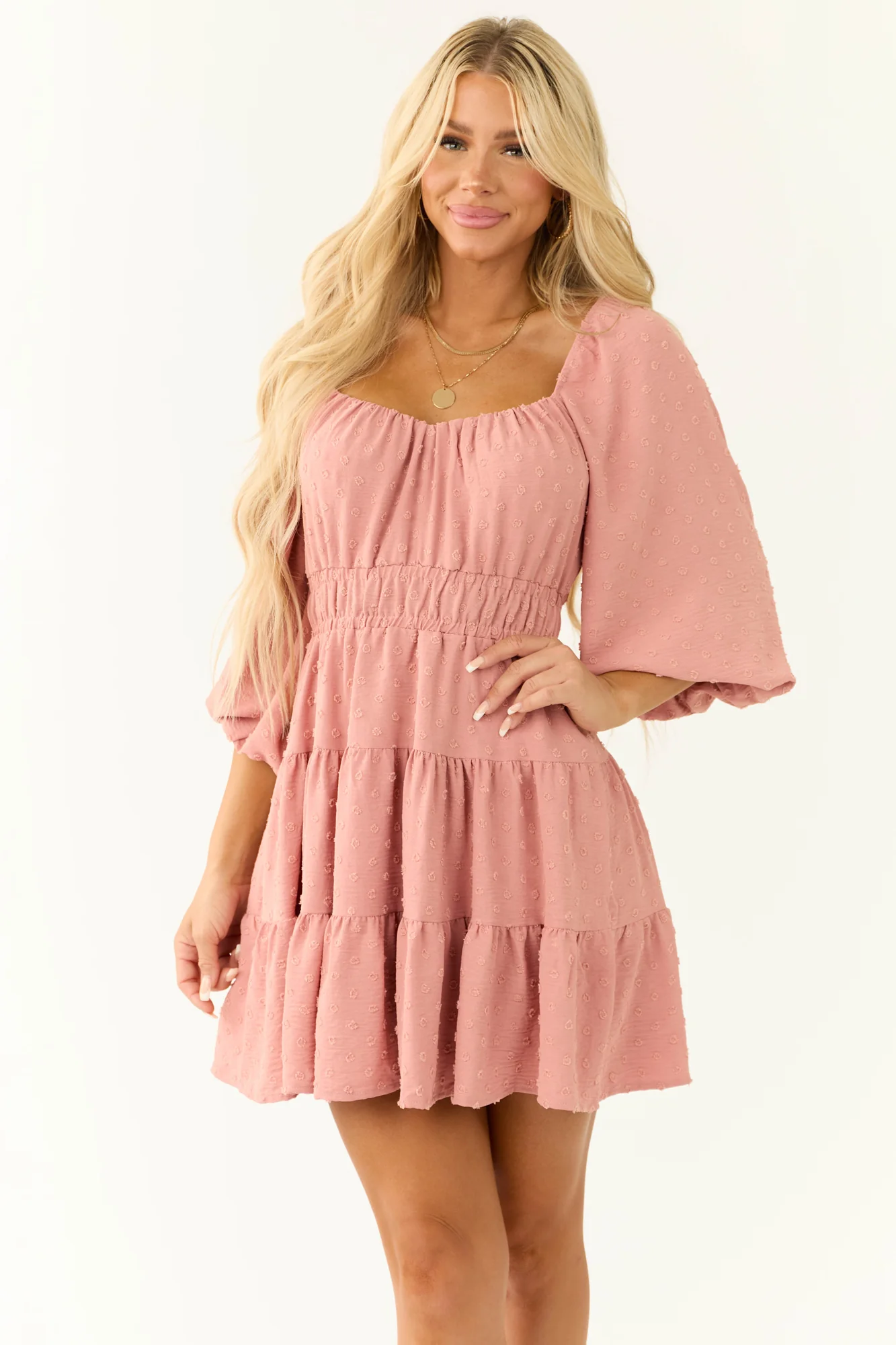 This beautiful Swiss dot mini dress features a tiered design and 3/4 sleeves for a charming look. Made with 100% polyester, it has an elastic neckline and cuffs, a double elastic waistband, and a comfortable fit. Perfect for various occasions, this dress is lined and comes in sizes S, M, and L. Feel confident and stylish in this lovely pink dress that fits true to size. Elevate your wardrobe with this trendy piece & Arrow, proudly made in the USA.
