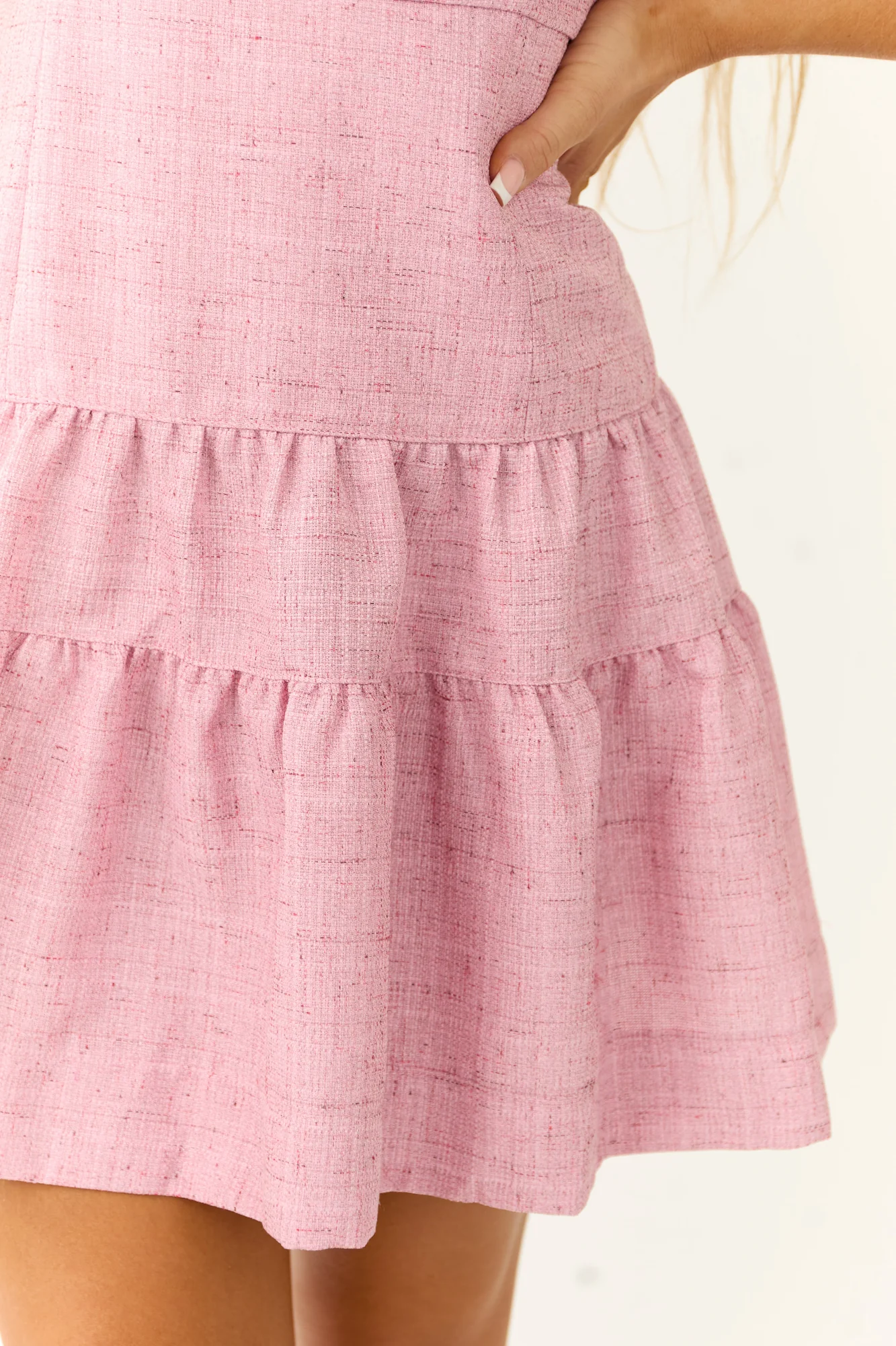 Indulge in the charm of our delicate baby pink tweed tiered sleeveless dress. Available in Small, Medium, and Large sizes with adjustable straps, a tiered ruffle skirt, and a side zipper with hook closure. Expertly lined and crafted from 100% Polyester for comfort and style. Capture attention effortlessly with this timeless piece that fits true to size, making it the perfect choice for any occasion. Channel elegance and grace with a dress designed to impress.