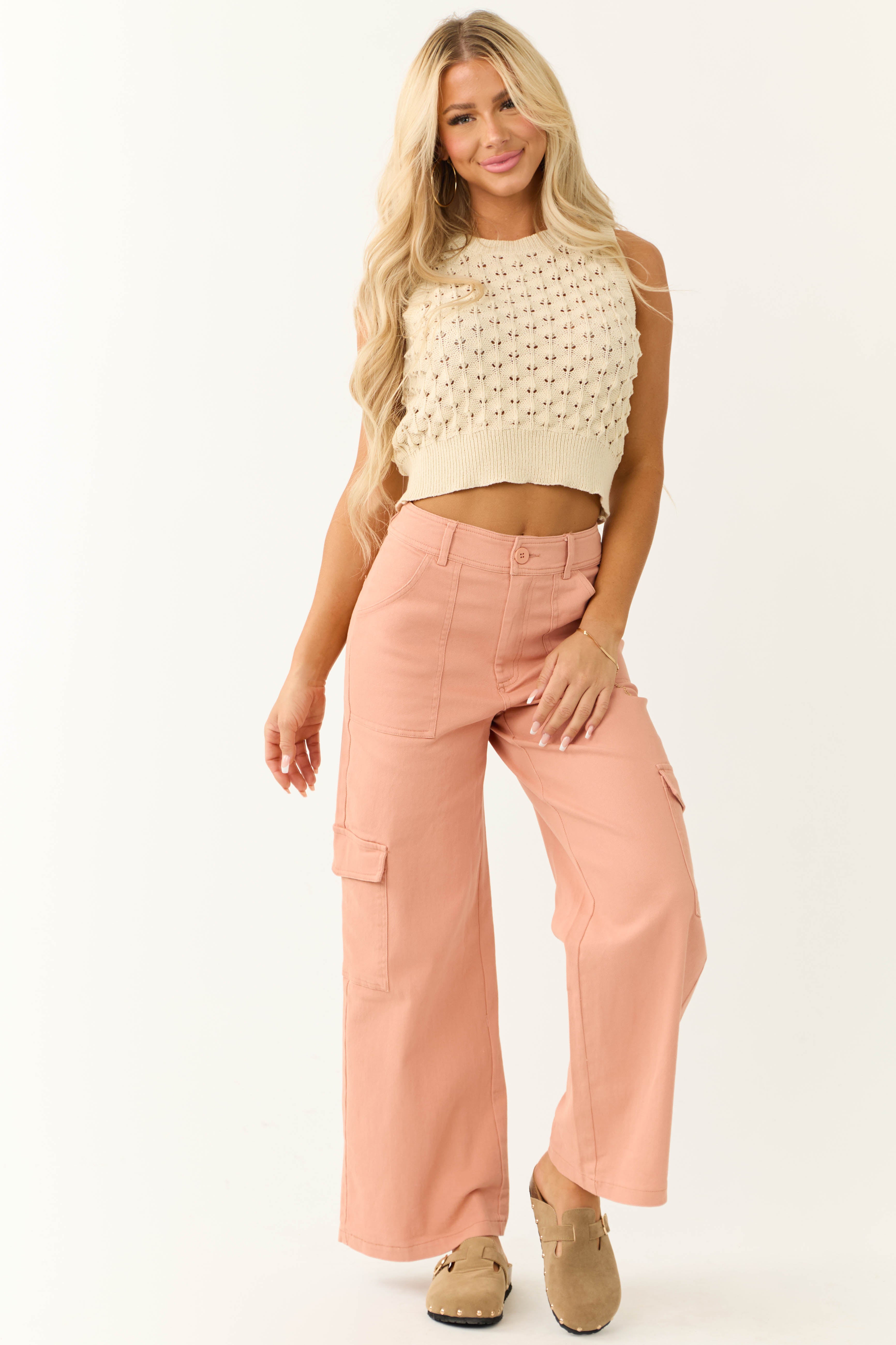 Upgrade your wardrobe with these stylish Pink Twill High Waist Wide Leg Cargo Pants . Available in sizes Small, Medium, and Large, these pants feature a semi-stretchy twill construction with 6 spacious pockets, including convenient side cargo pockets. The waistband fits slightly loose for comfort and is secured with a zipper fly and button closure. Designed with belt loops, these pants have a front rise of 12″ and back rise of 15″. The inseam varies from 29″ to 29.5″, providing a tailored fit. Crafted from 97% Rayon and 3% Spandex, these imported pants are easy to care for: machine wash cold, line dry, and iron warm if necessary. Elevate your casual and daytime looks with these on-trend and versatile cargo pants. Model is wearing a size Small. Model’s Profile: Size 1, Height 57″, Bust 34″, Waist 26″.